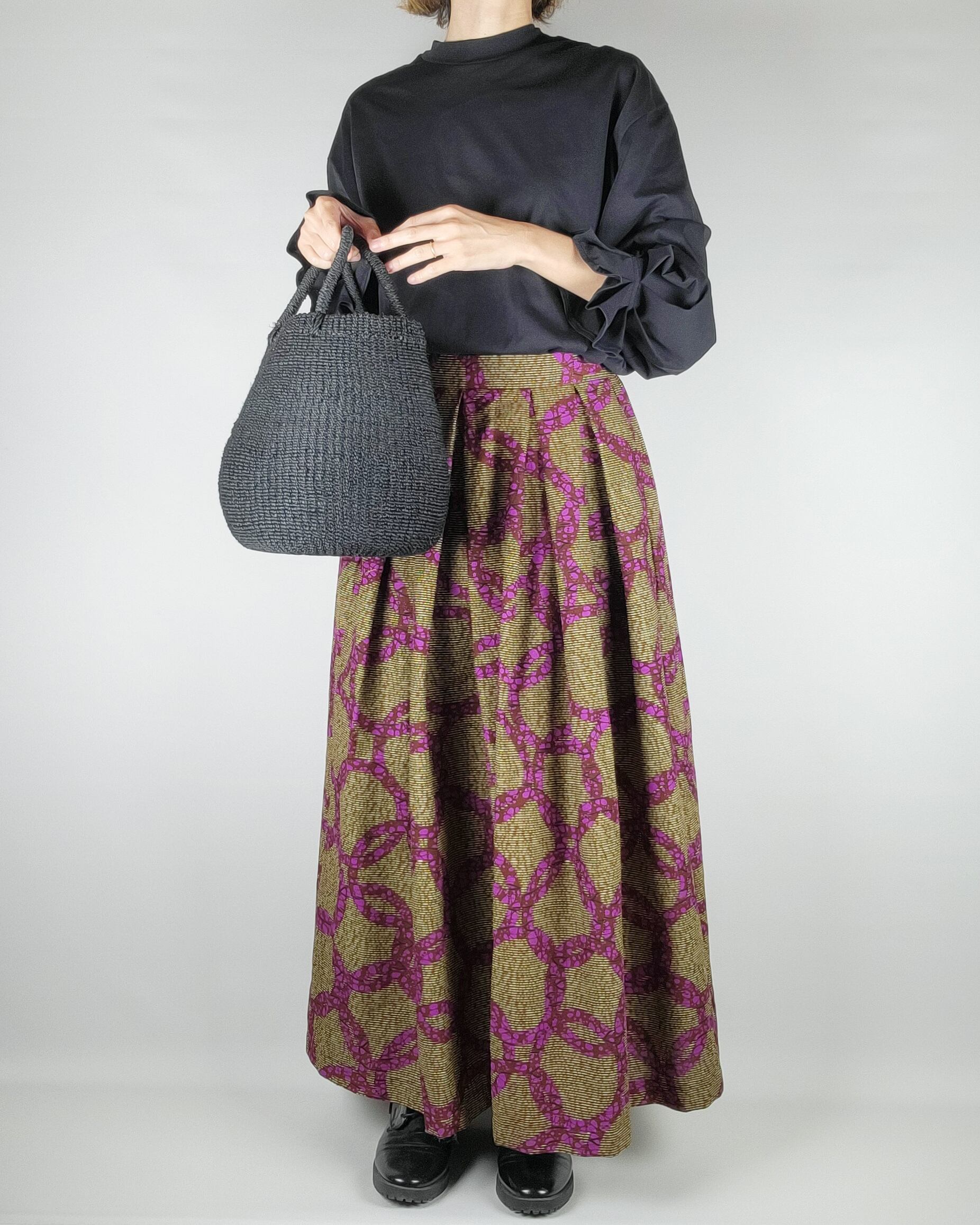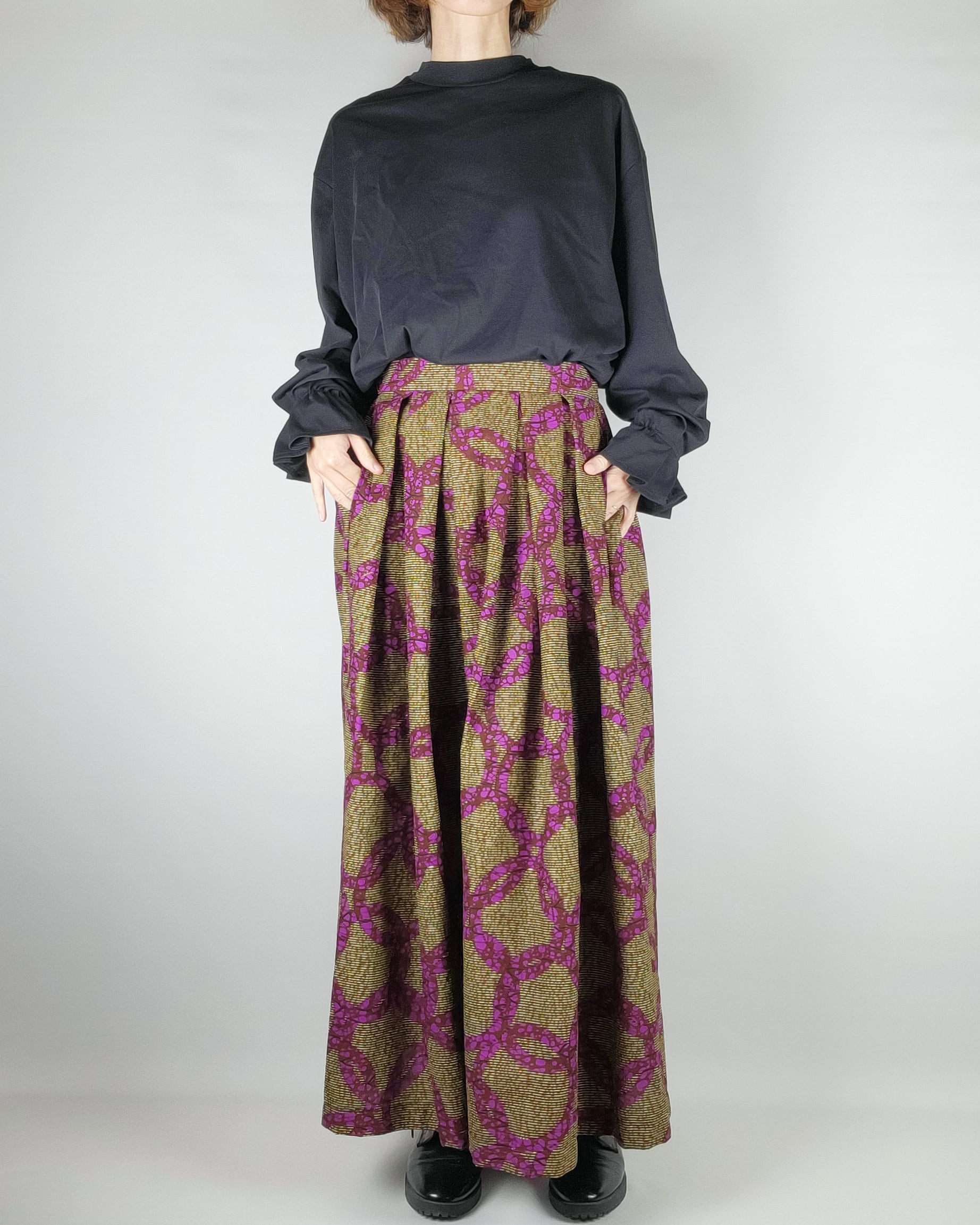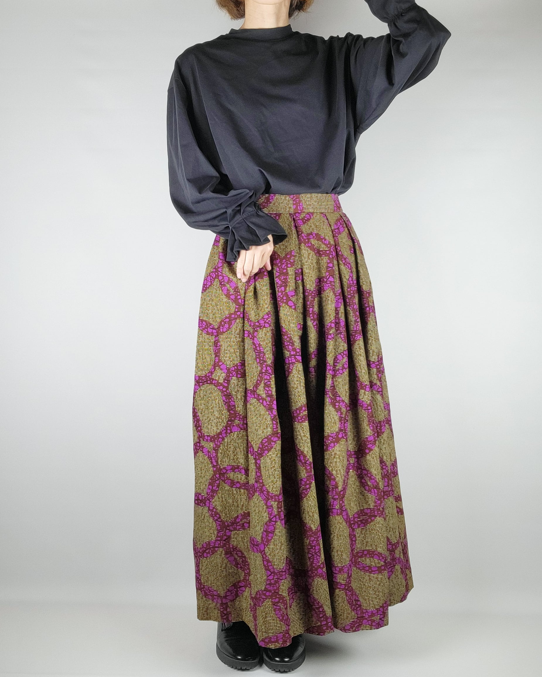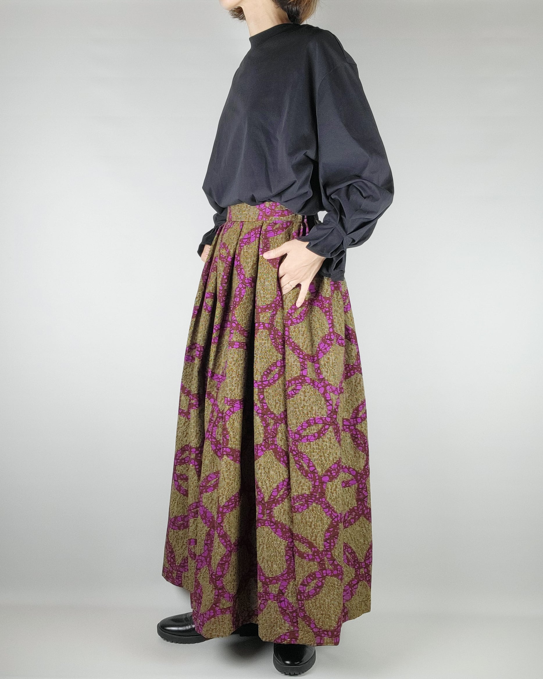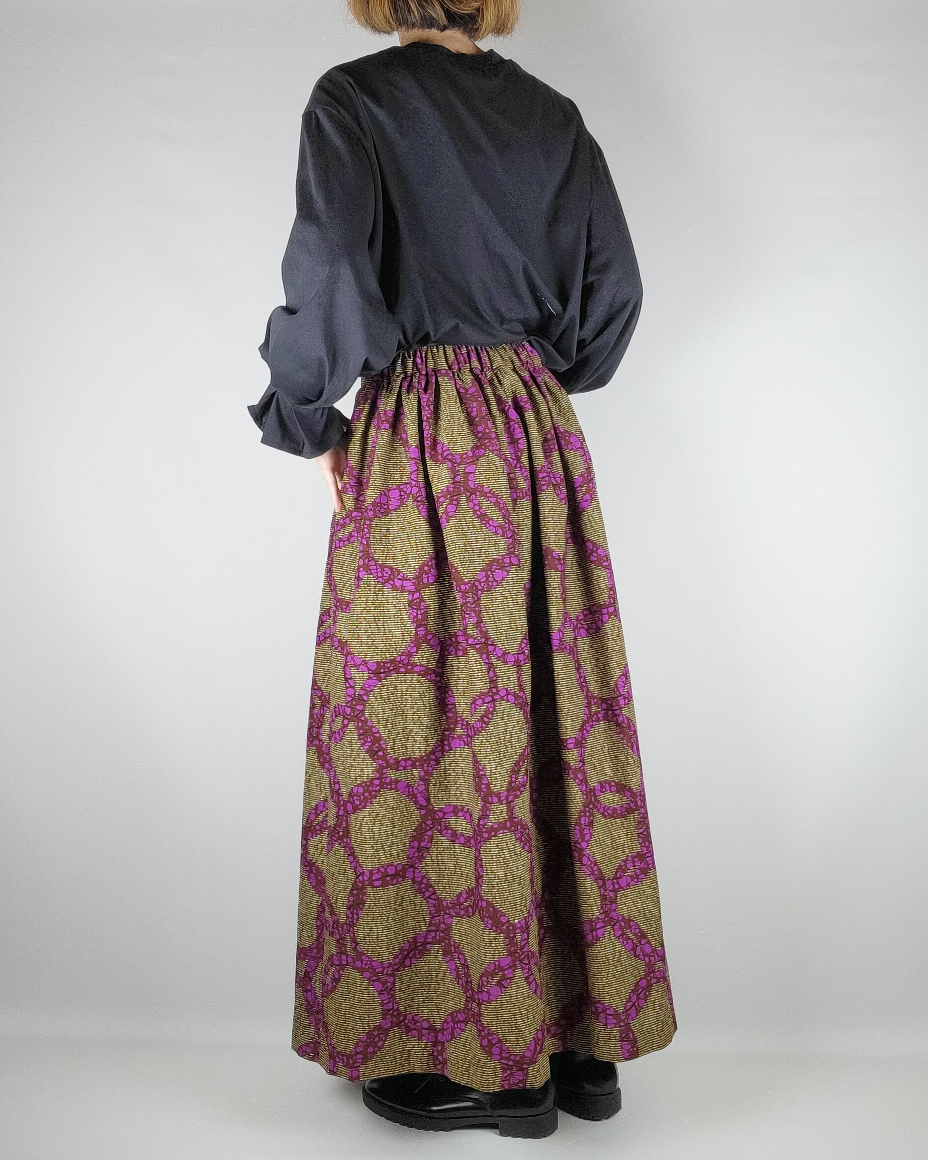 贅沢にアフリカ布を使用したフロントがランダムなタックになっているロングスカートになります。後ろ部分はウエストゴムでギャザースカート使用になっていますのでウエストを締め付けすぎないお仕立てをさせて頂いております。