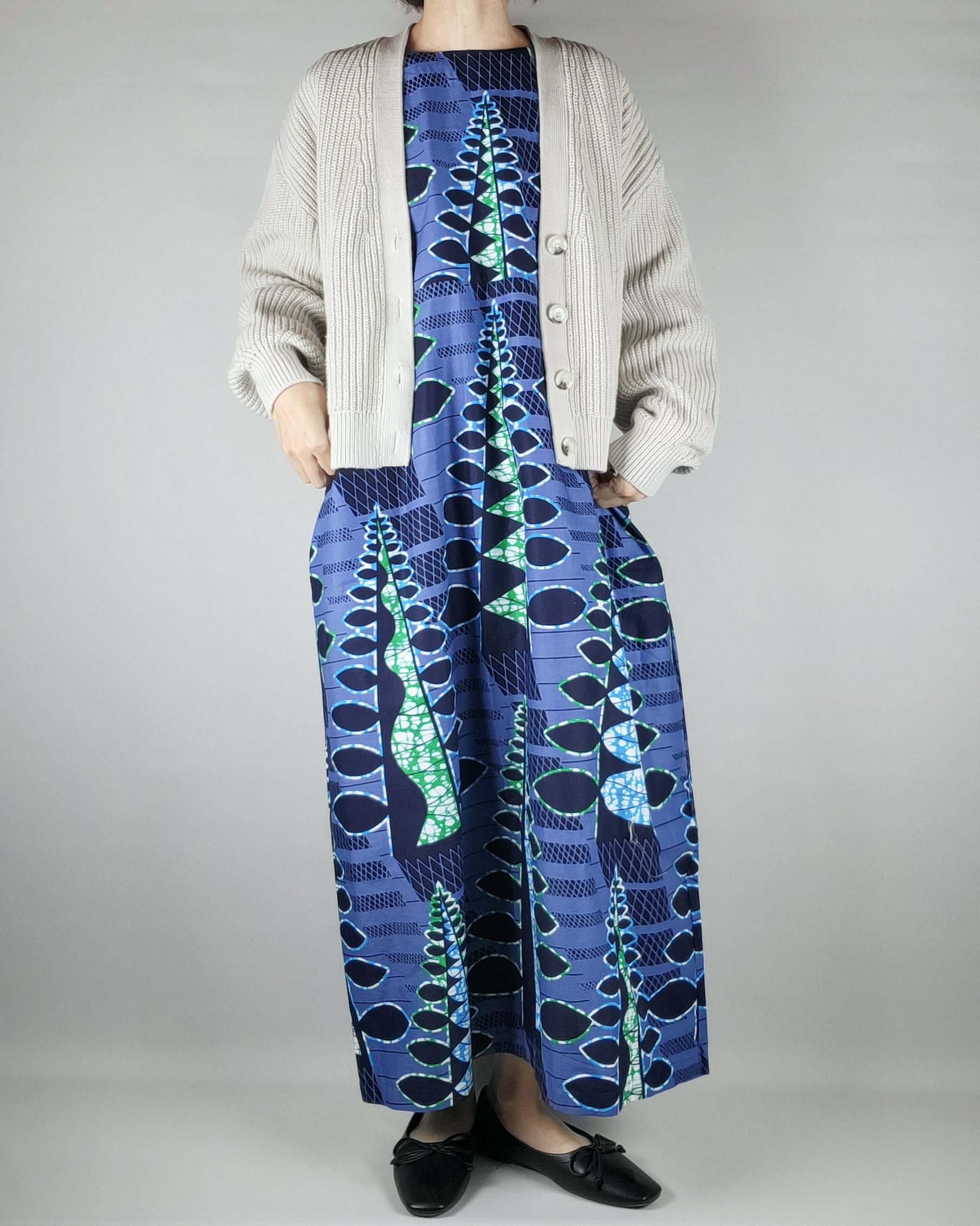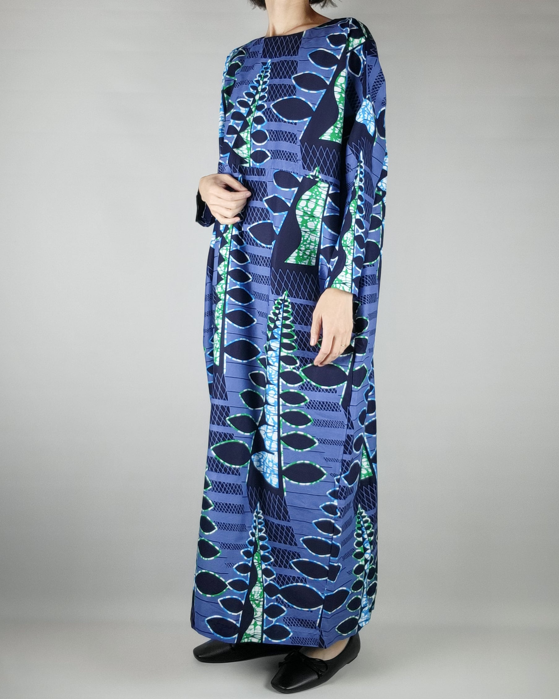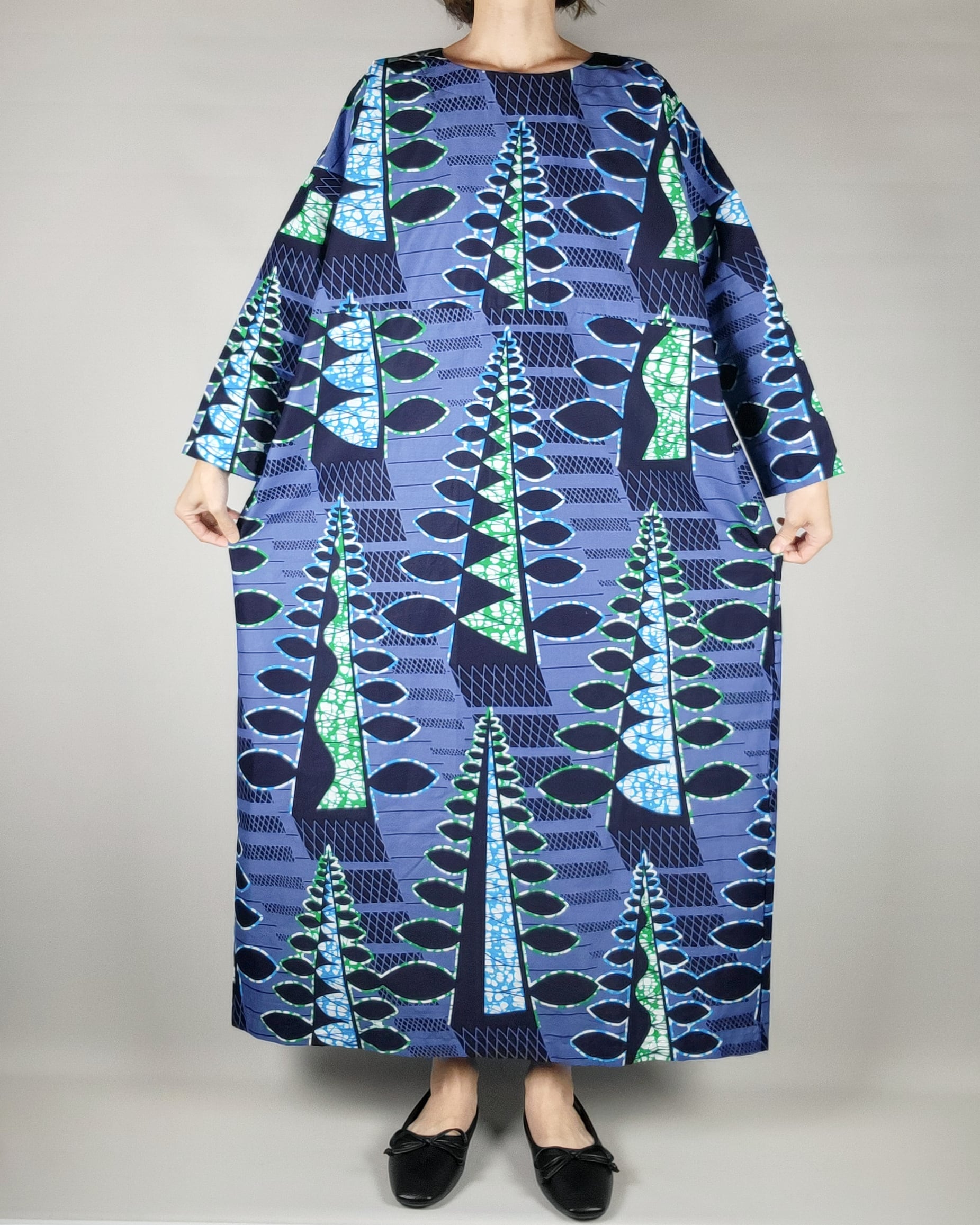 身幅と肩幅がゆったりとしたアフリカ布のロングワンピースになります。