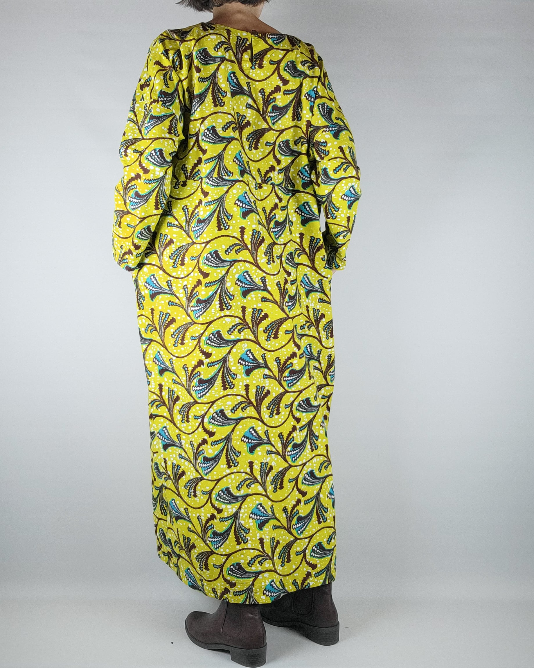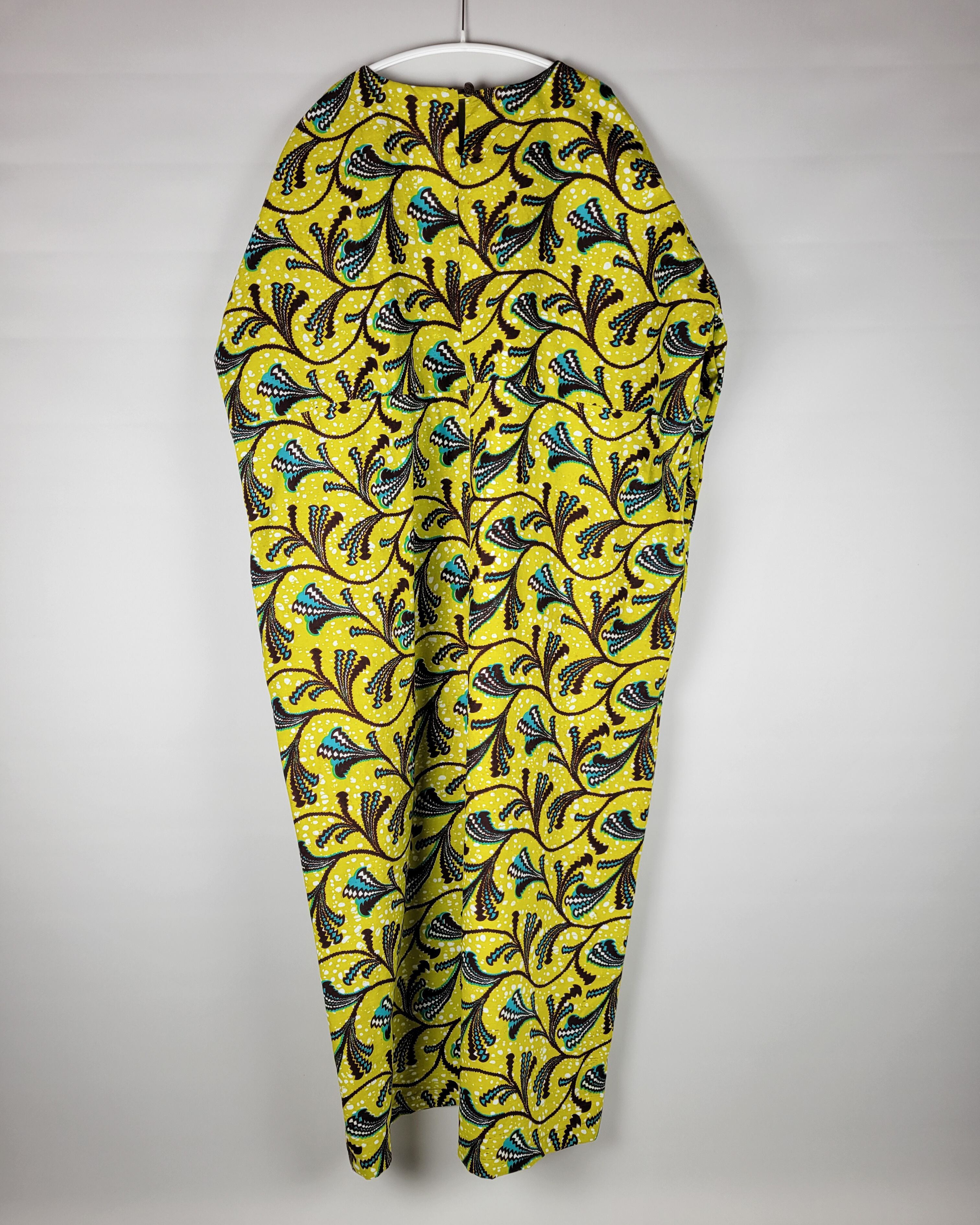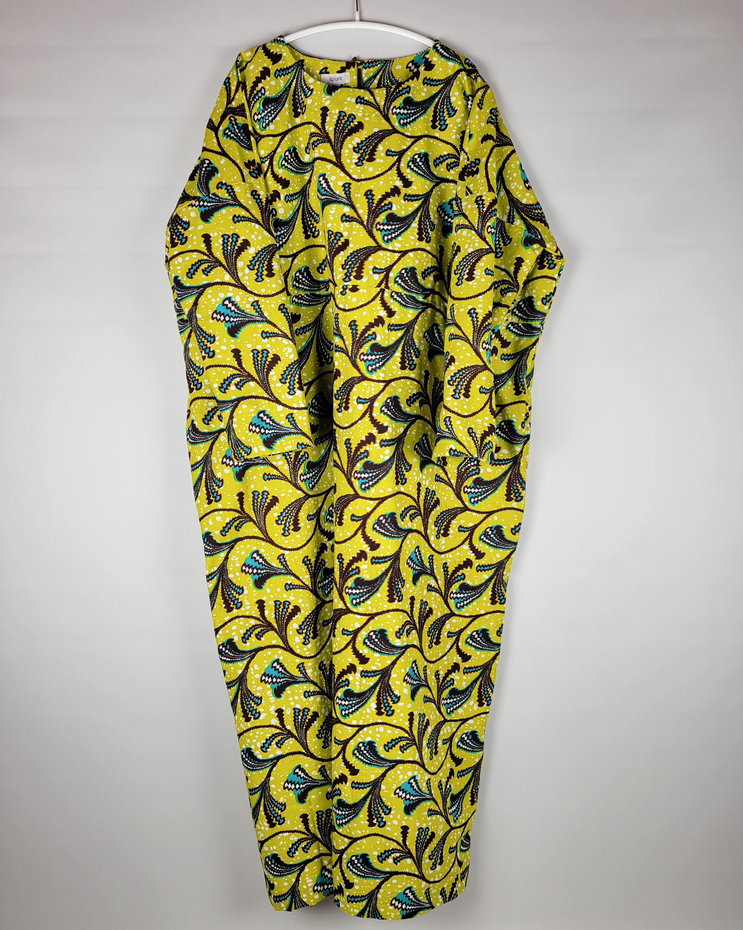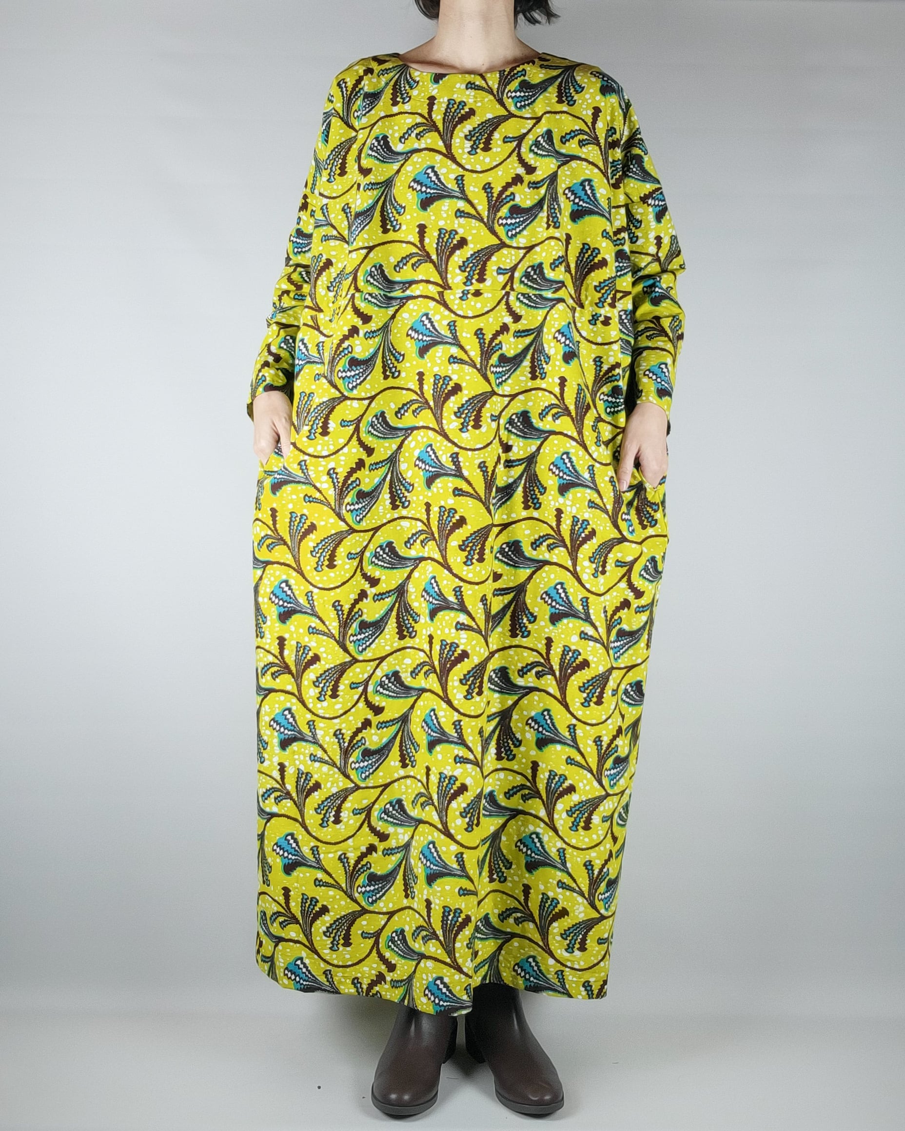 身幅と肩幅がゆったりとしたアフリカ布のロングワンピースになります。