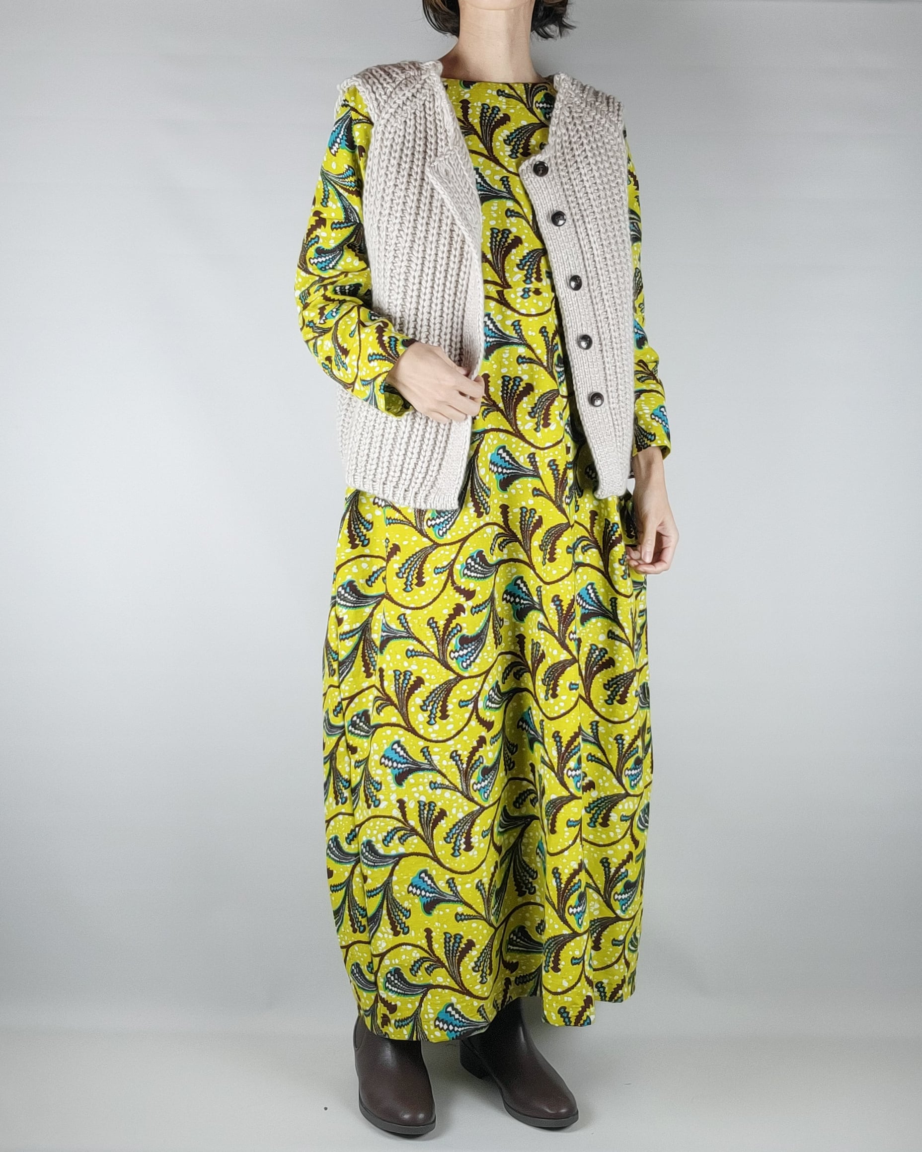 ゆったりワイドなロングワンピース yellow green leaf