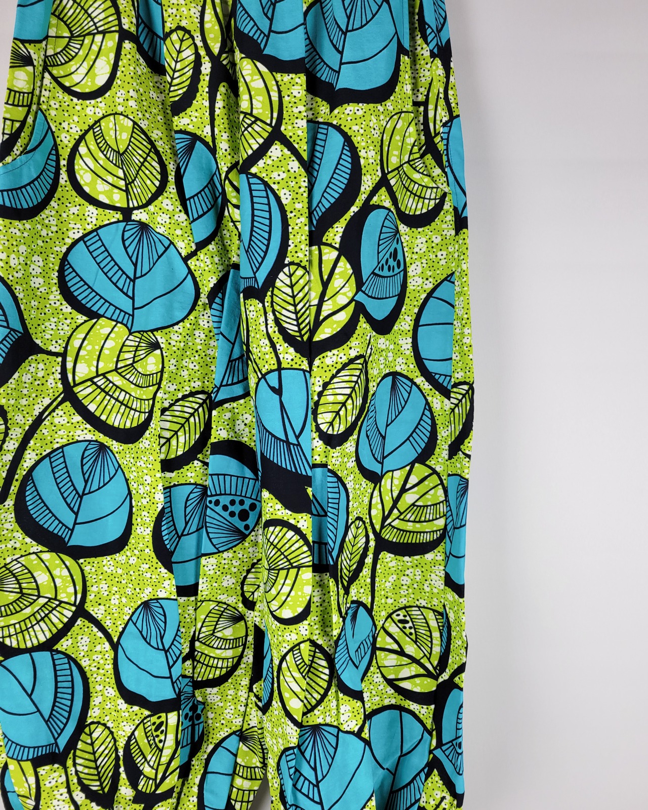 アフリカ布の裾絞りのパンツになります。くるぶしが締まりにくいよう足首で止まるようお仕立てしております。