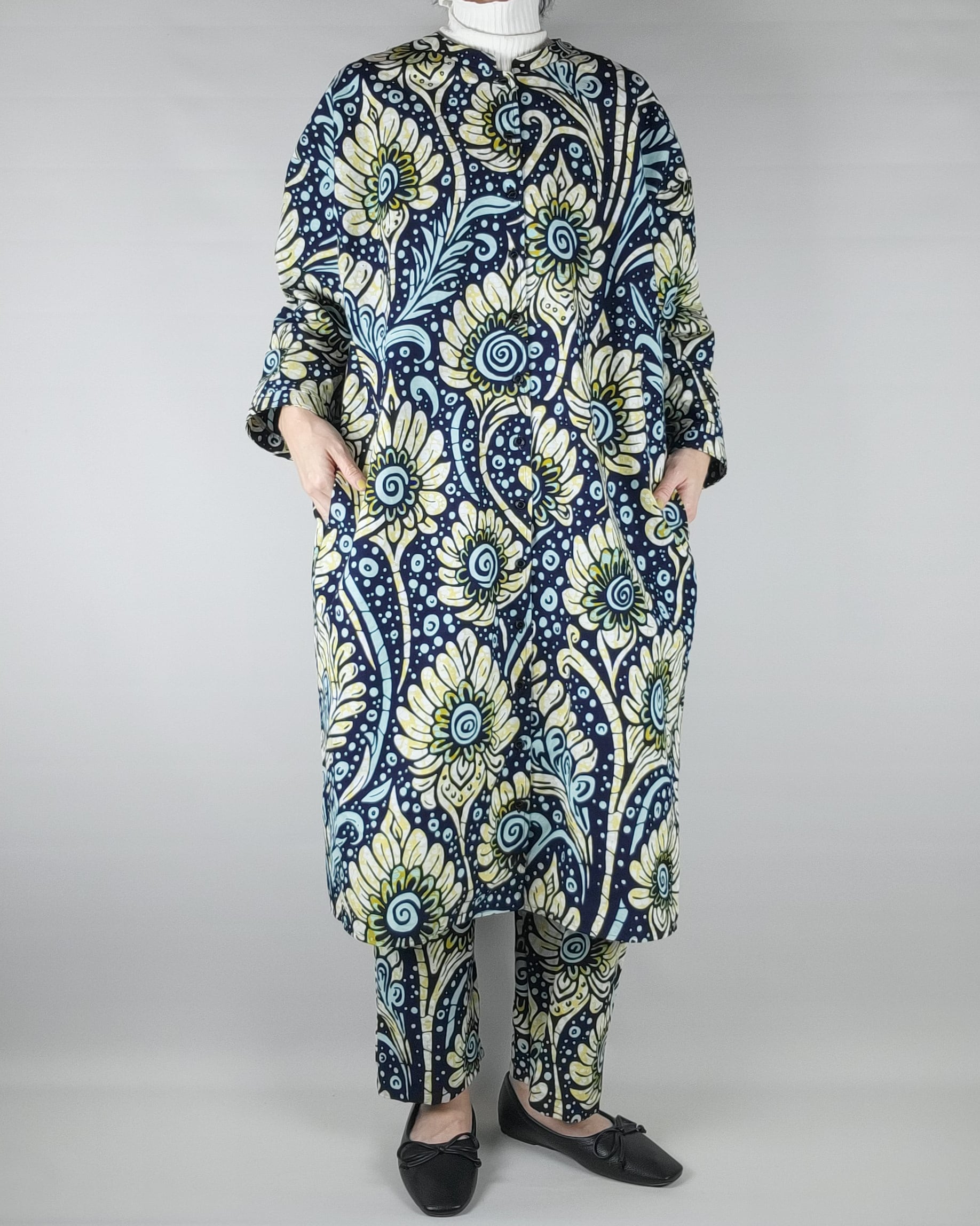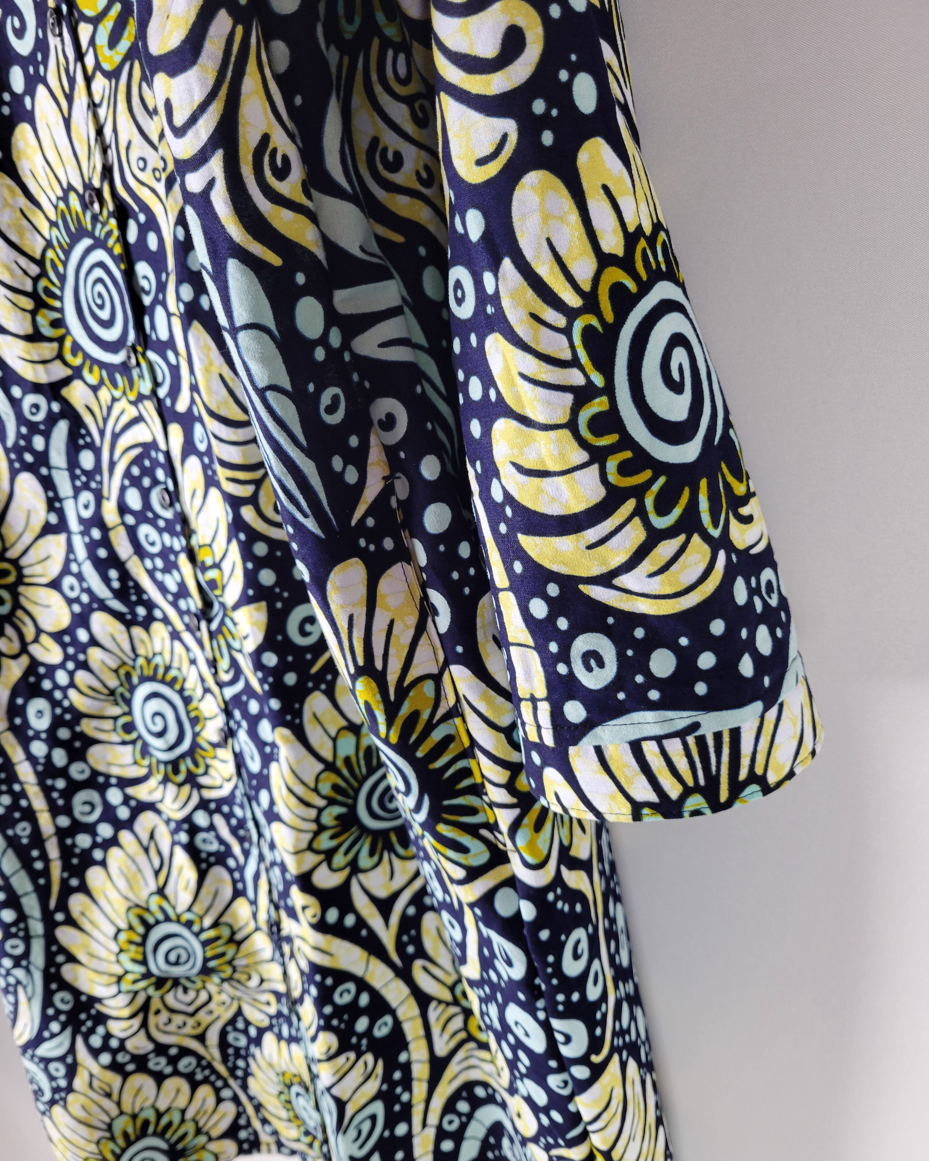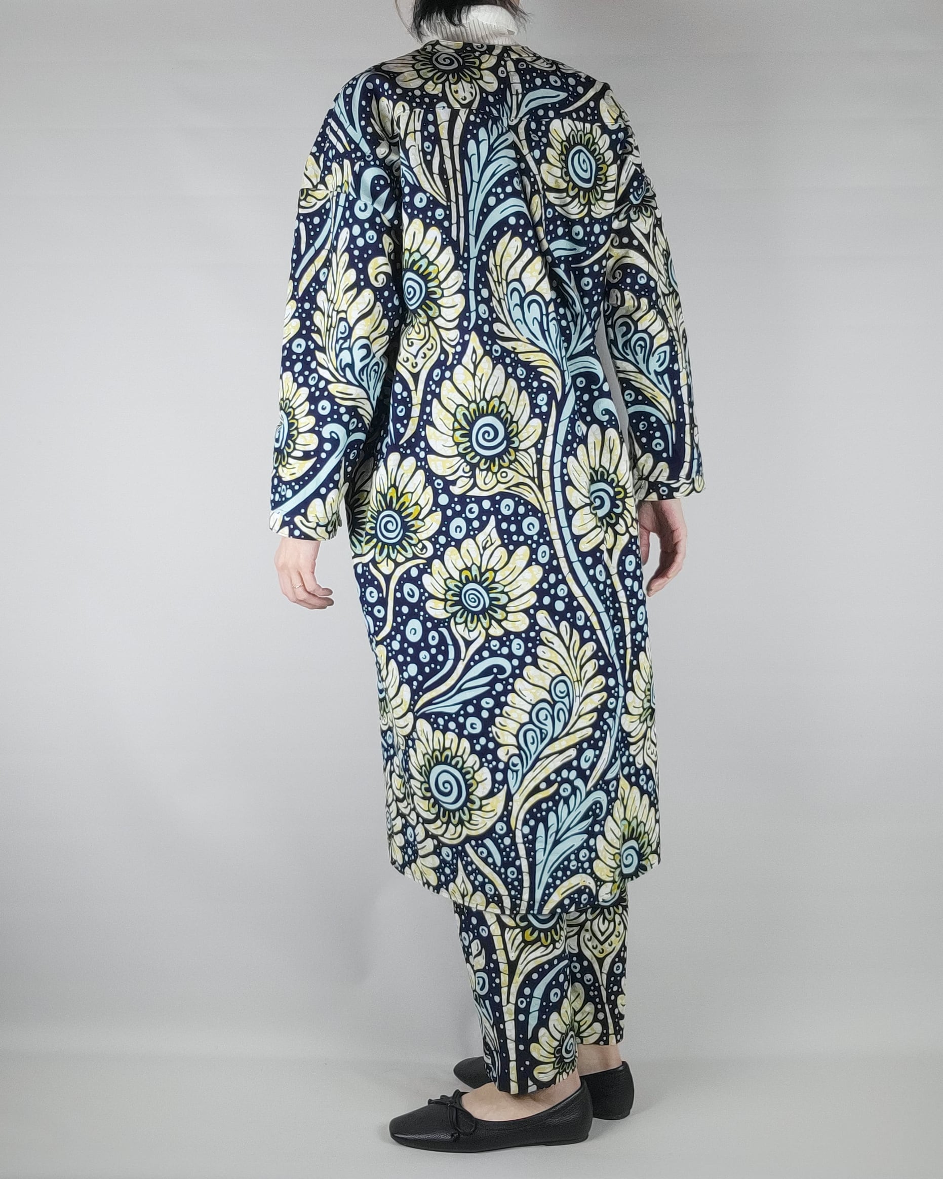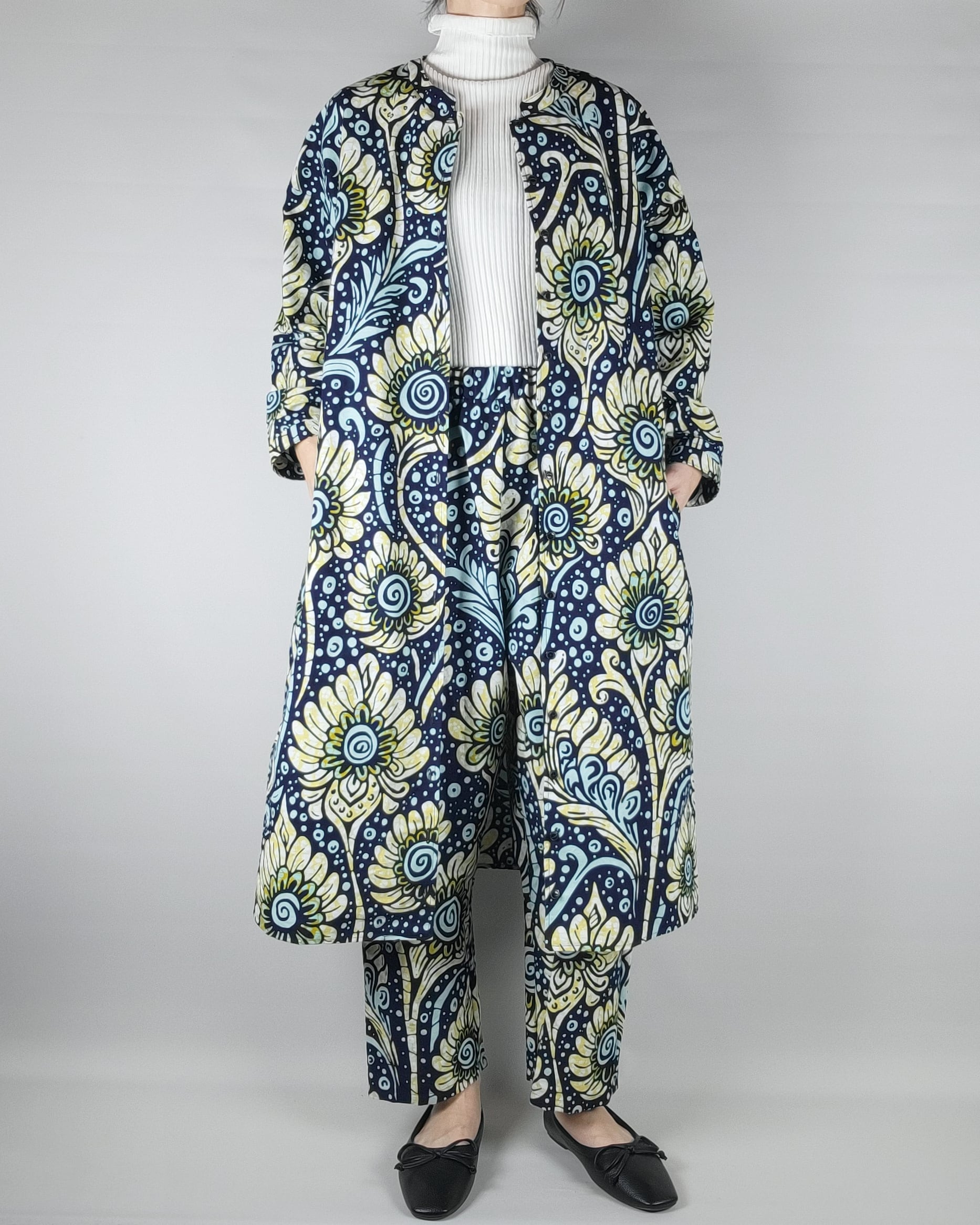 アフリカ布で仕立てたフロントオープンのワンピースになります。