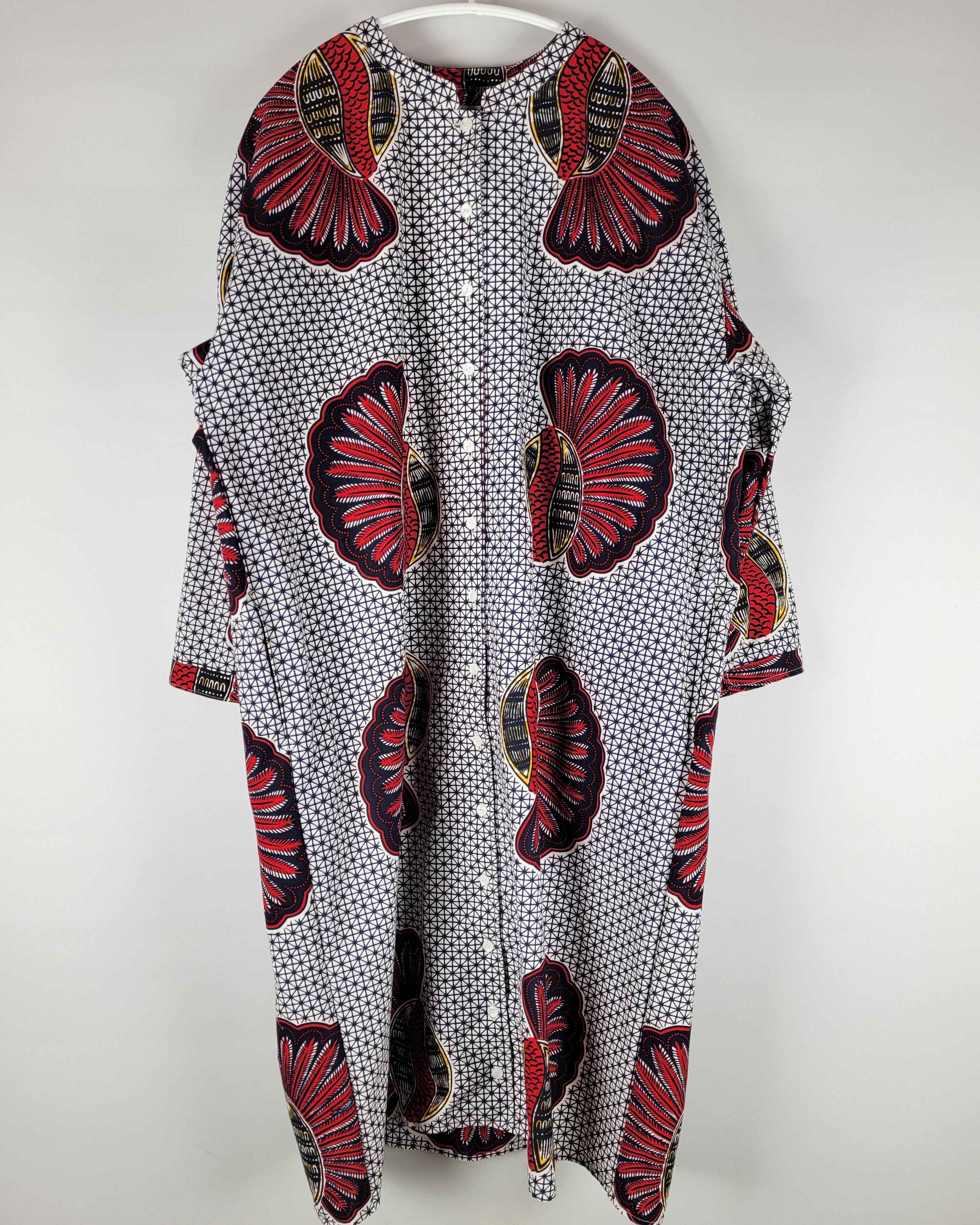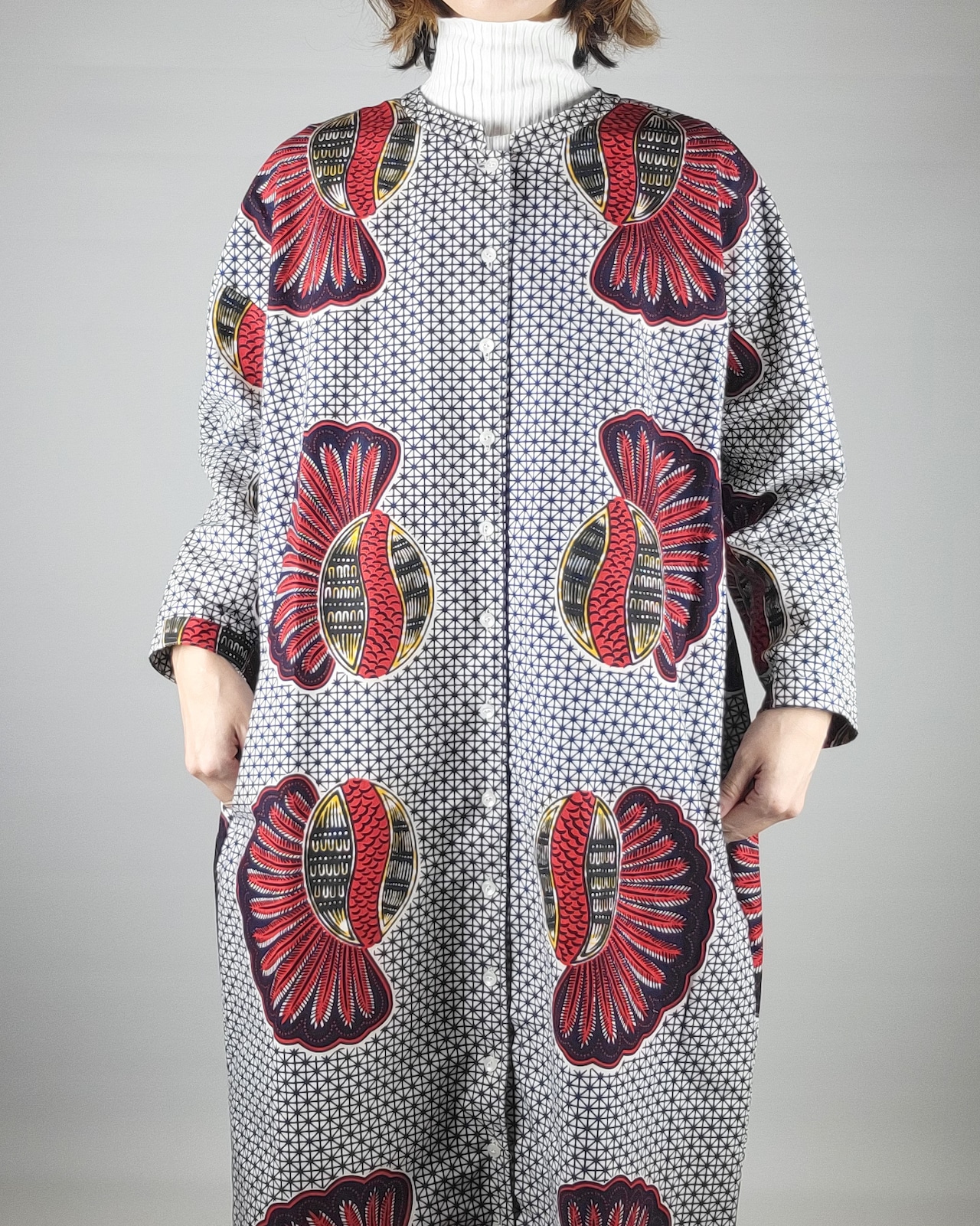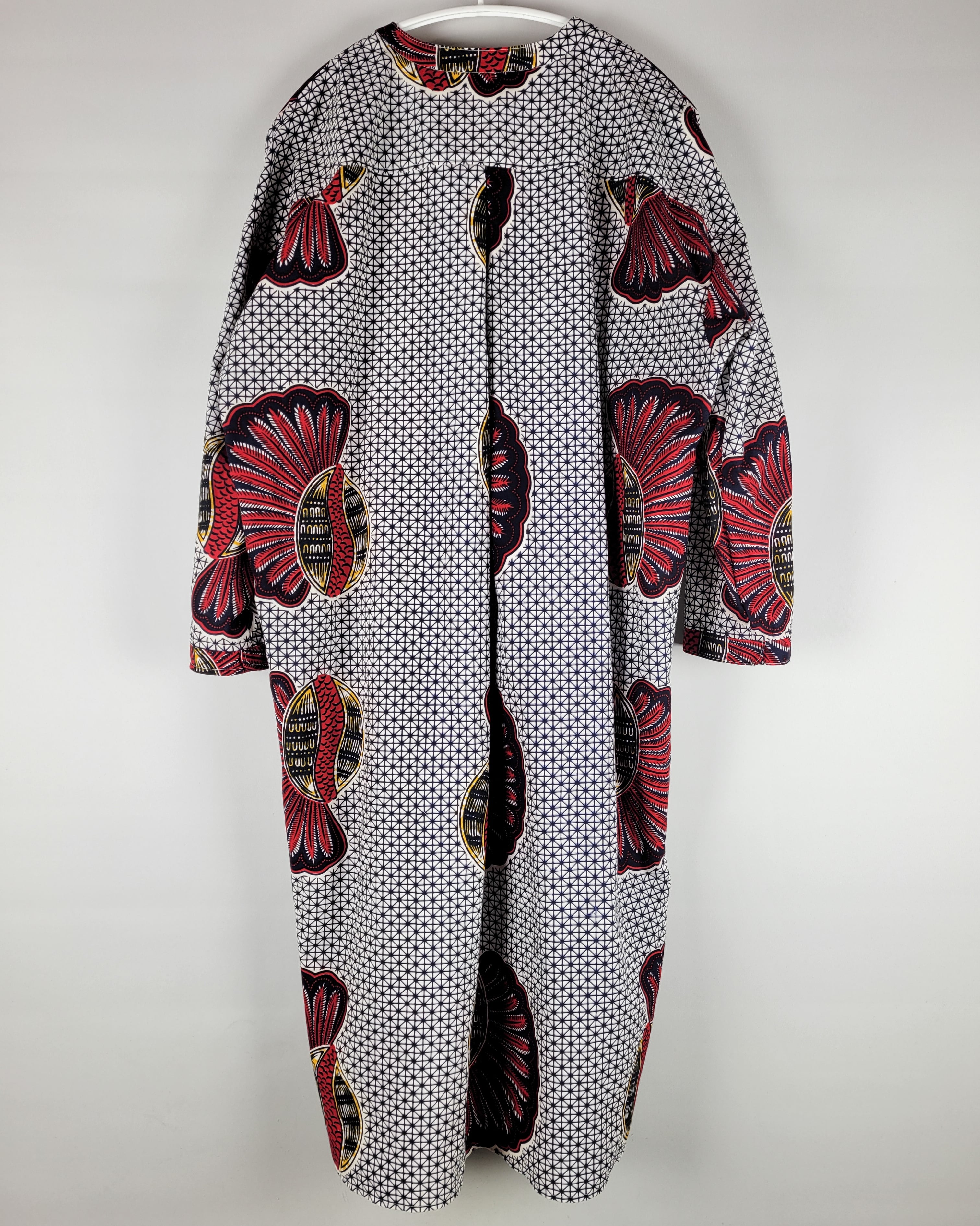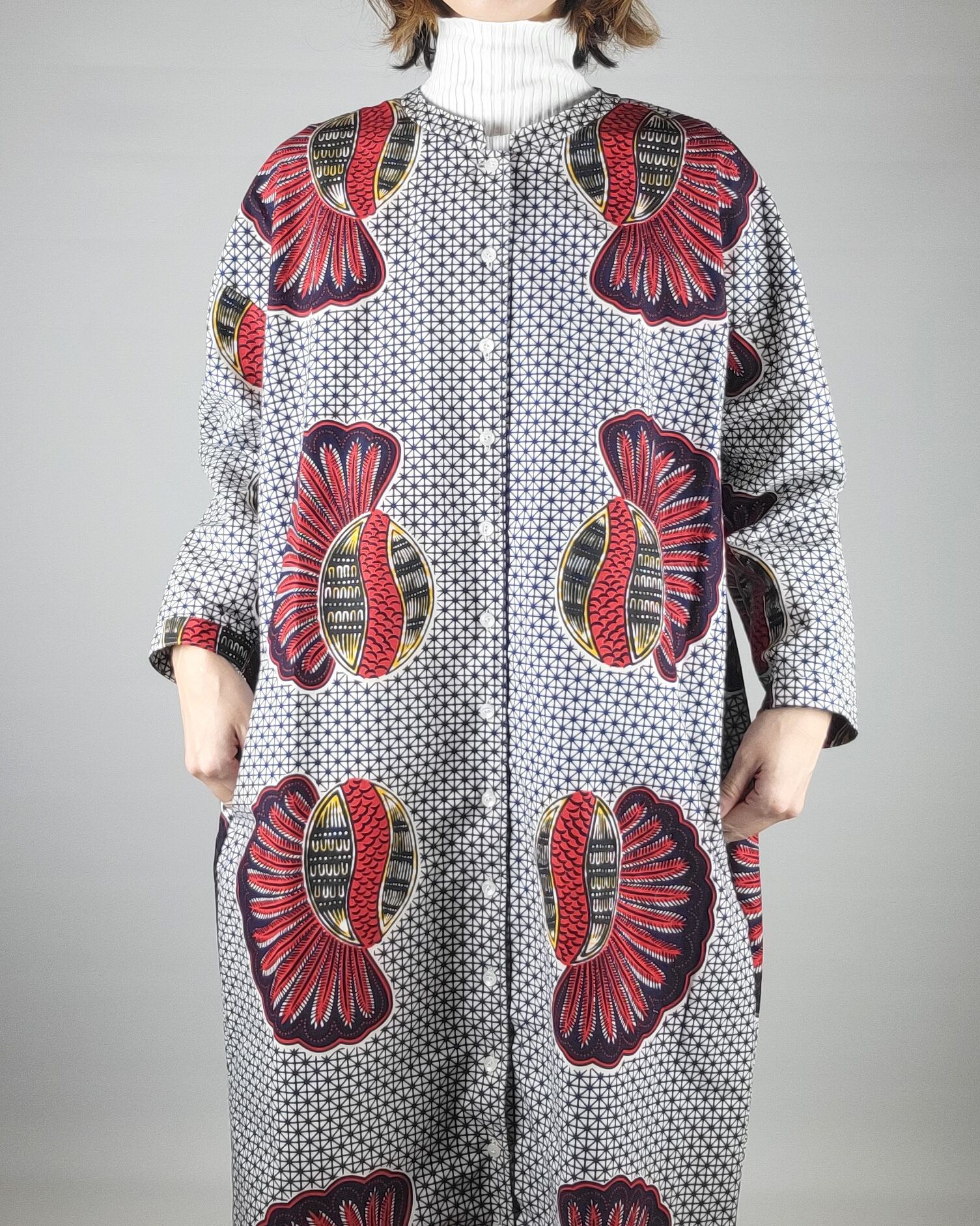アフリカ布で仕立てたフロントオープンのワンピースになります。