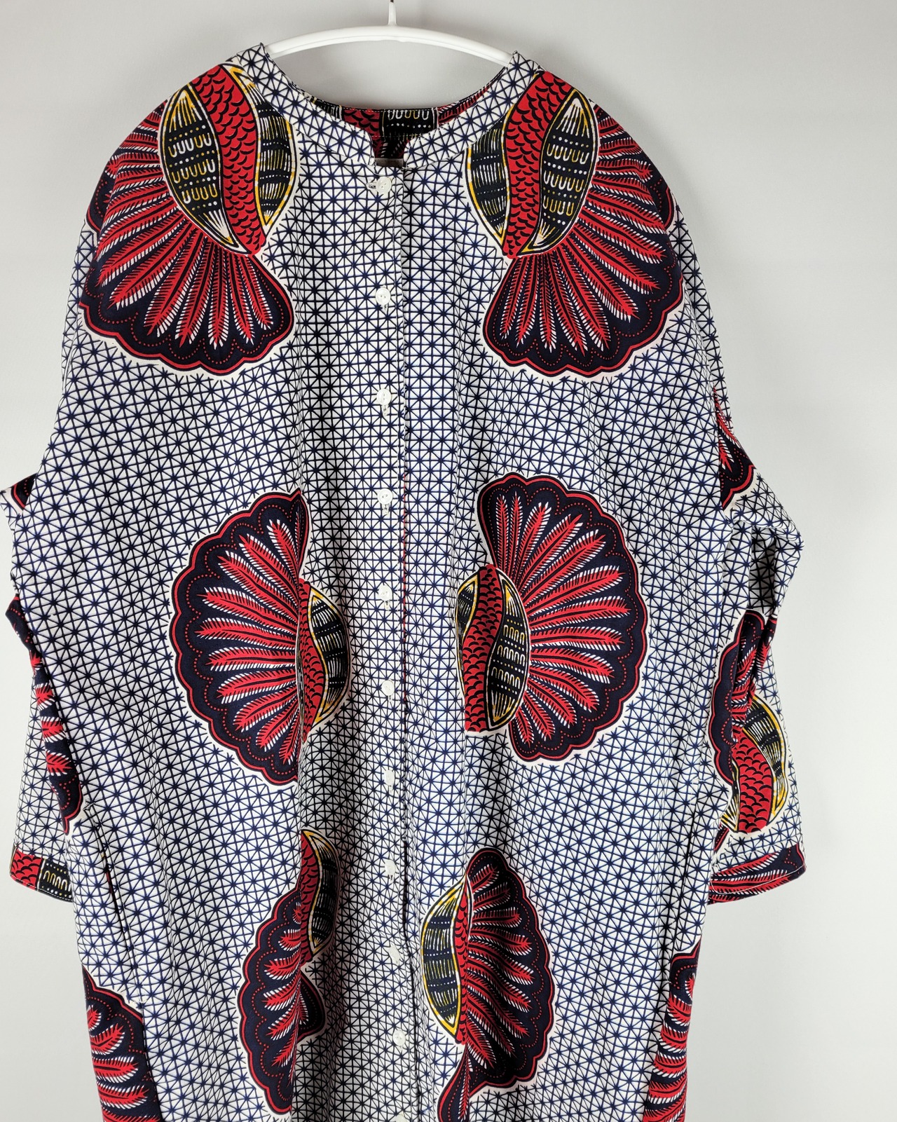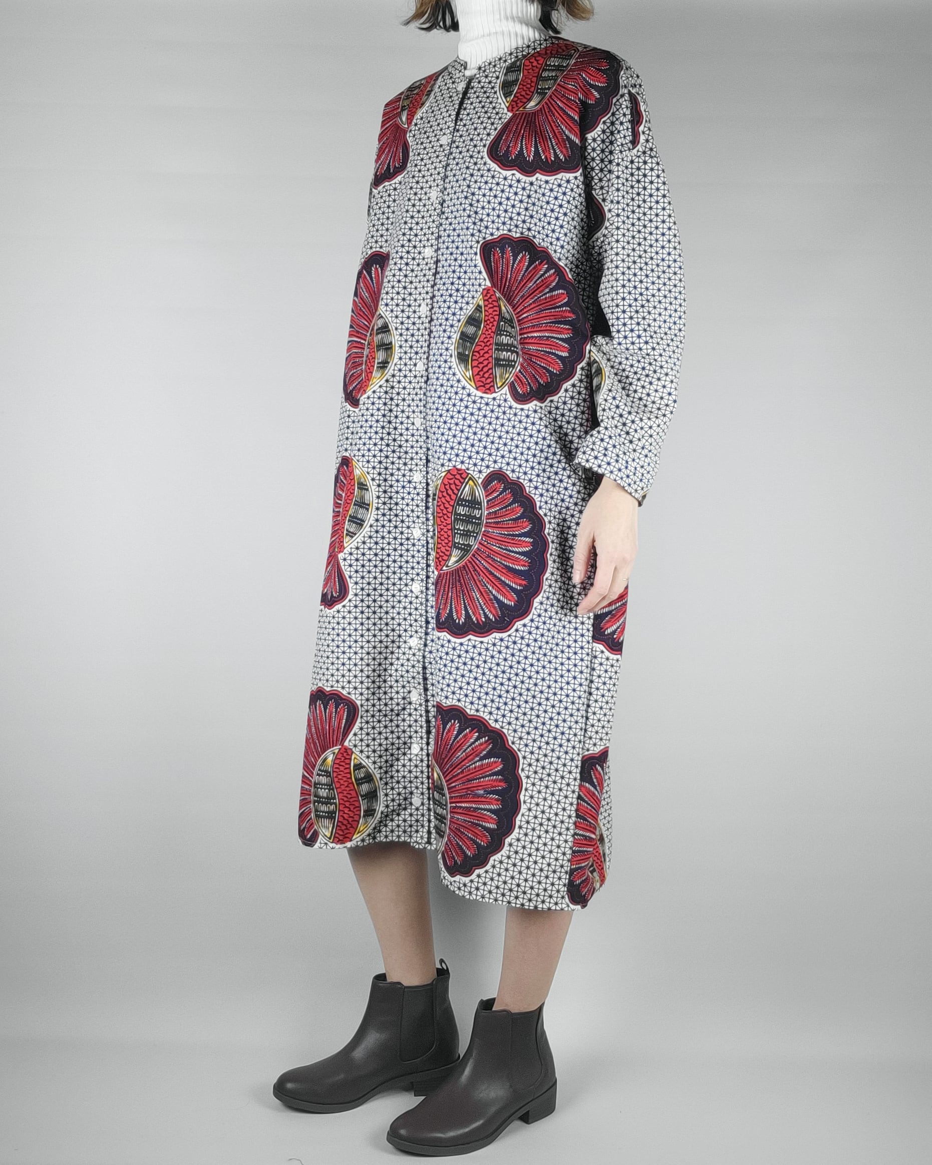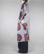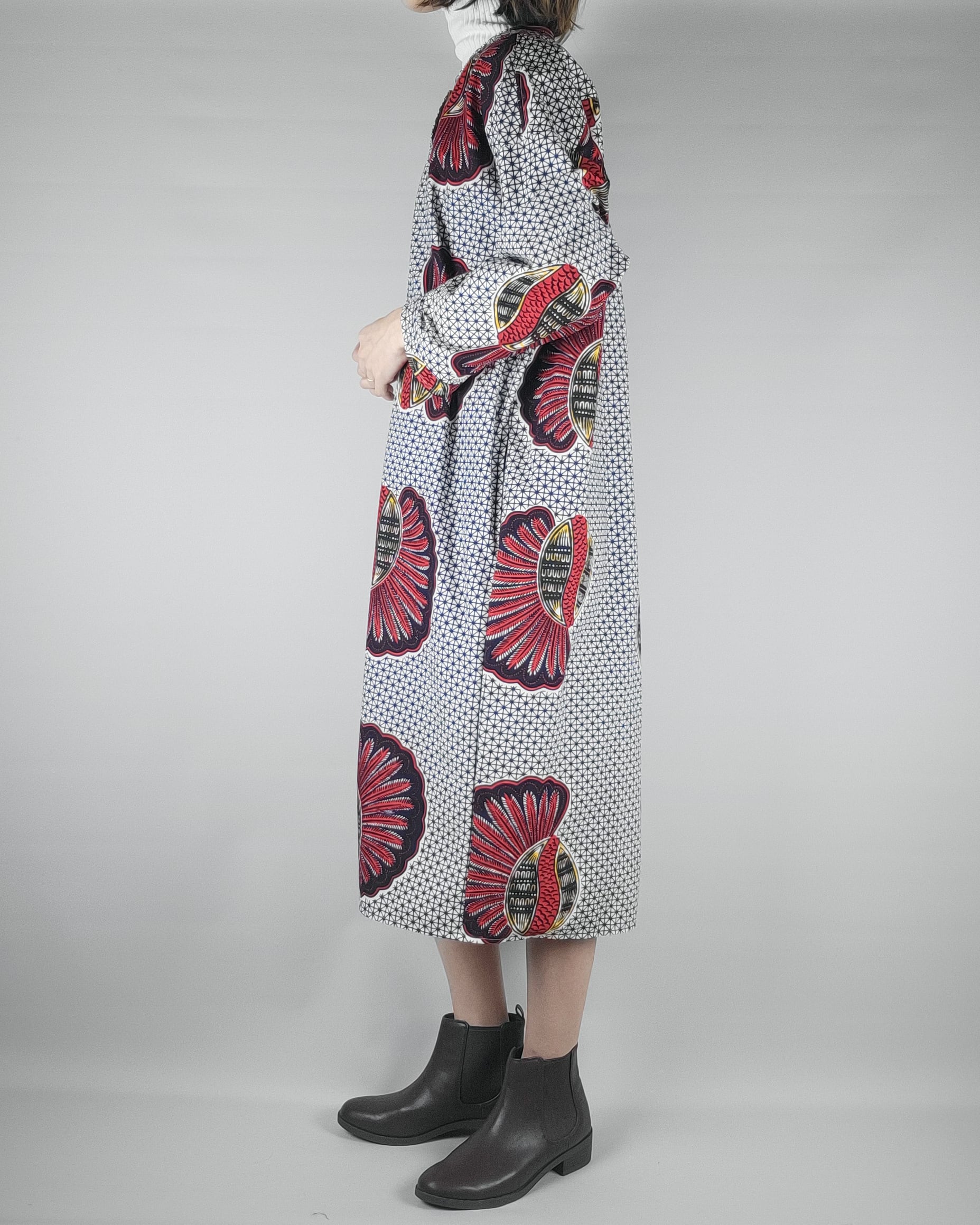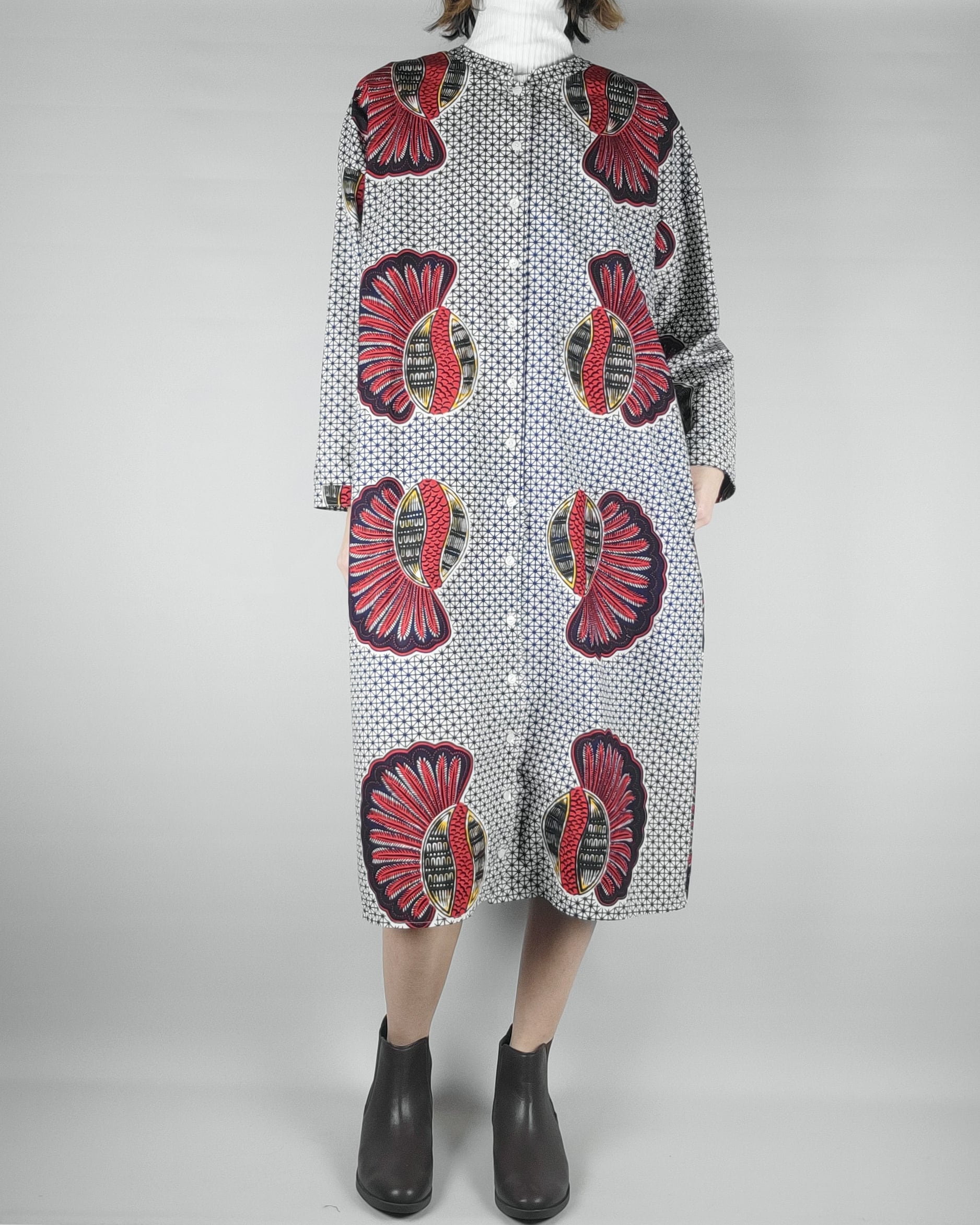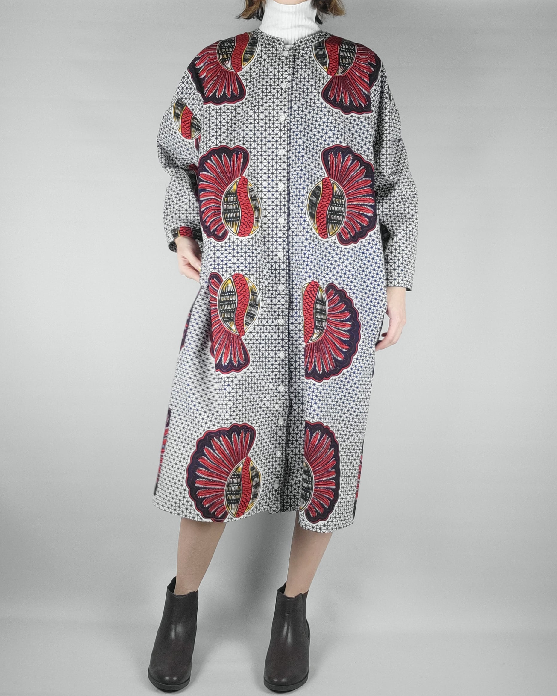 アフリカ布で仕立てたフロントオープンのワンピースになります。