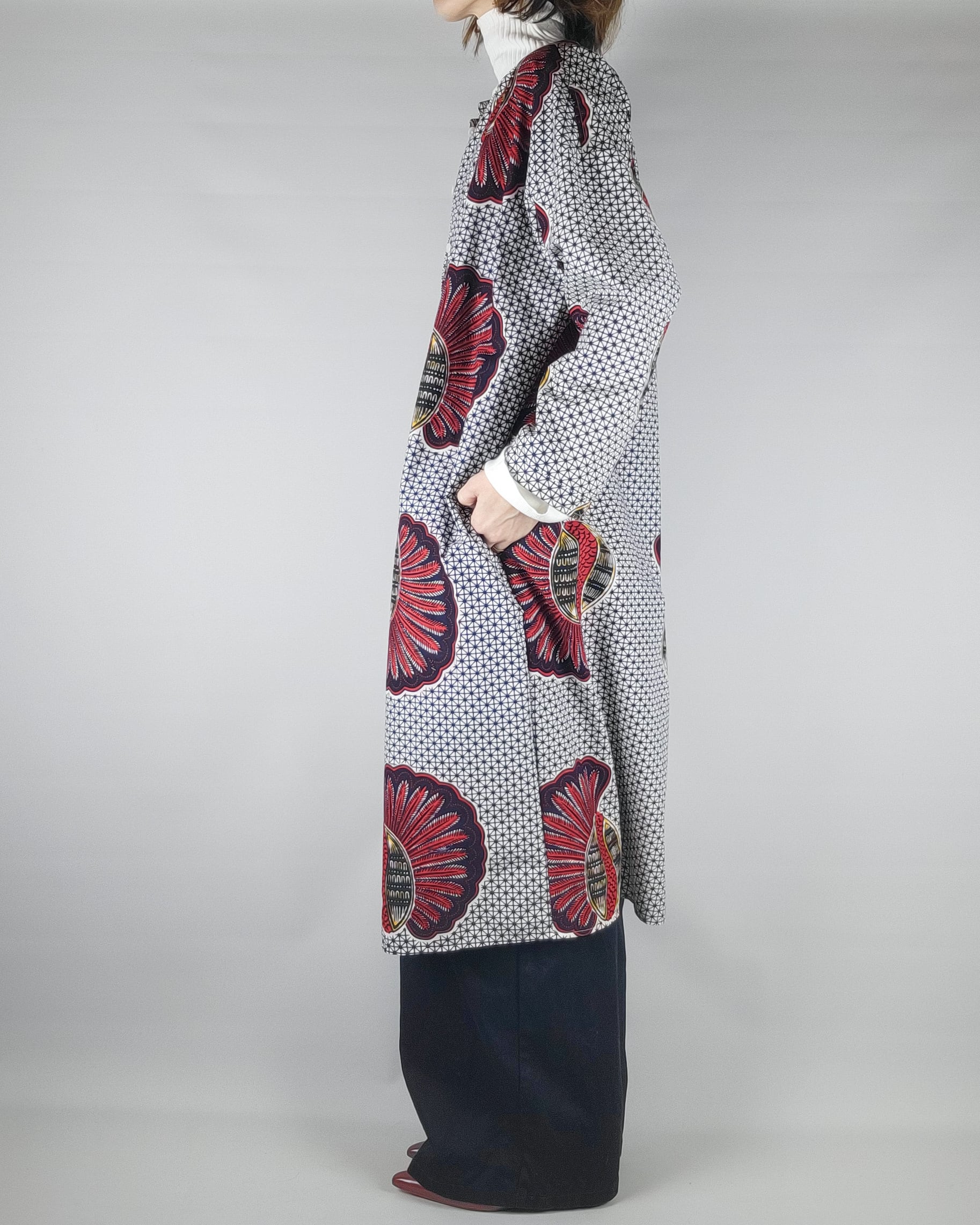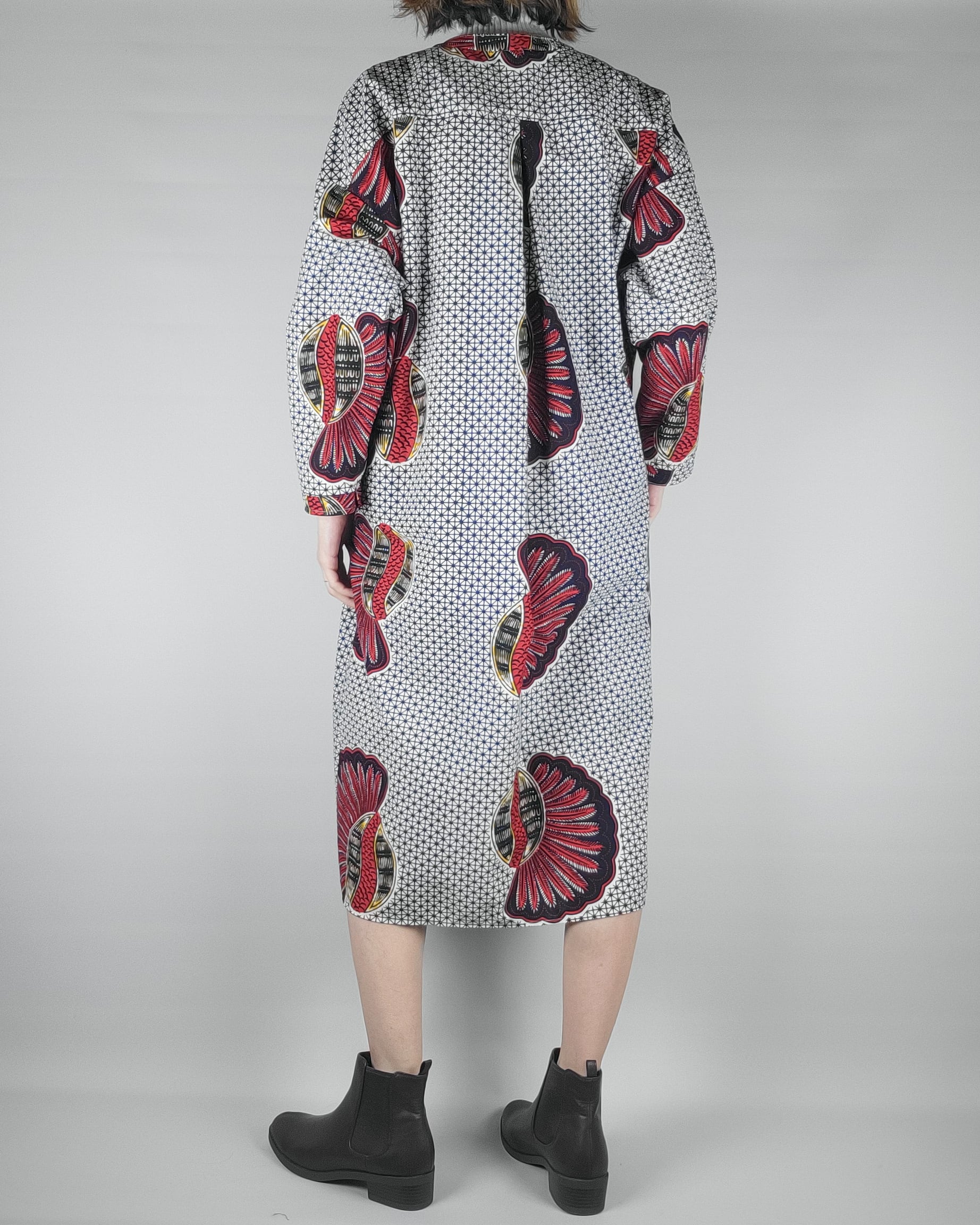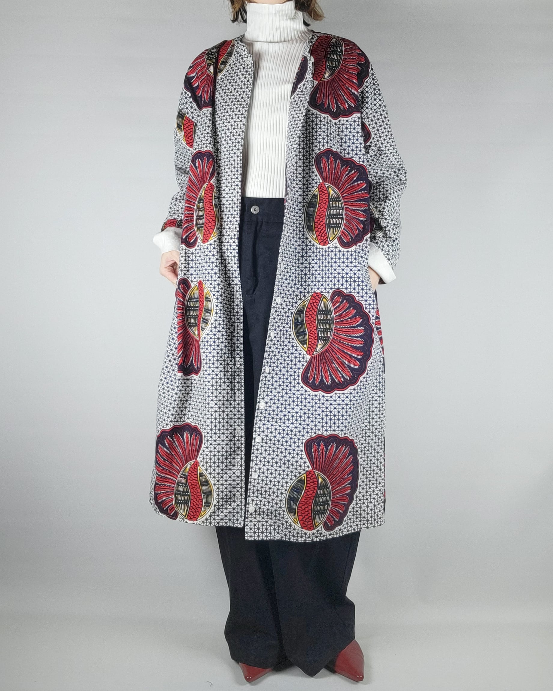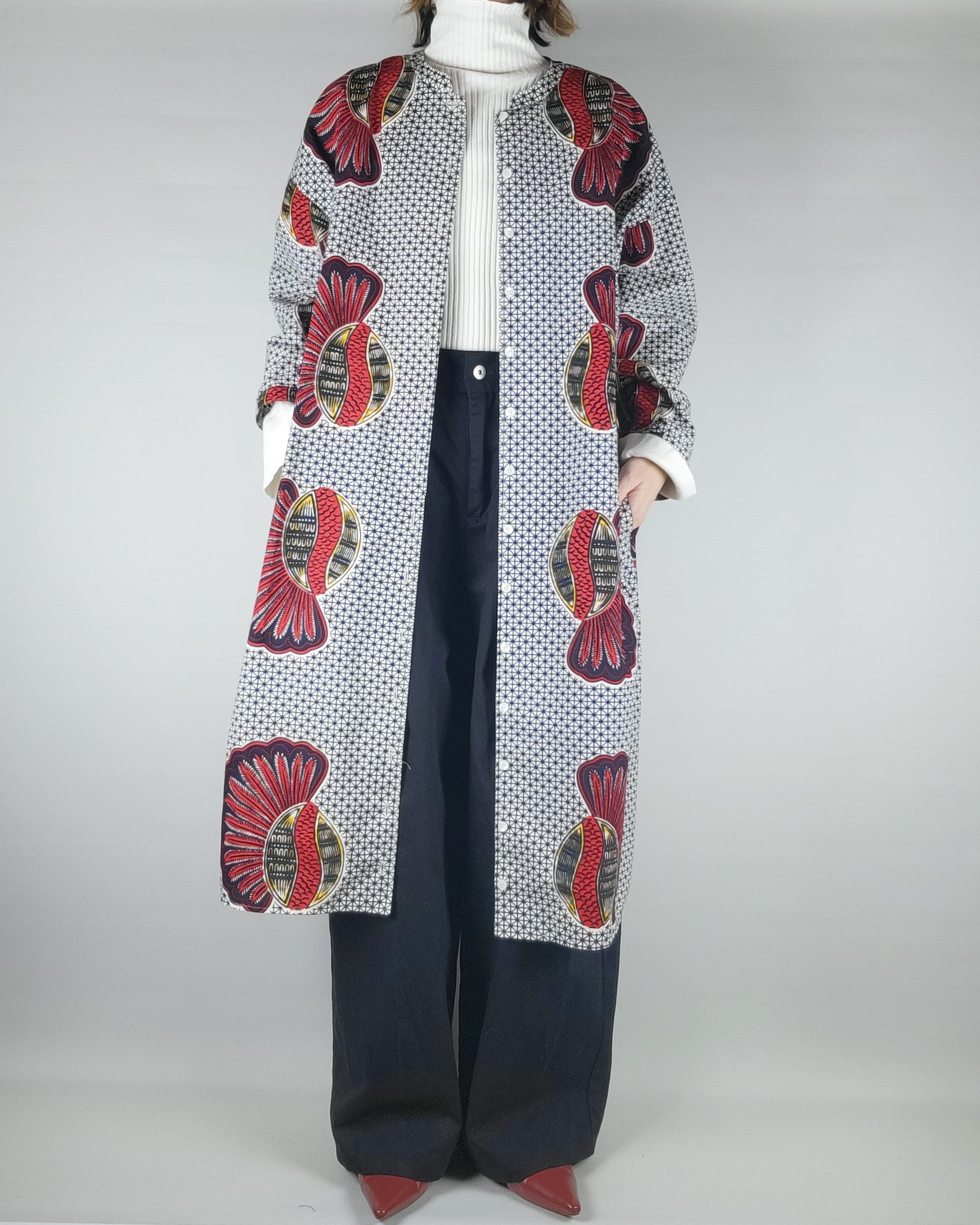 アフリカ布で仕立てたフロントオープンのワンピースになります。