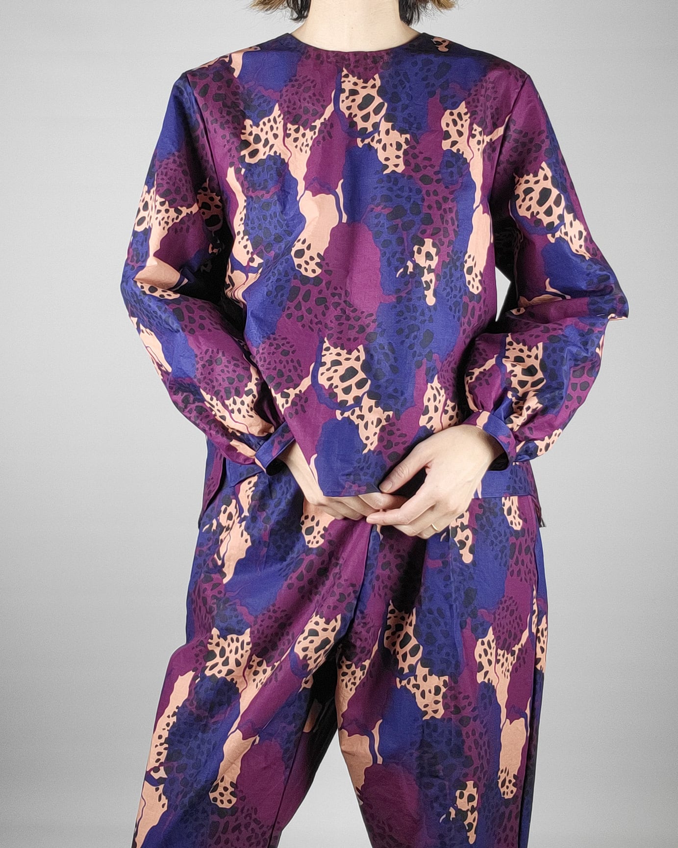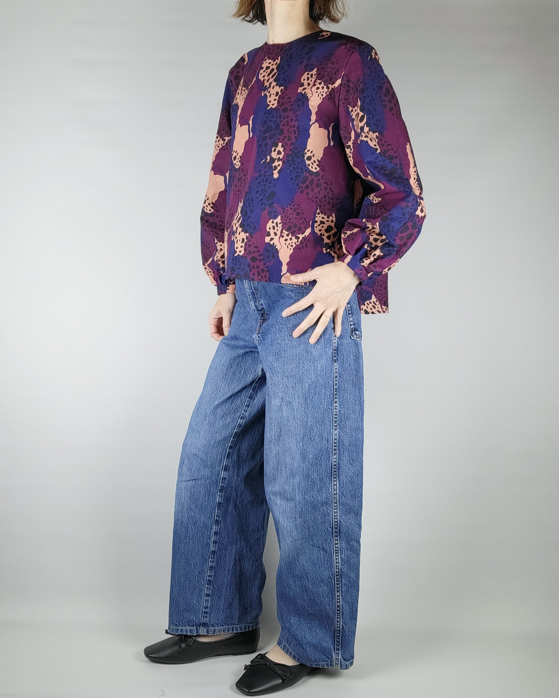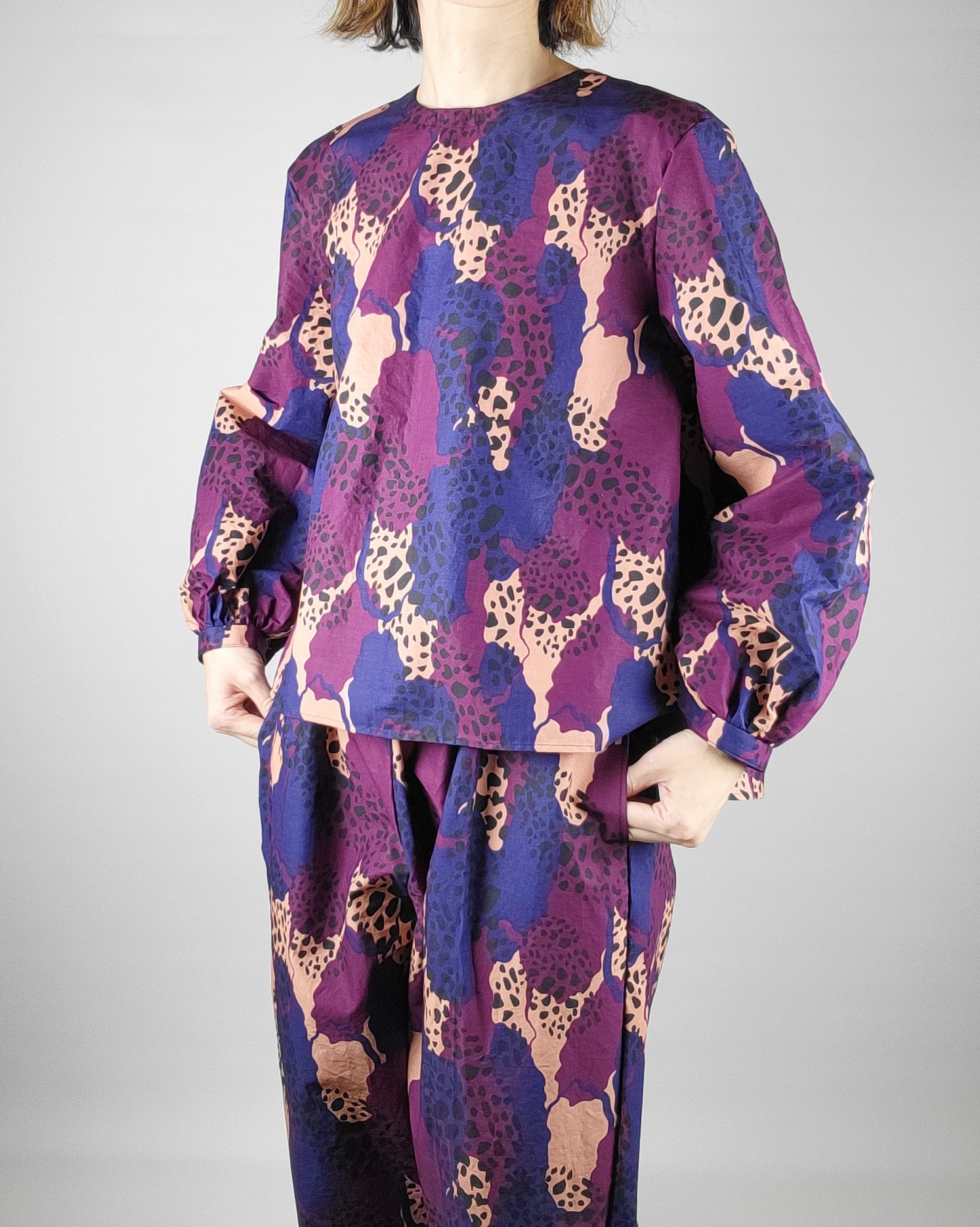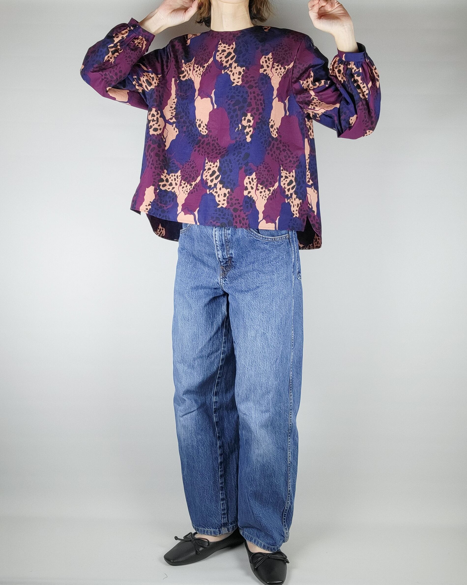 コーディネートのしやすさを重視し、ベーシックなゆとりあるシルエットで仕立てたノーカラーブラウスになります。