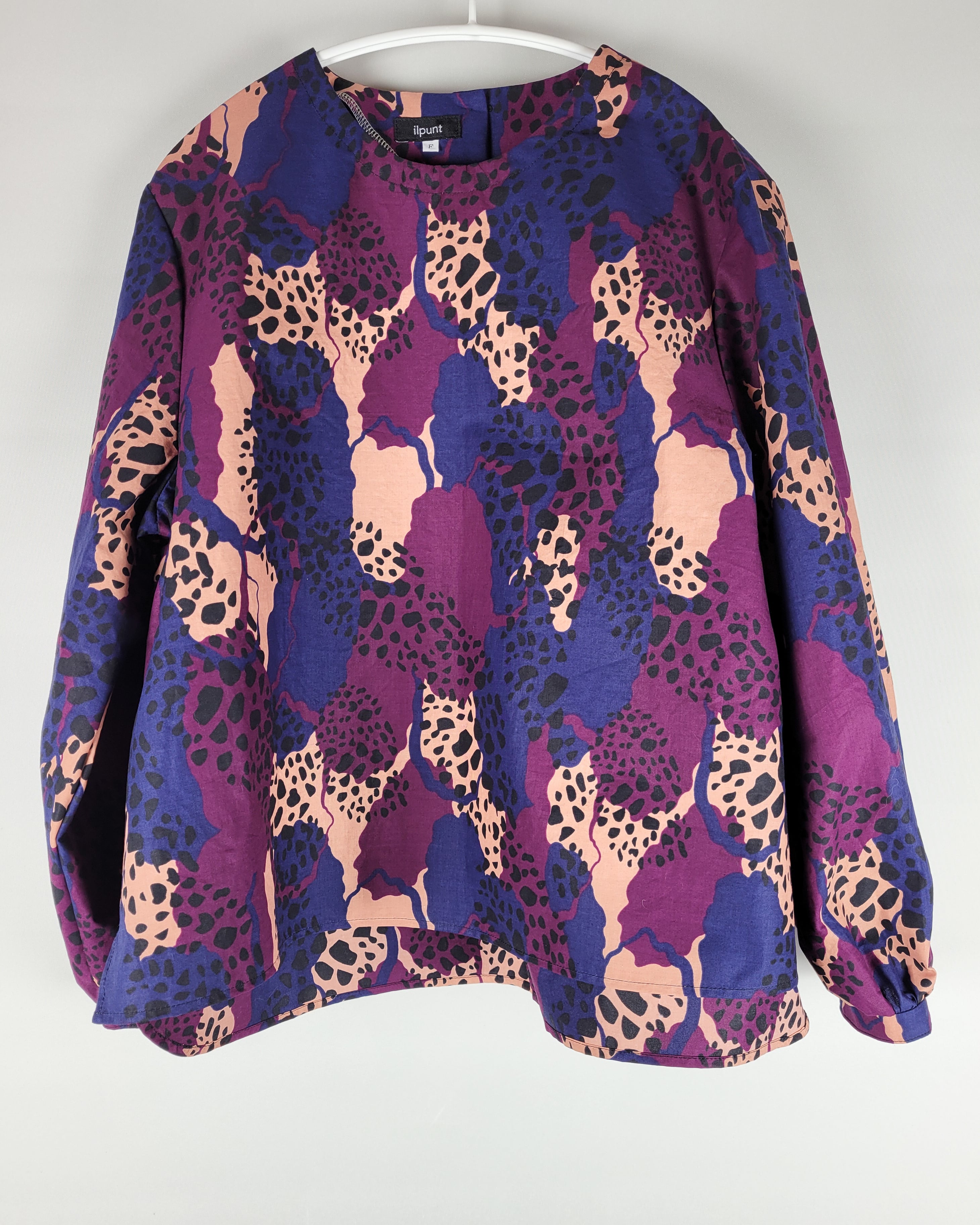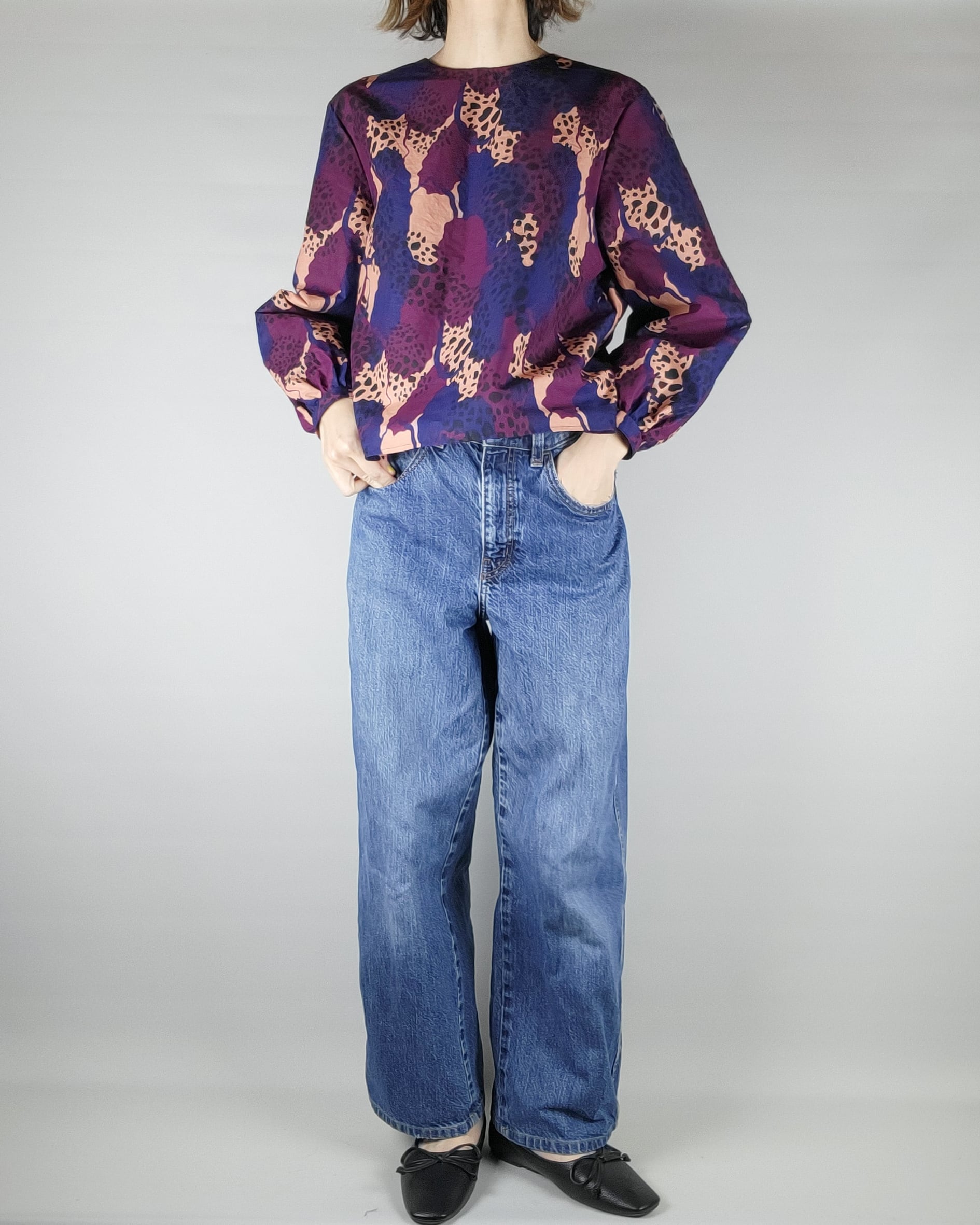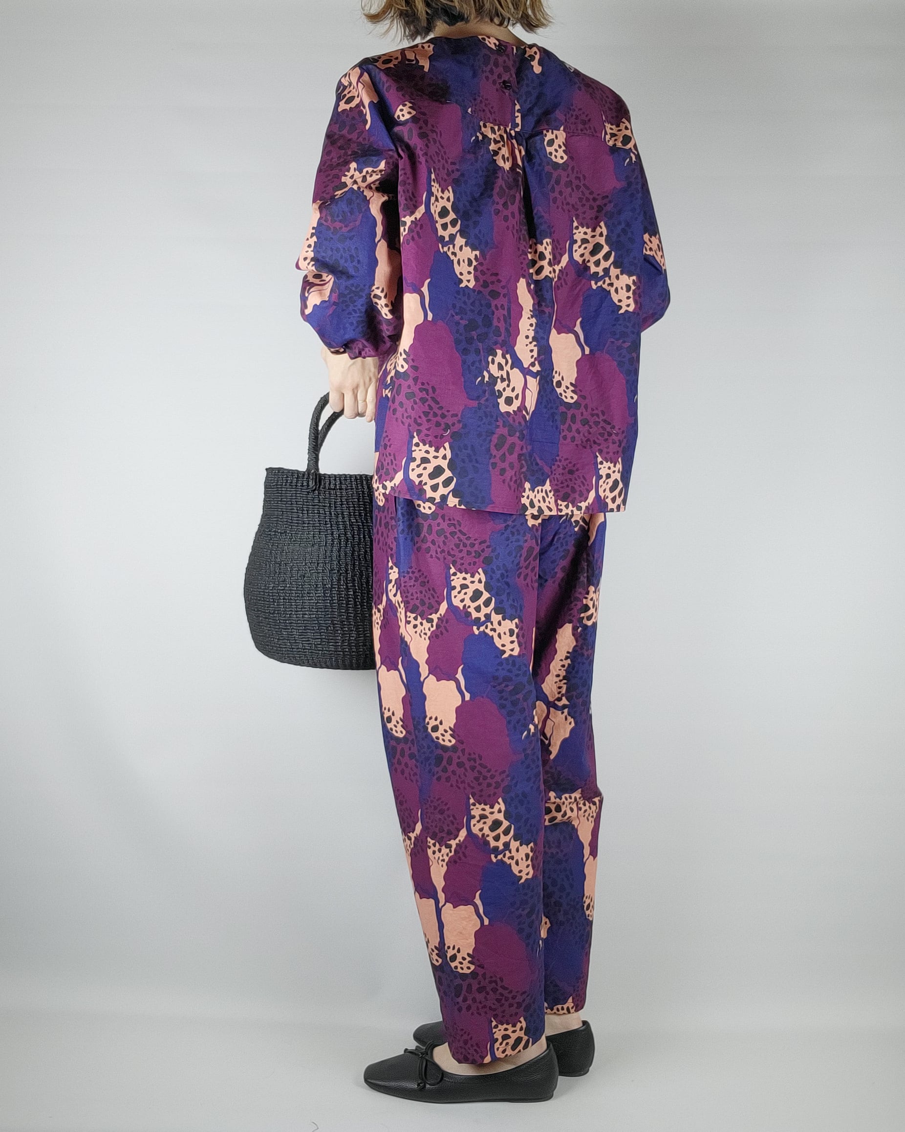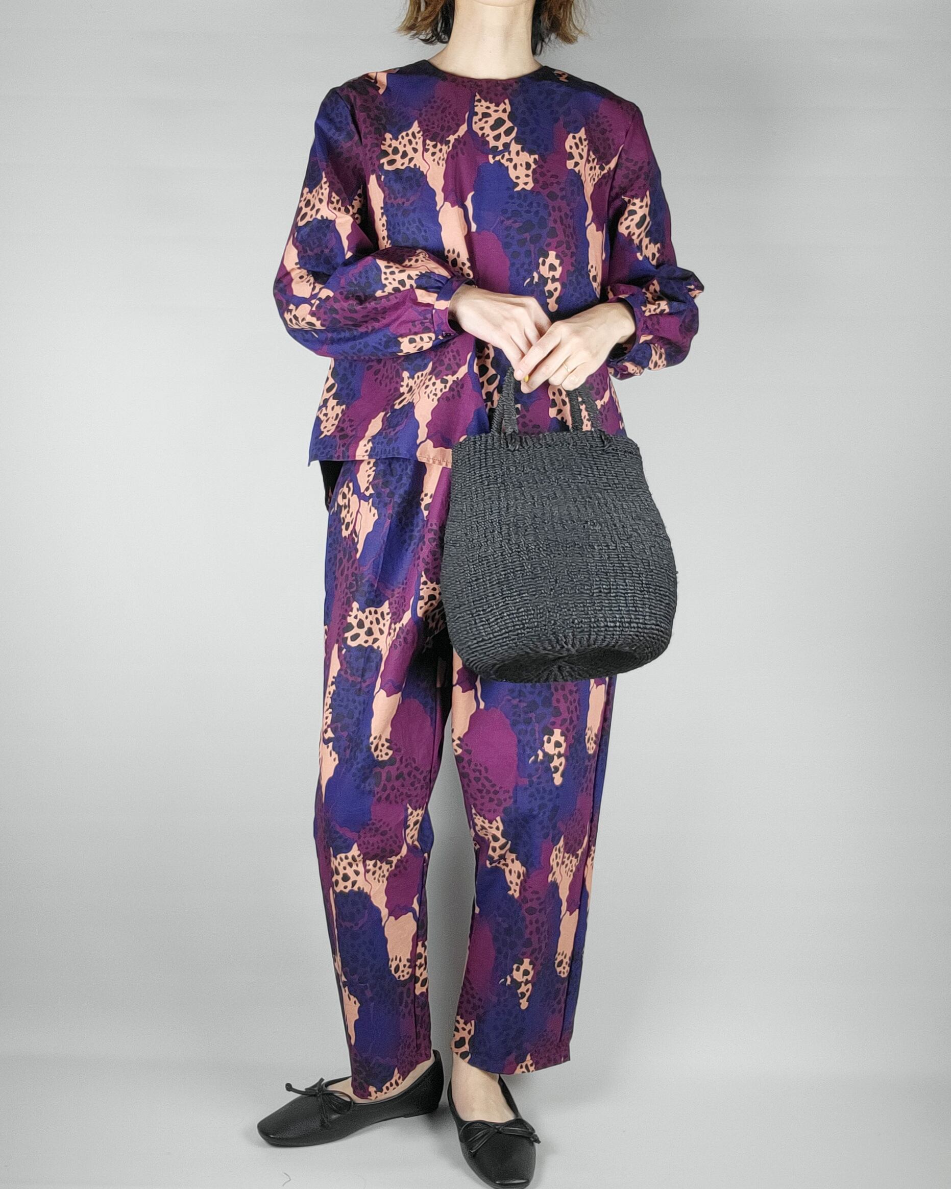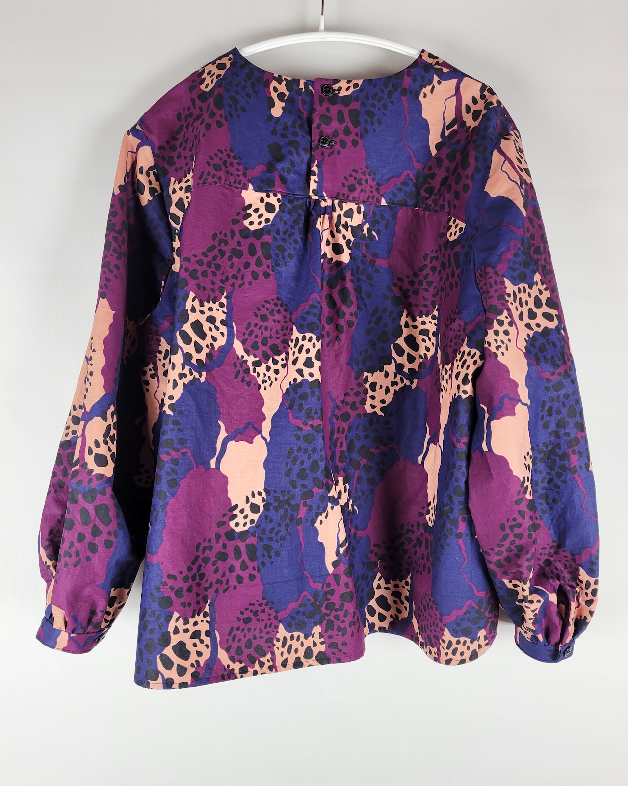 コーディネートのしやすさを重視し、ベーシックなゆとりあるシルエットで仕立てたノーカラーブラウスになります。