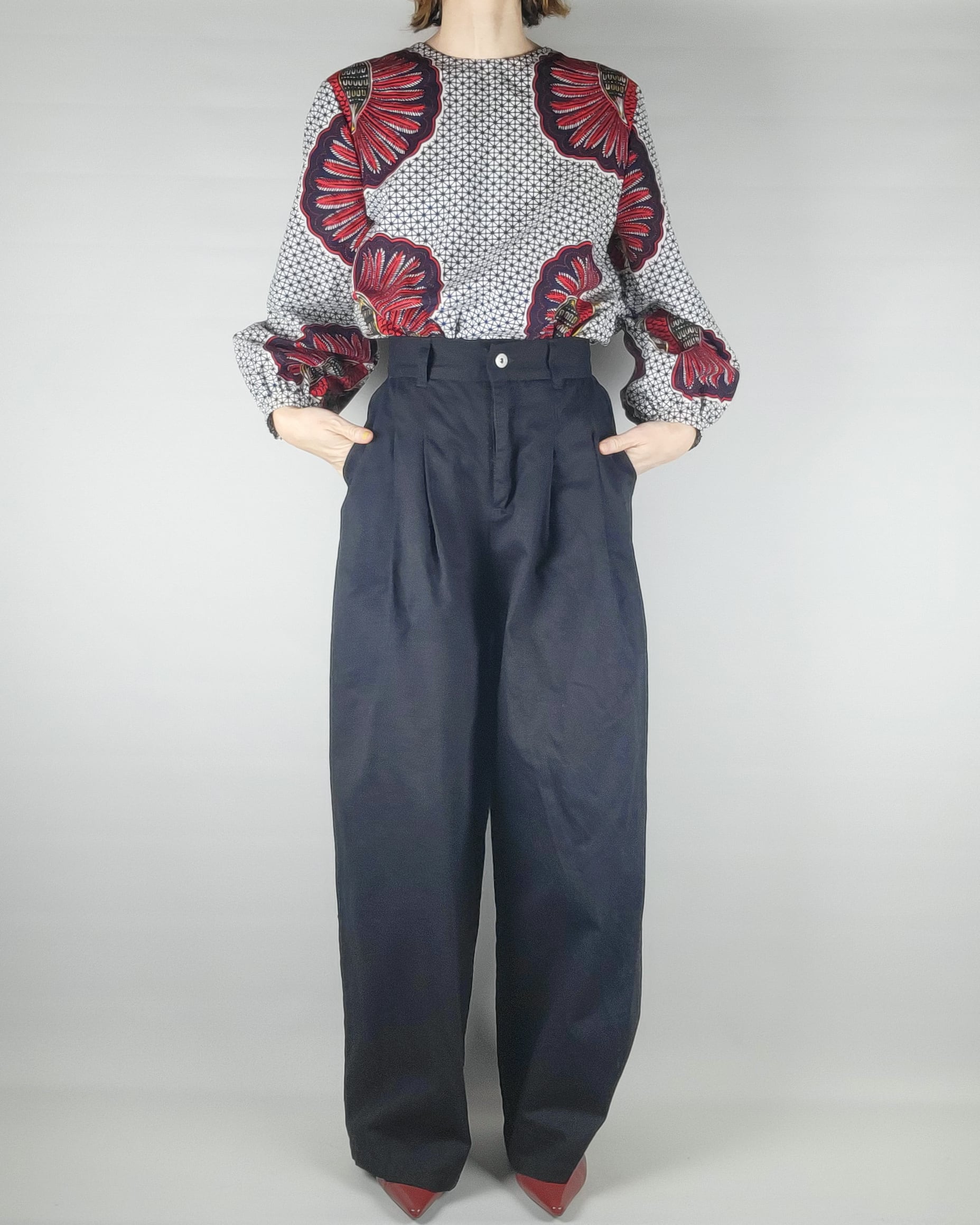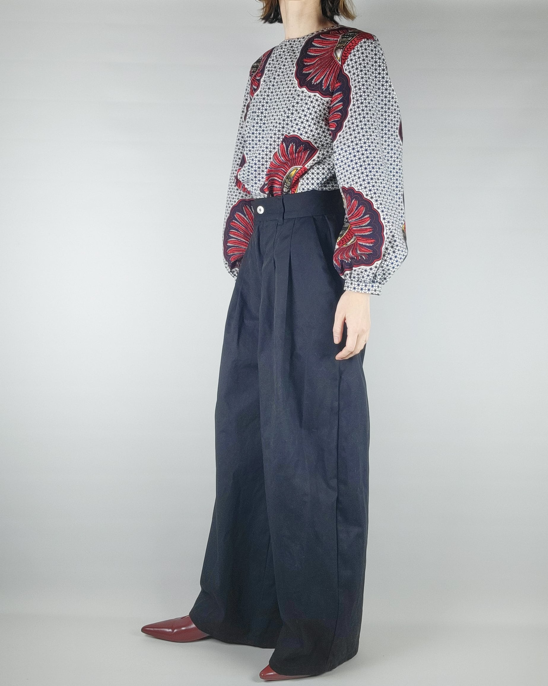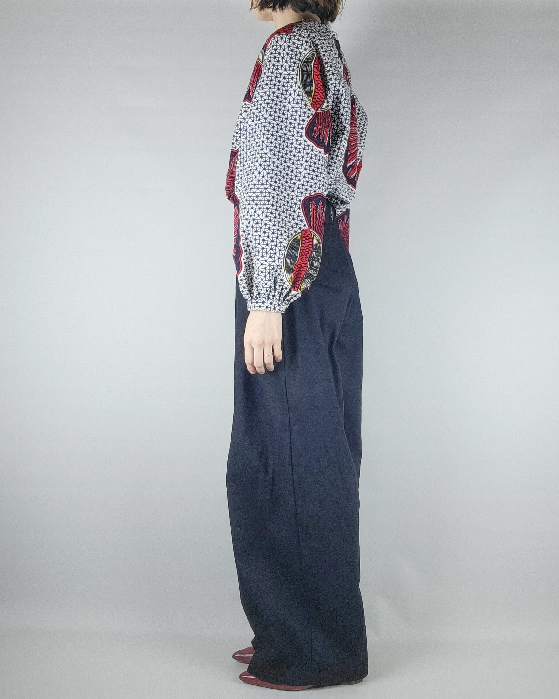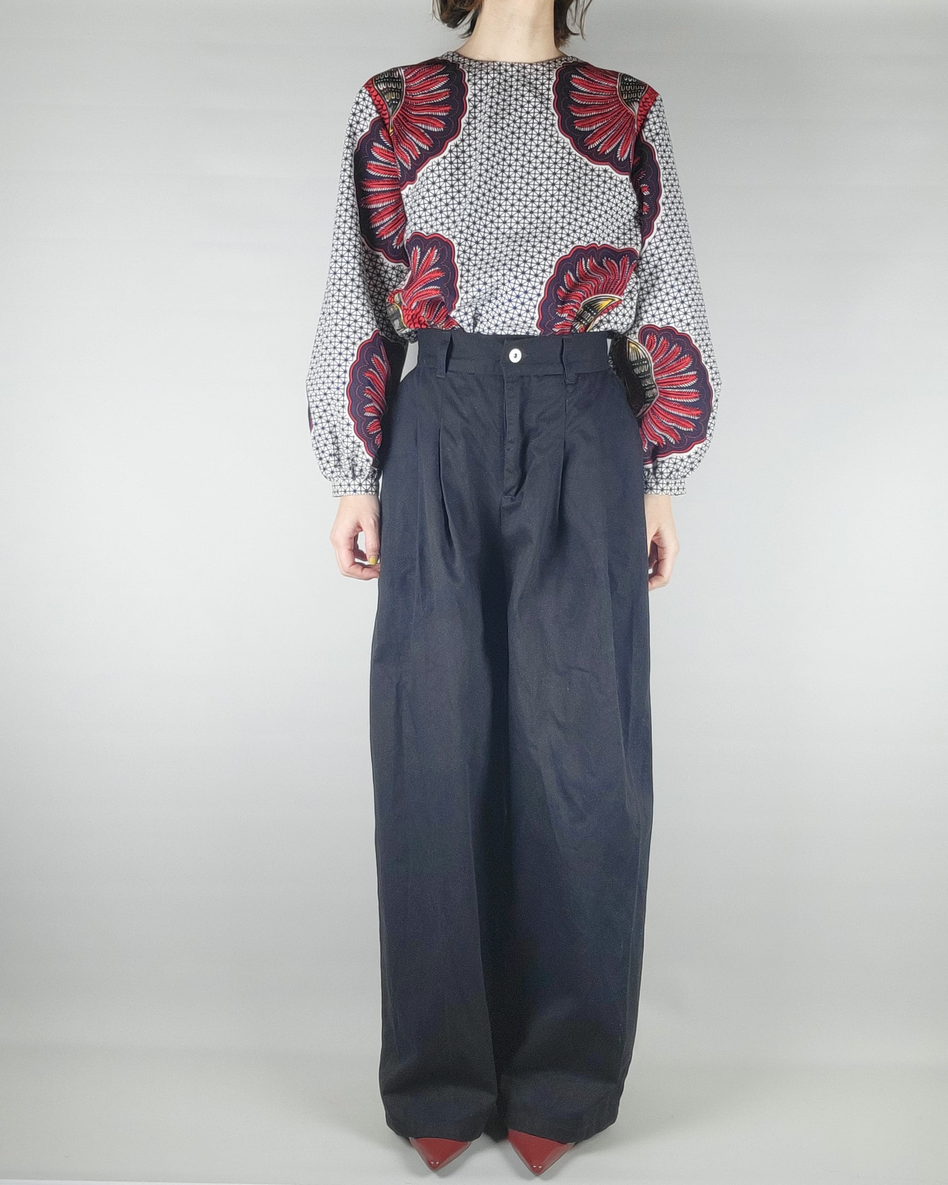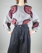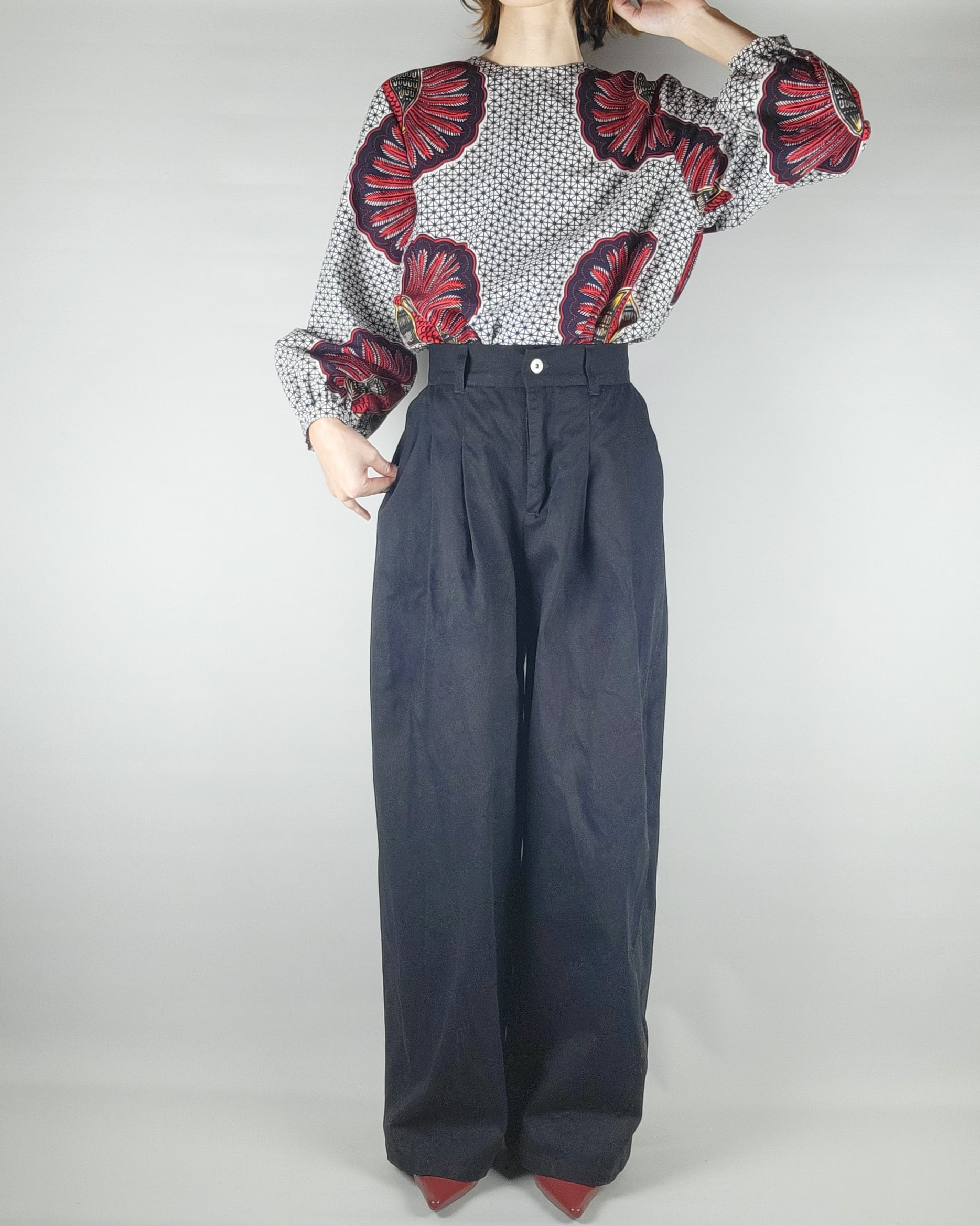 コーディネートのしやすさを重視し、ベーシックなゆとりあるシルエットで仕立てたノーカラーブラウスになります。