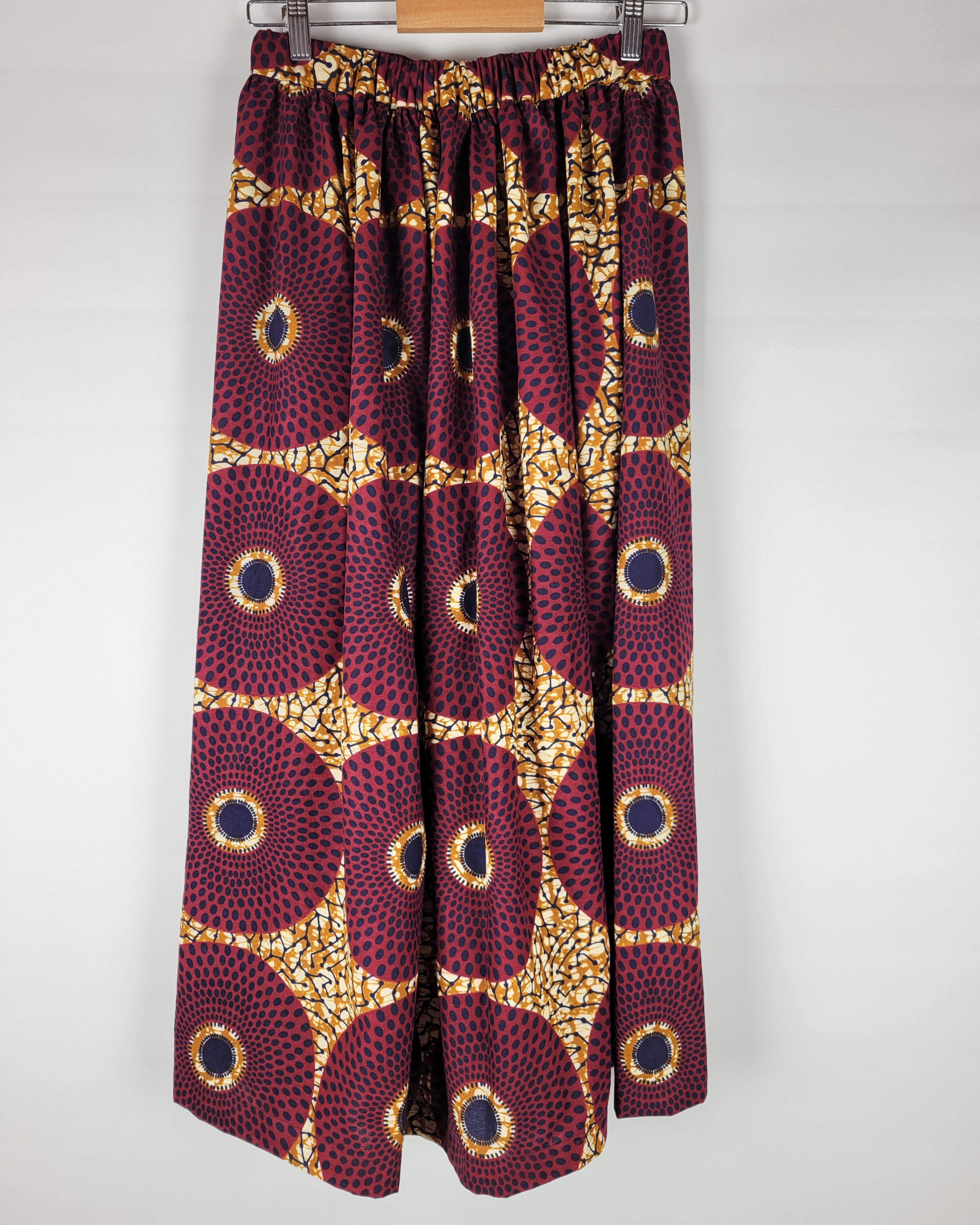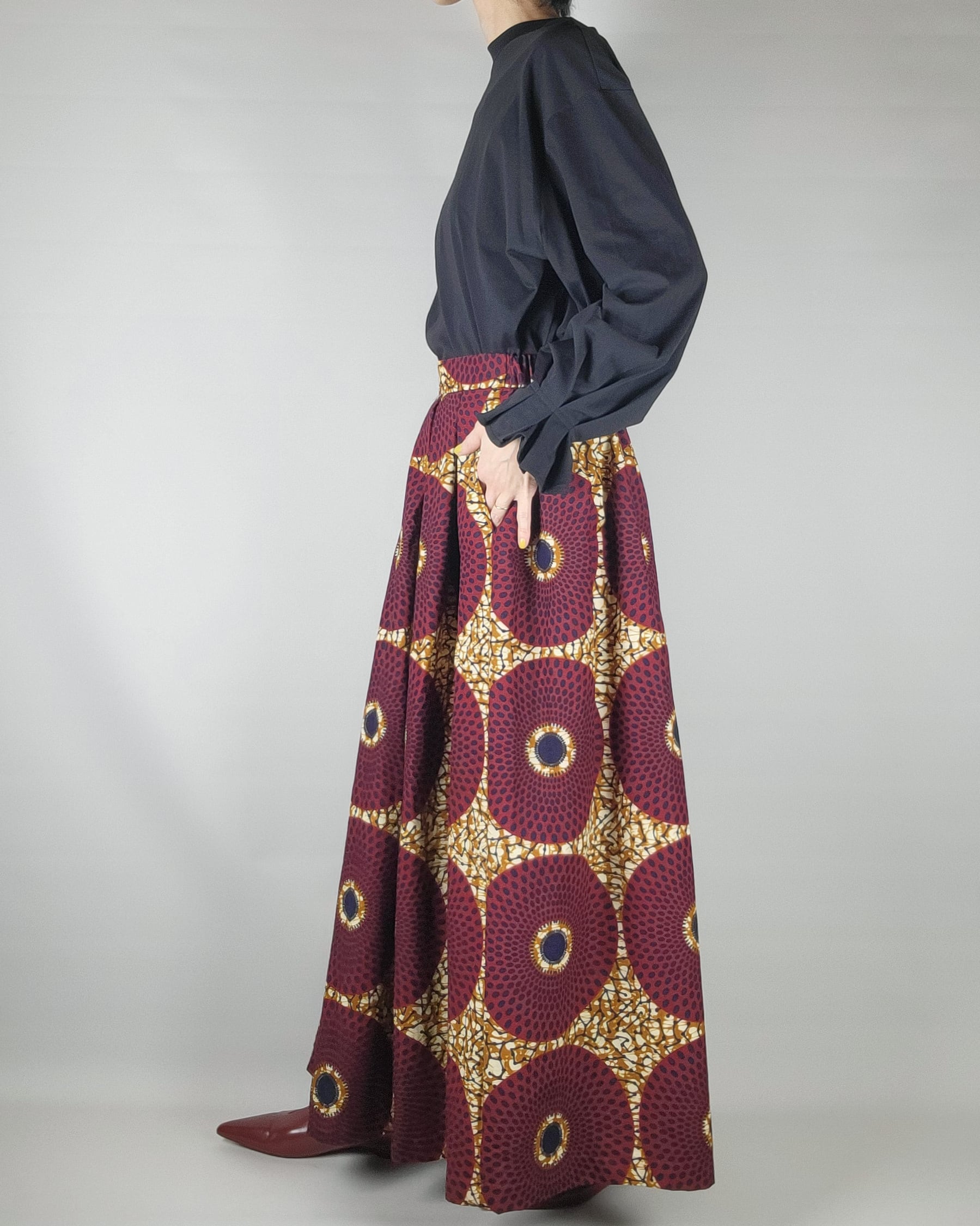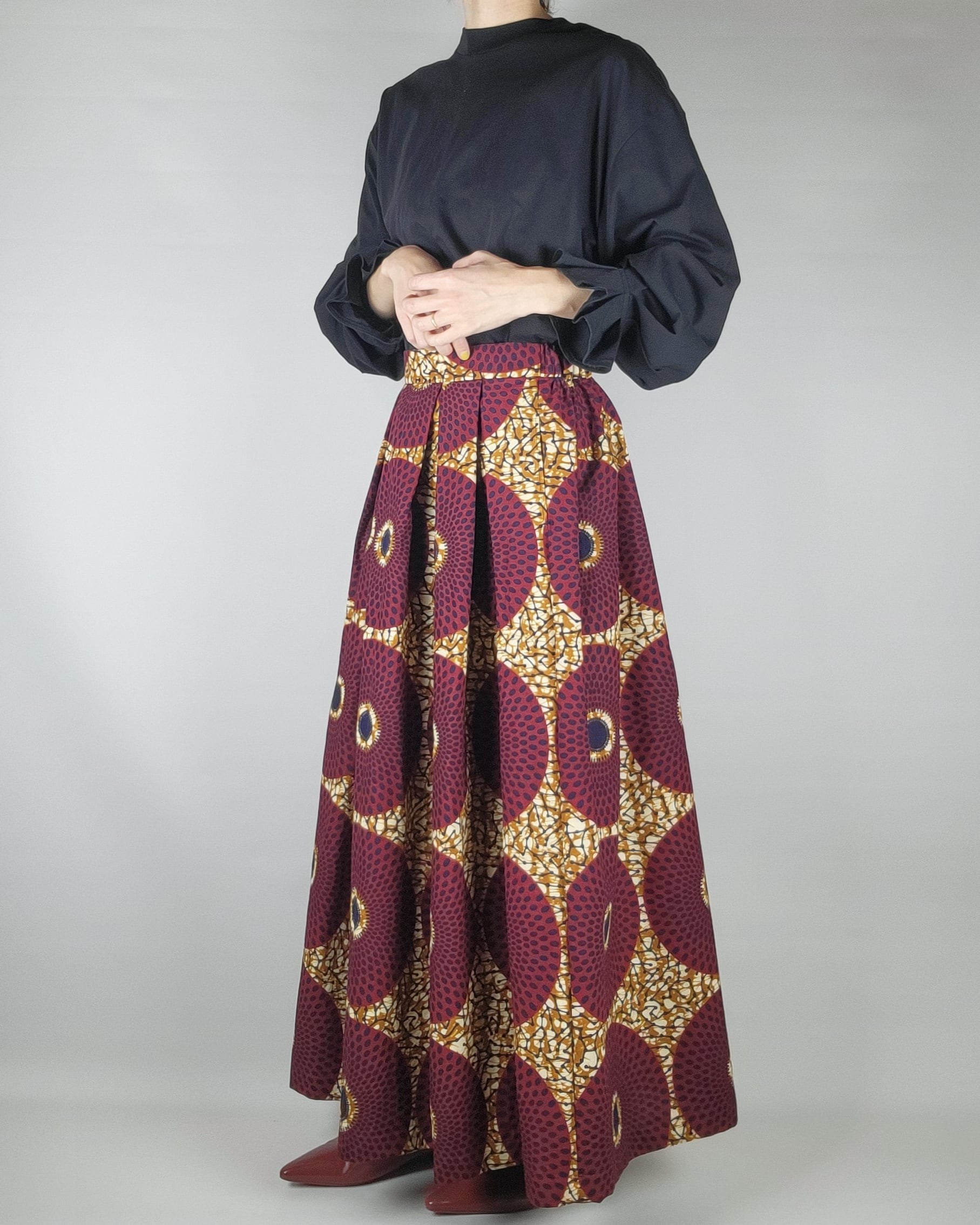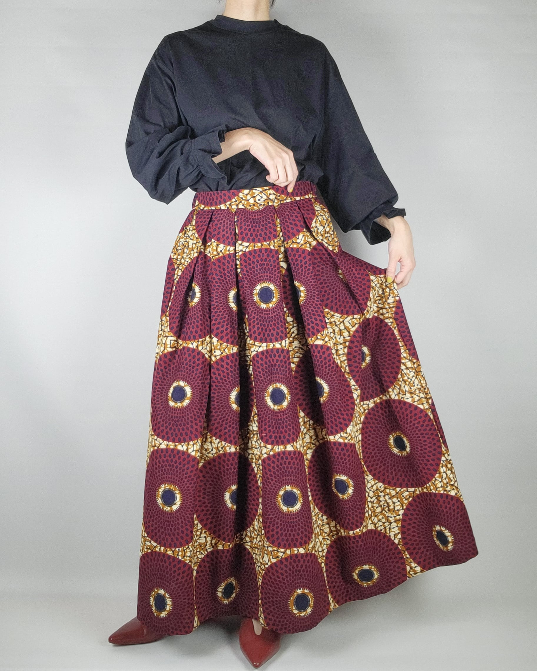 贅沢にアフリカ布を使用したフロントがランダムなタックになっているロングスカートになります。後ろ部分はウエストゴムでギャザースカート使用になっていますのでウエストを締め付けすぎないお仕立てをさせて頂いております。