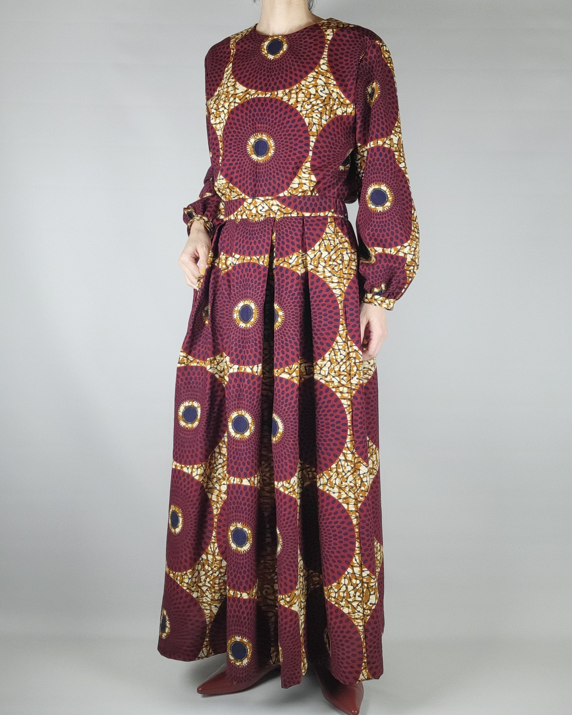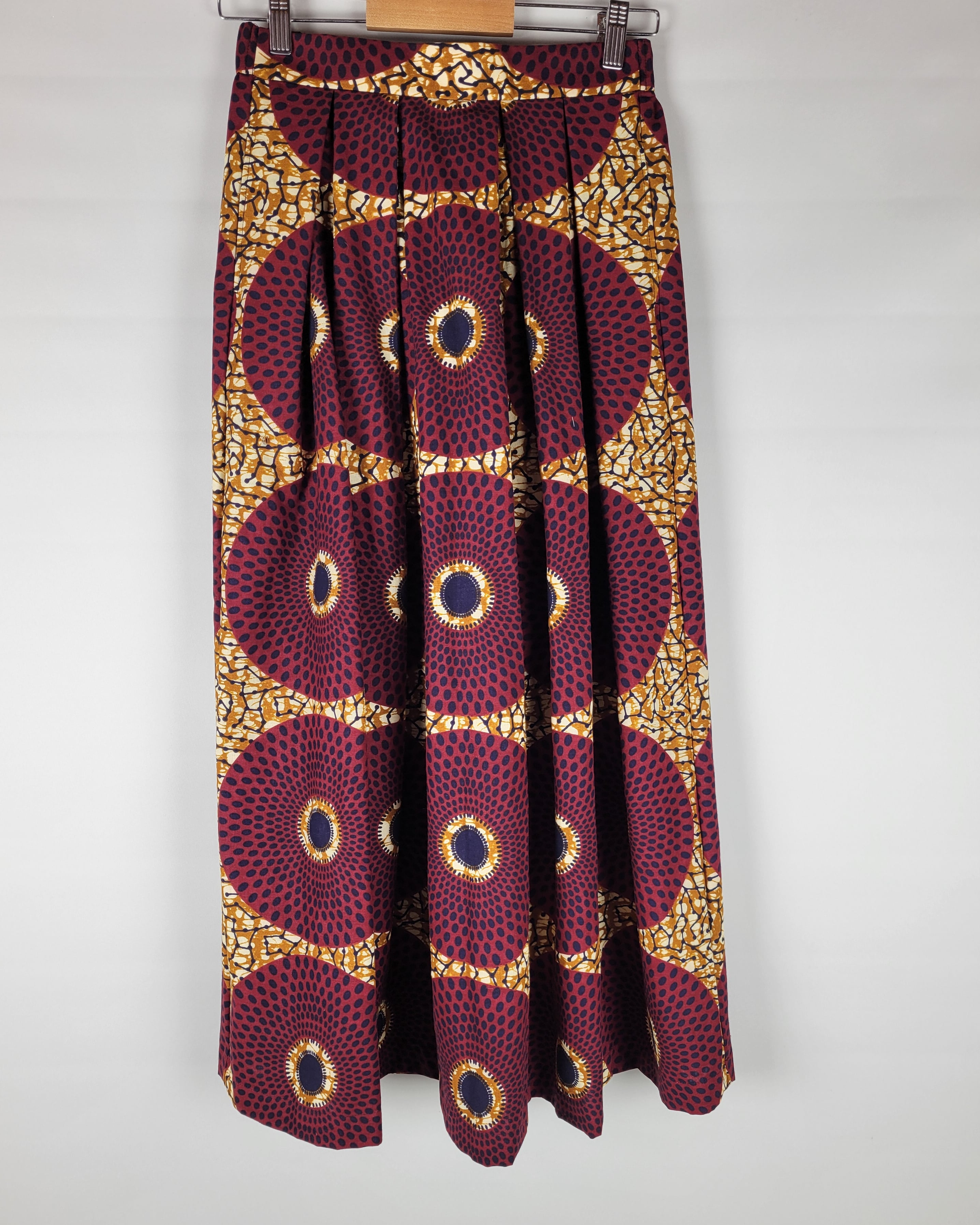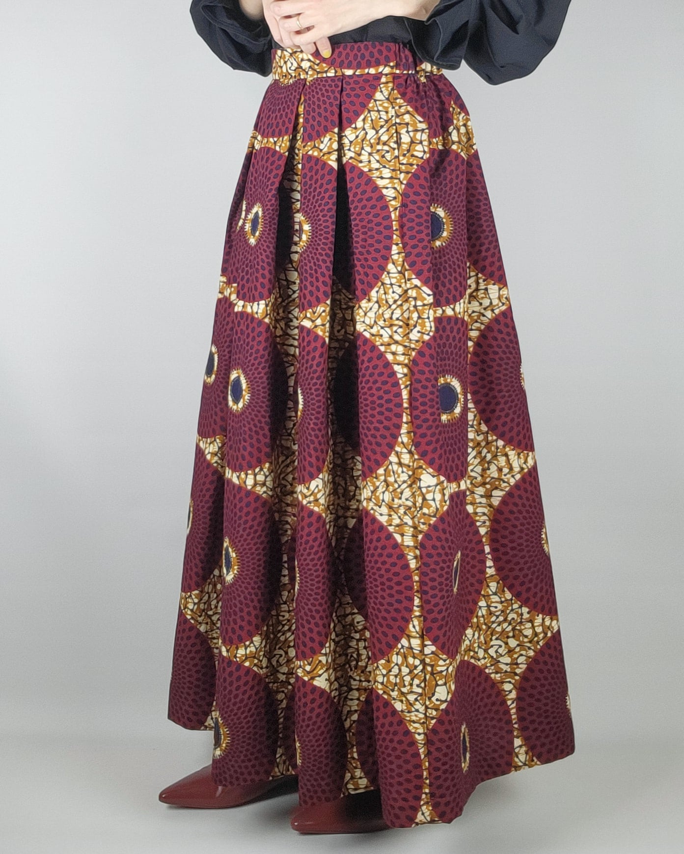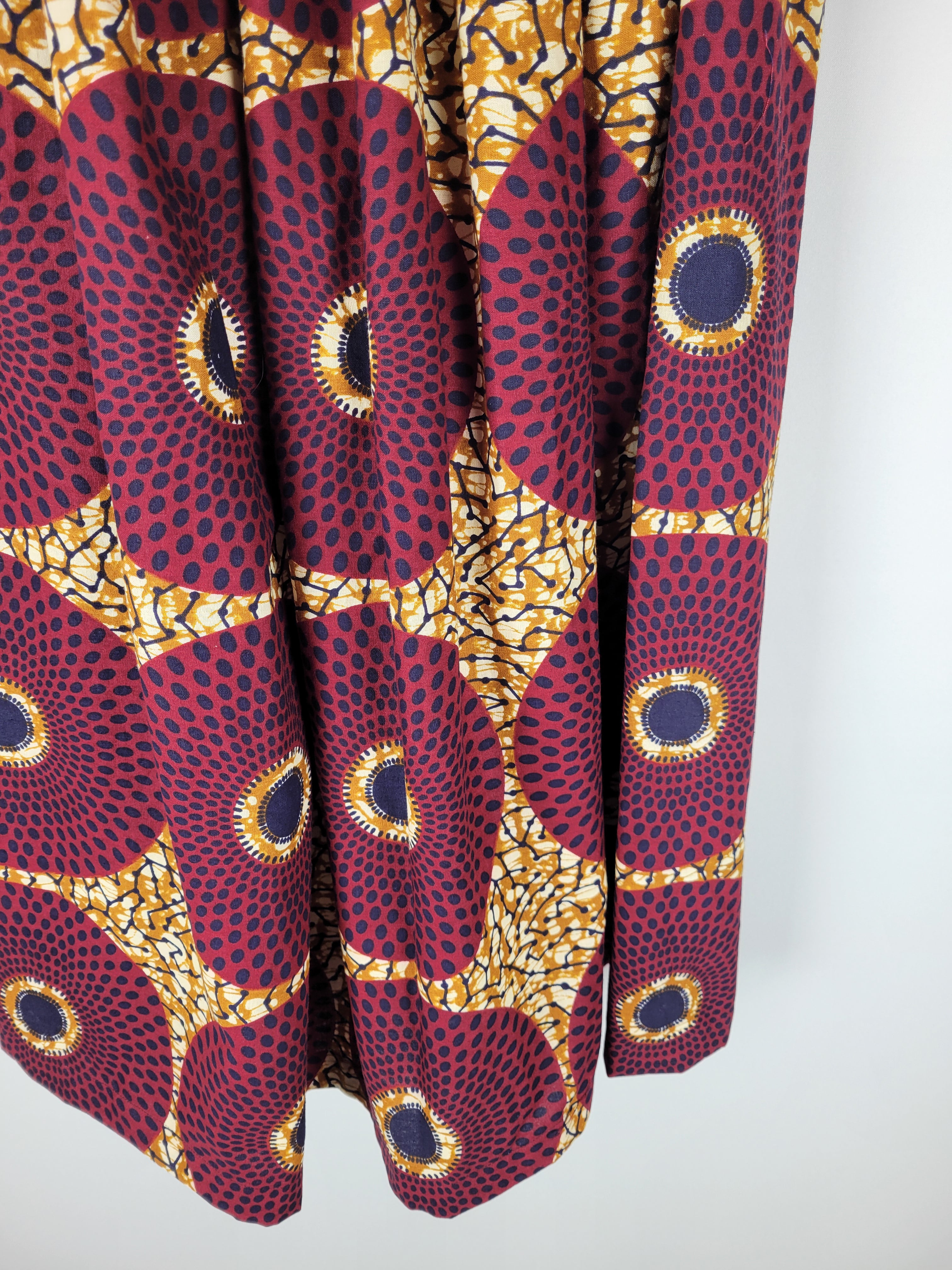 贅沢にアフリカ布を使用したフロントがランダムなタックになっているロングスカートになります。後ろ部分はウエストゴムでギャザースカート使用になっていますのでウエストを締め付けすぎないお仕立てをさせて頂いております。