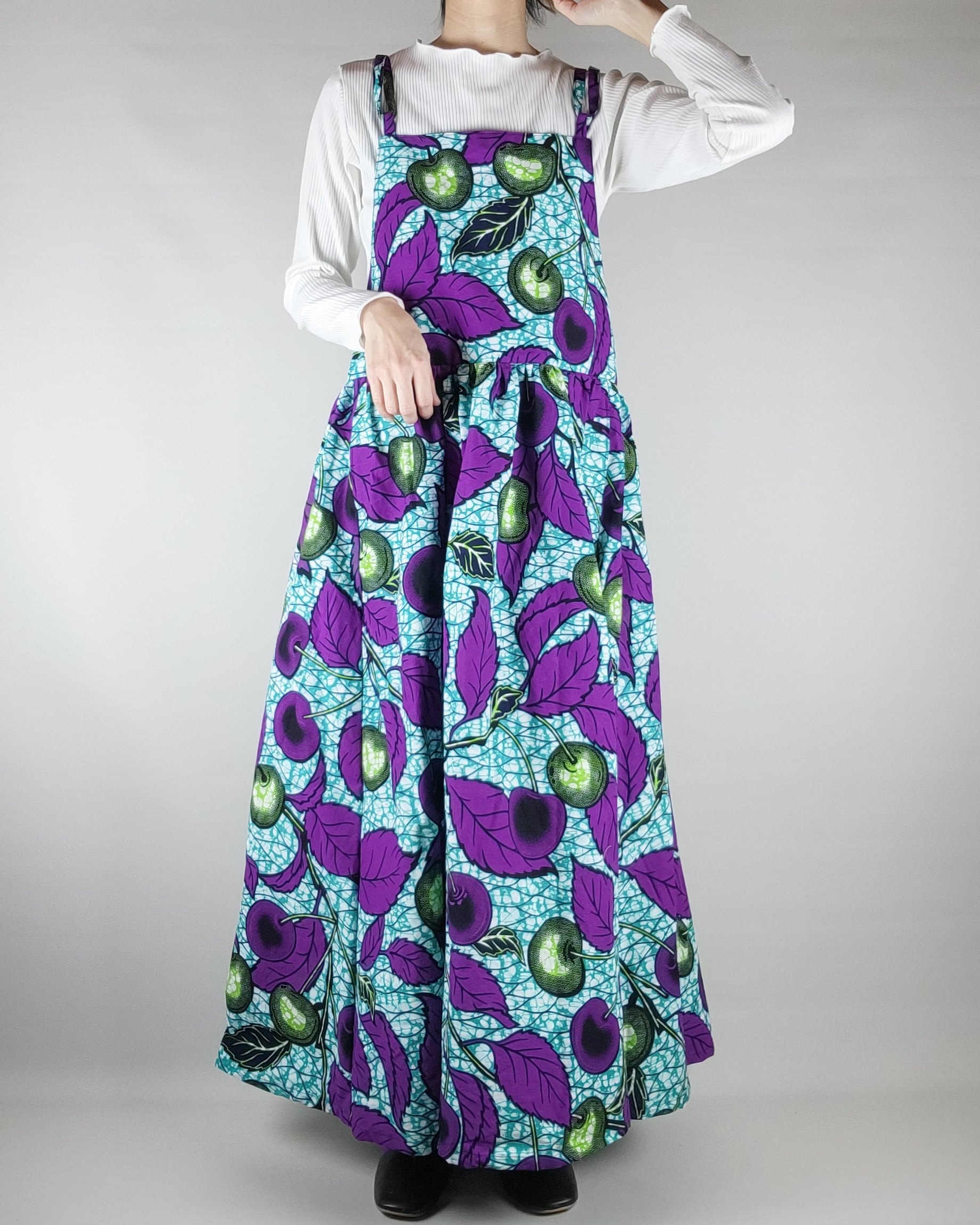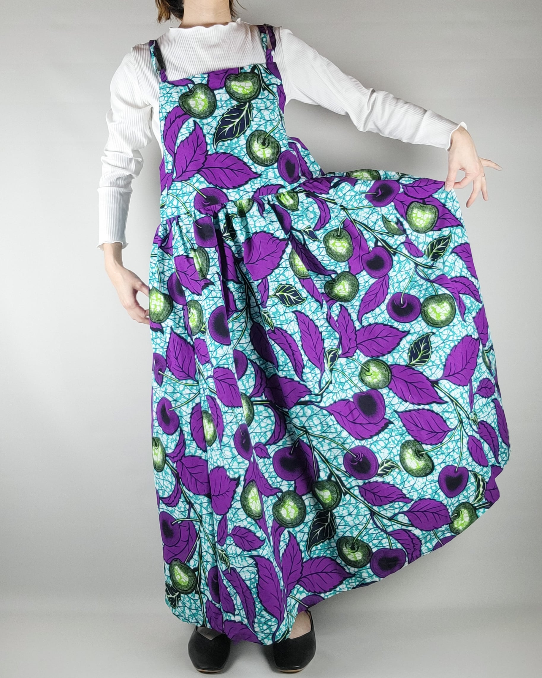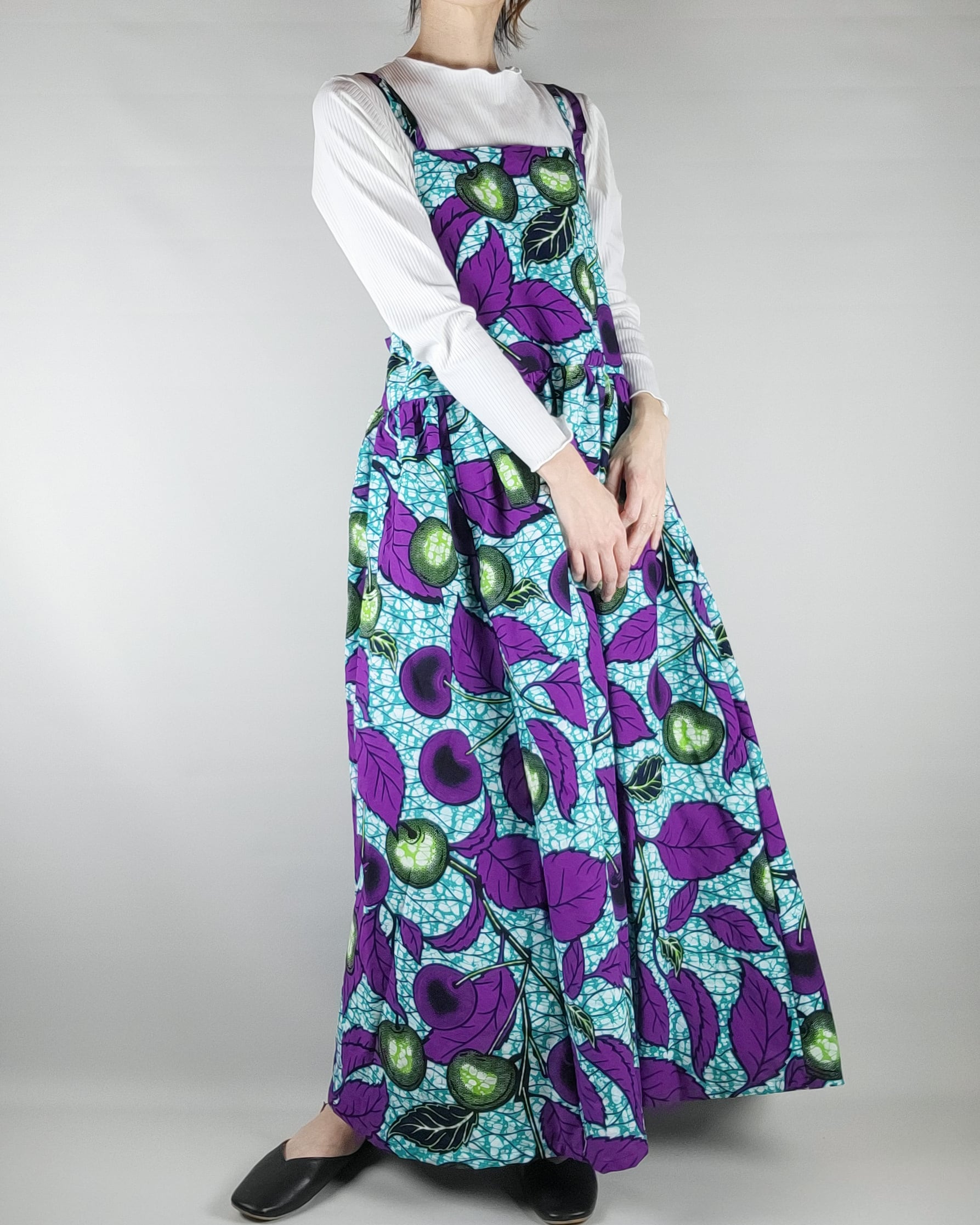 スカート部分にたっぷりとギャザーを使ったサロペットスカートになります。フレアーも入れ、女性らしいシルエットに仕立てました。