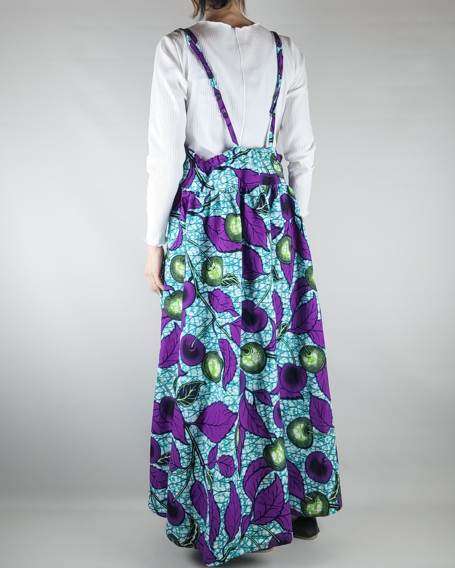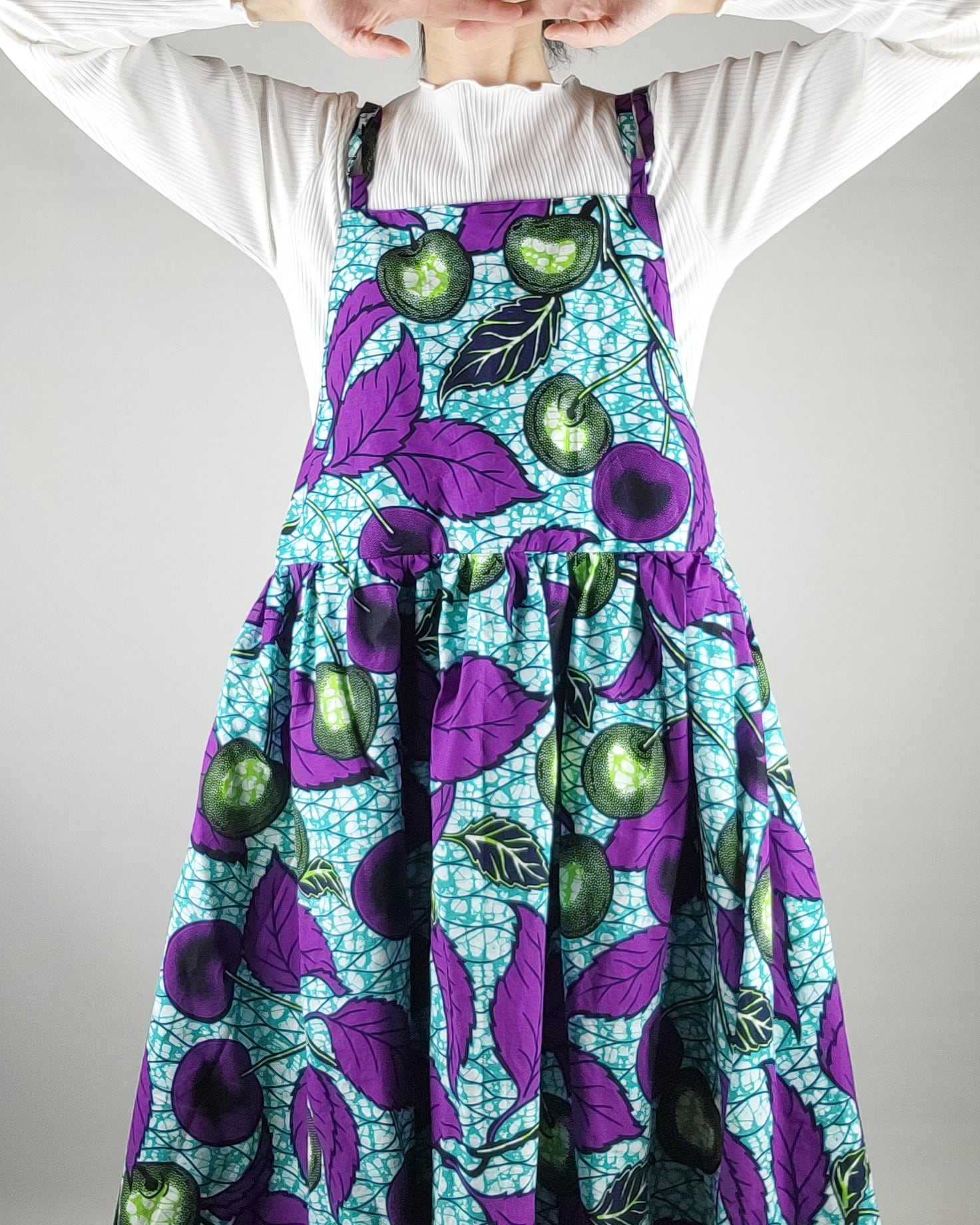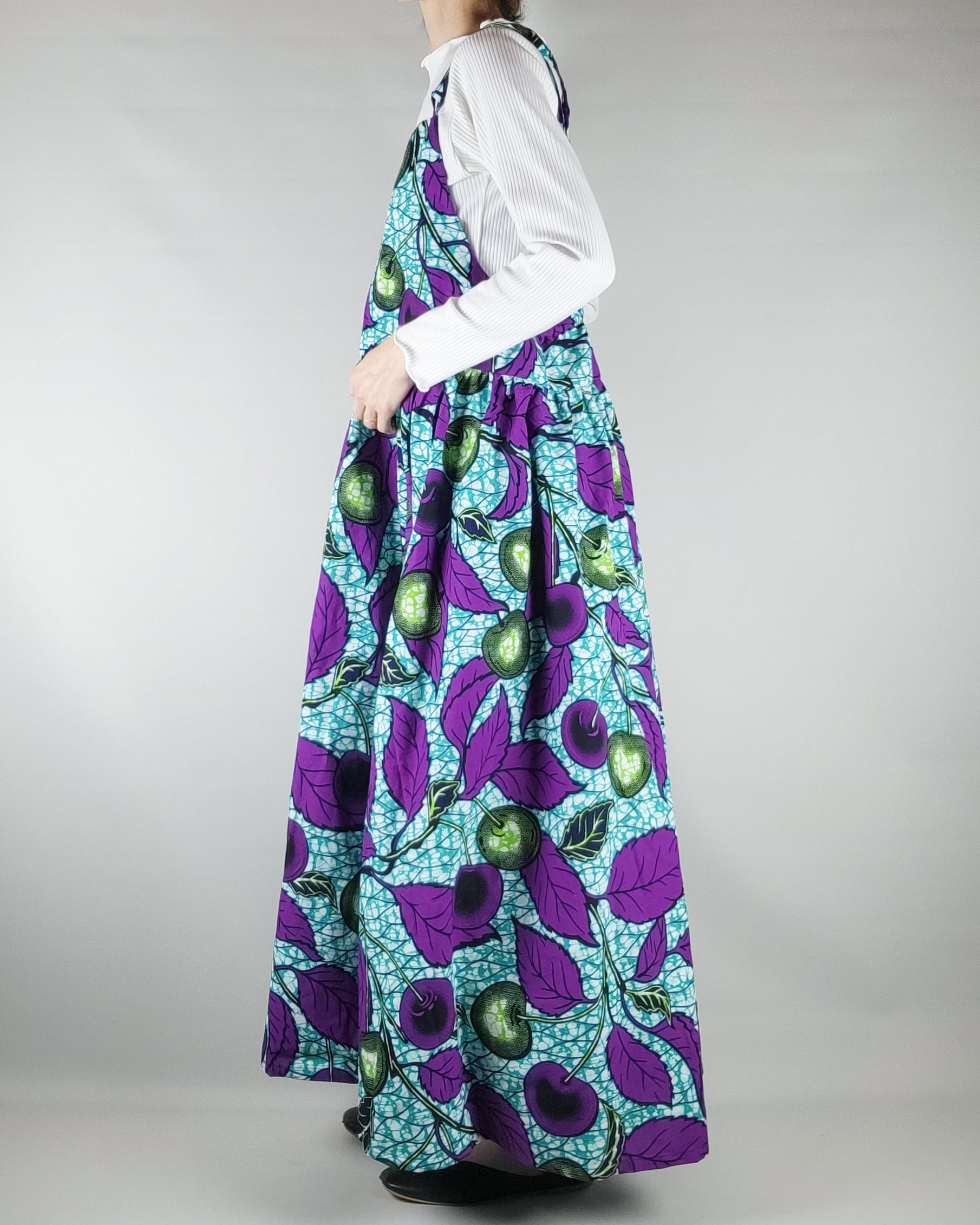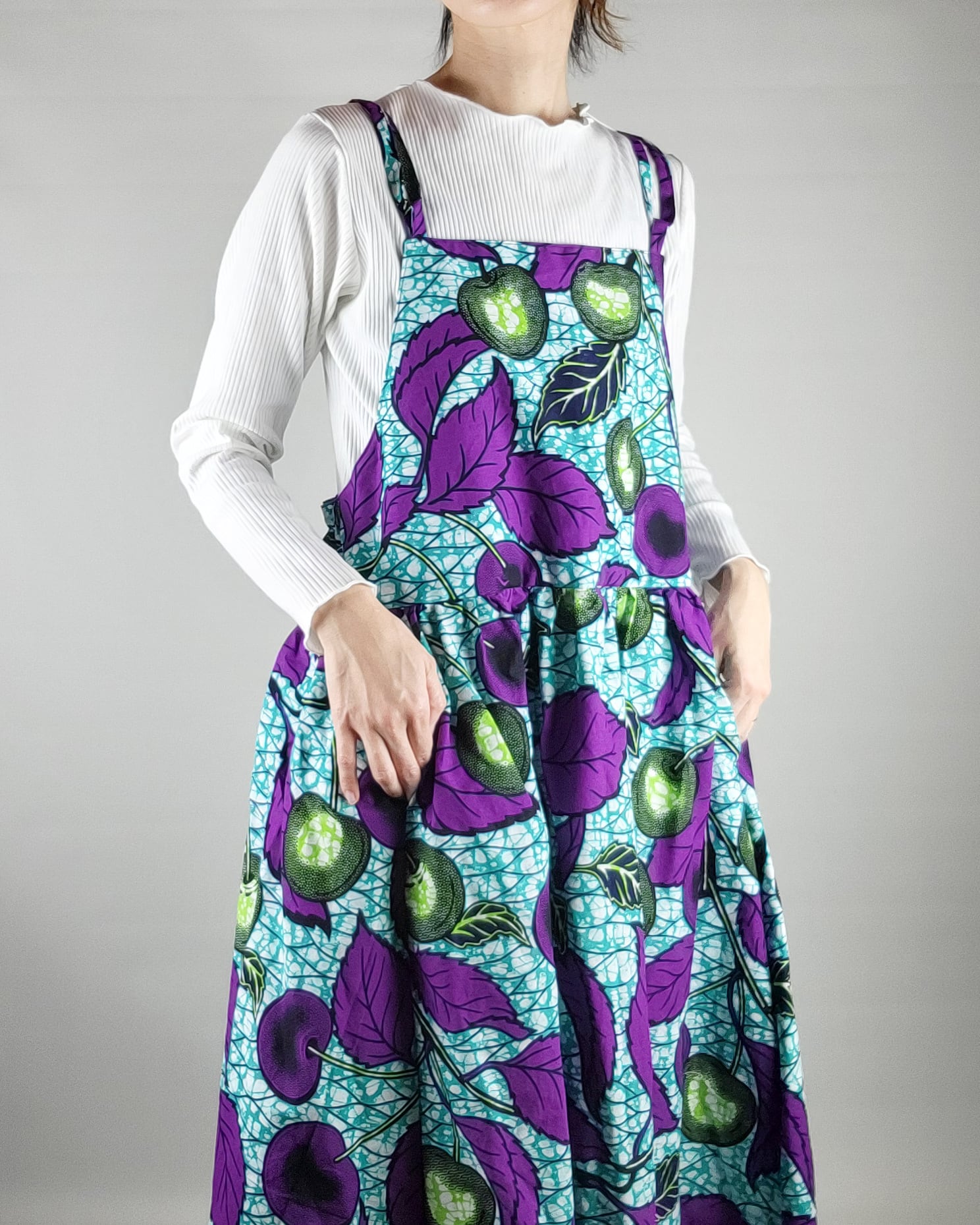 スカート部分にたっぷりとギャザーを使ったサロペットスカートになります。フレアーも入れ、女性らしいシルエットに仕立てました。