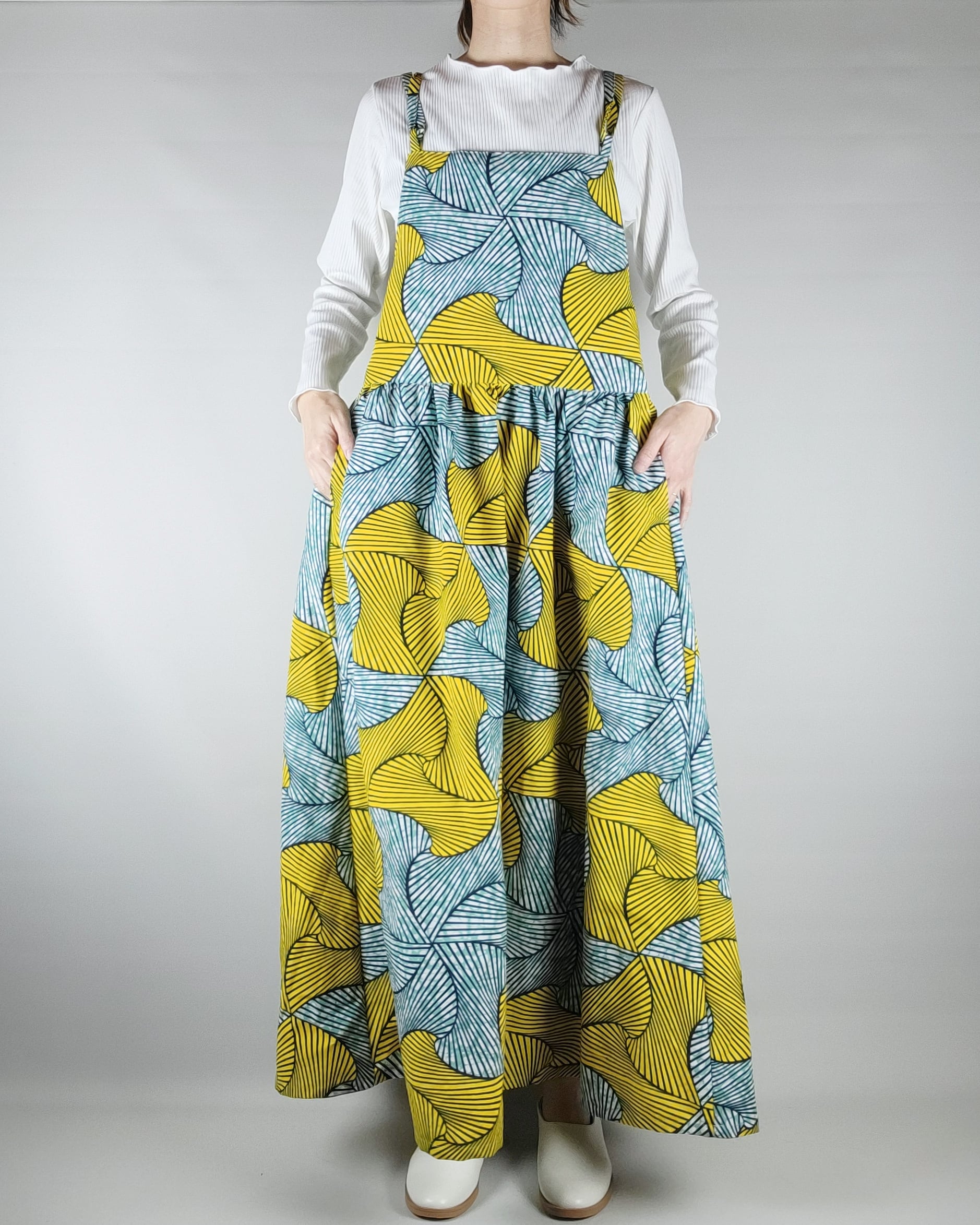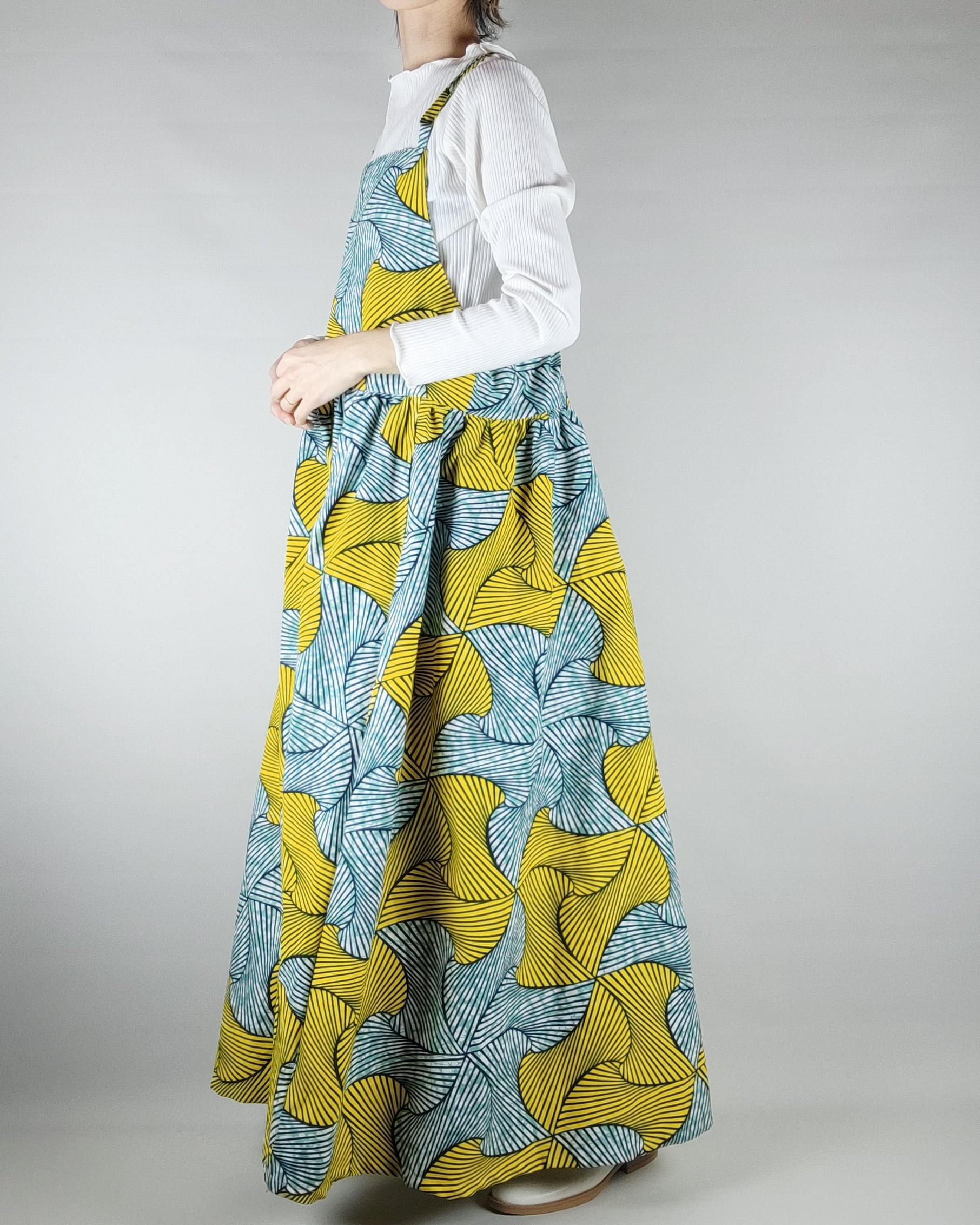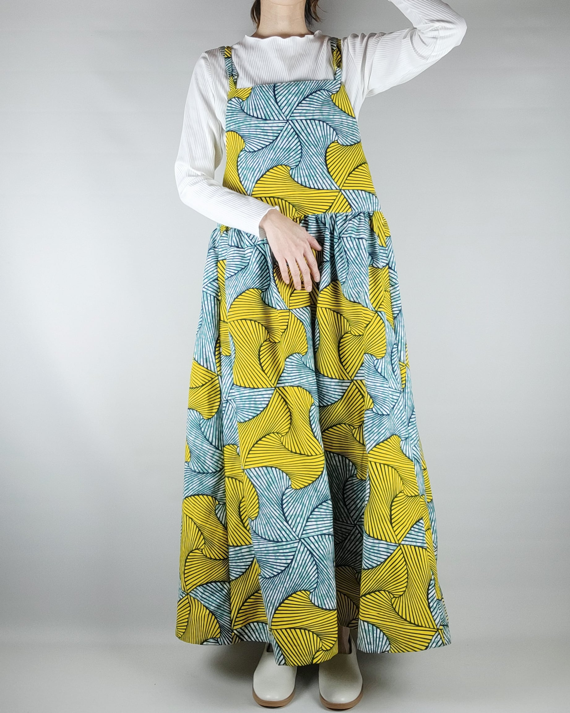 スカート部分にたっぷりとギャザーを使ったサロペットスカートになります。フレアーも入れ、女性らしいシルエットに仕立てました。