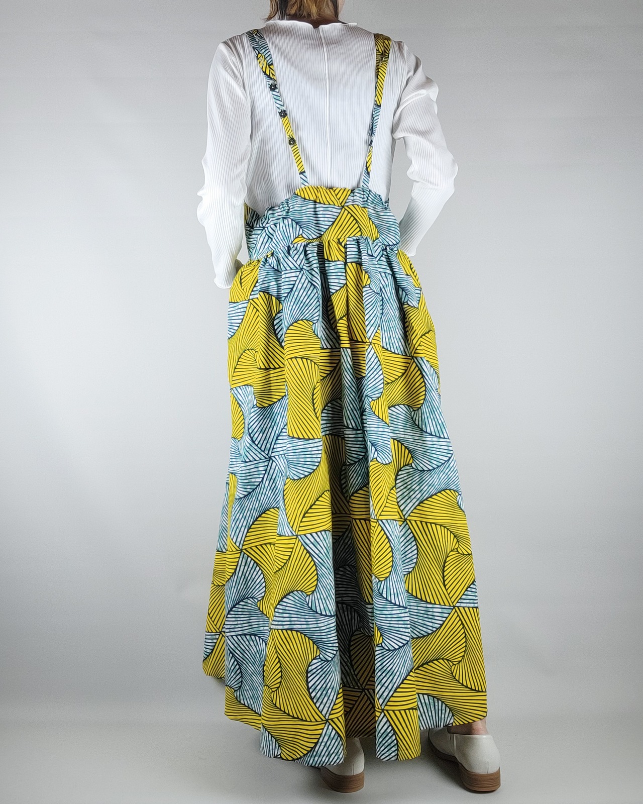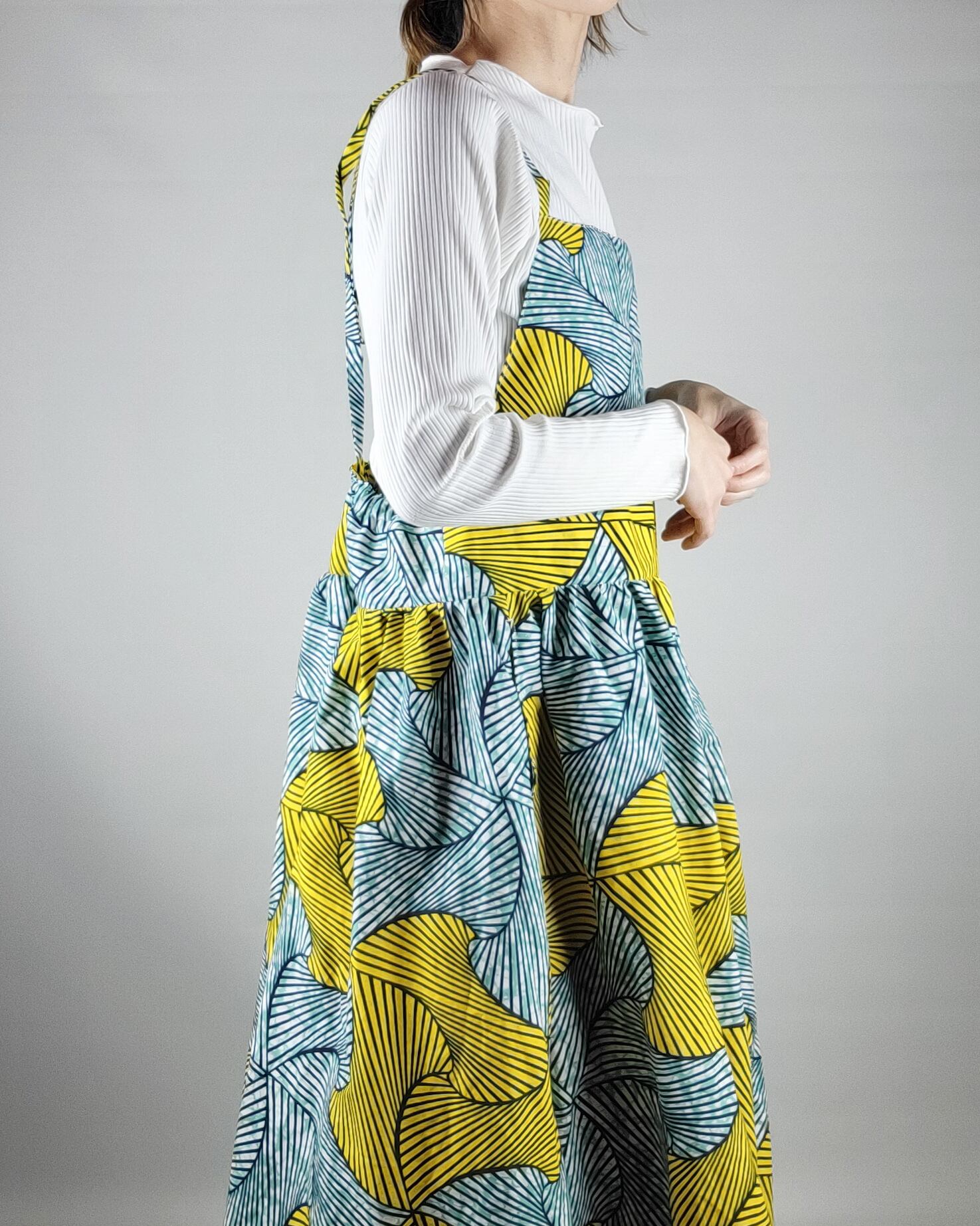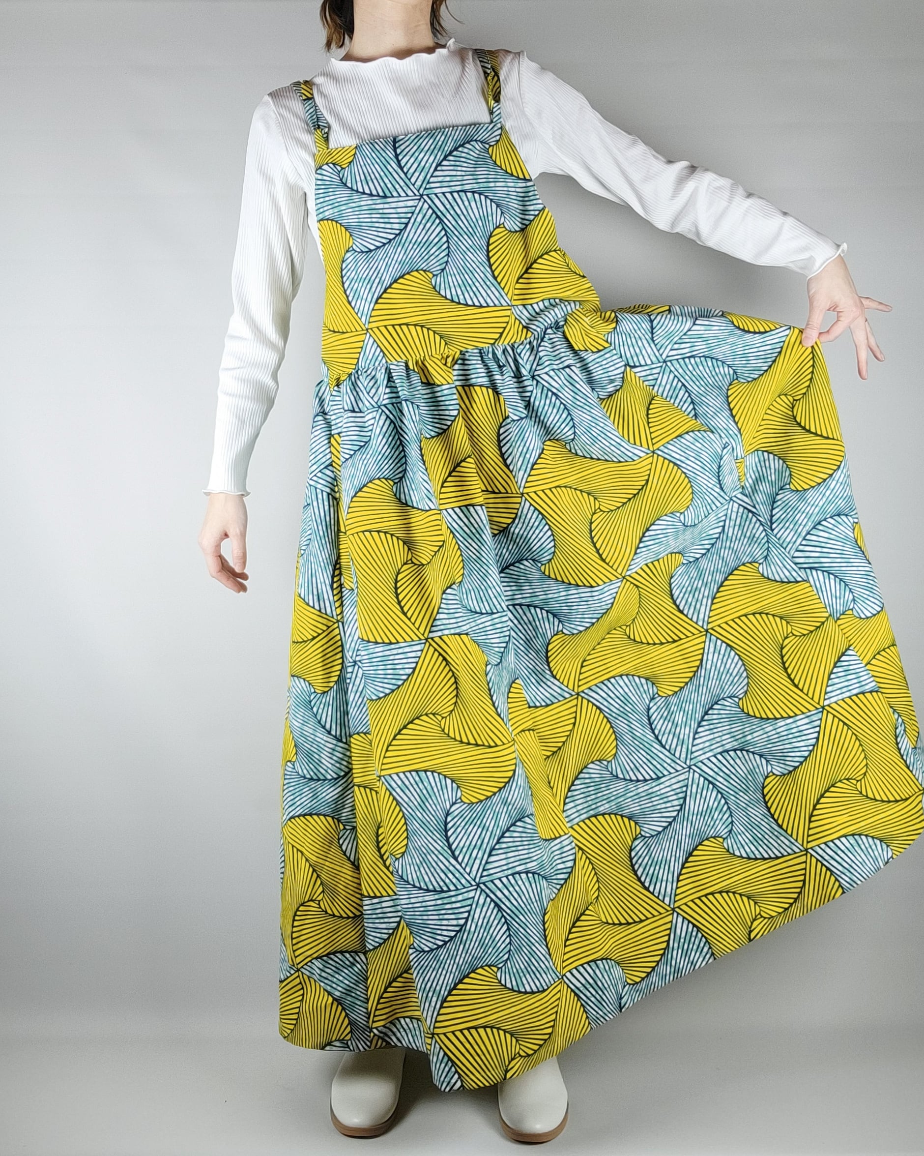 スカート部分にたっぷりとギャザーを使ったサロペットスカートになります。フレアーも入れ、女性らしいシルエットに仕立てました。