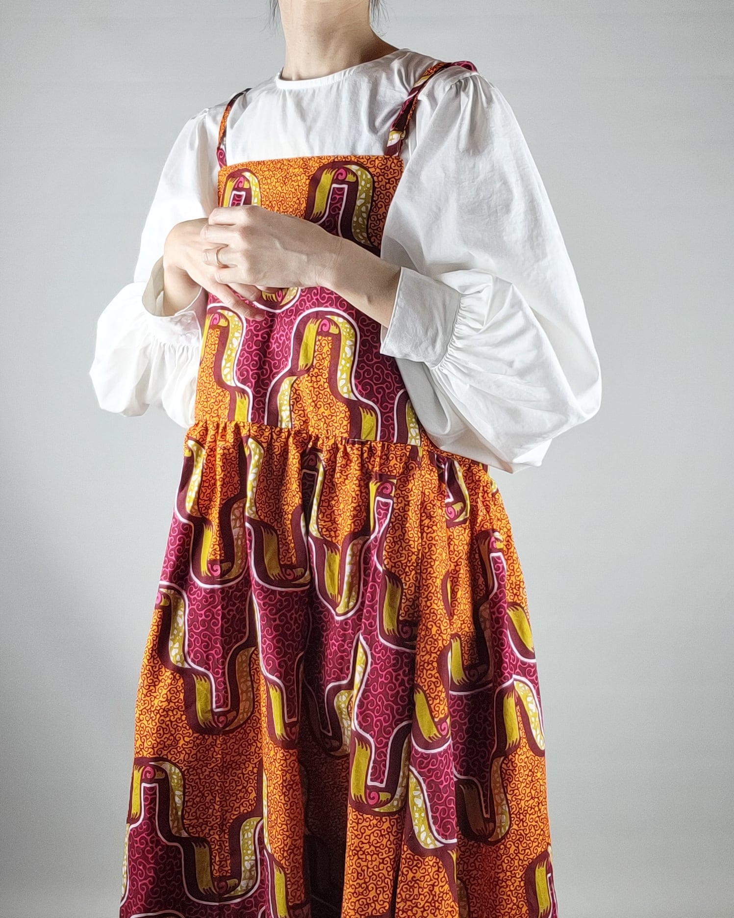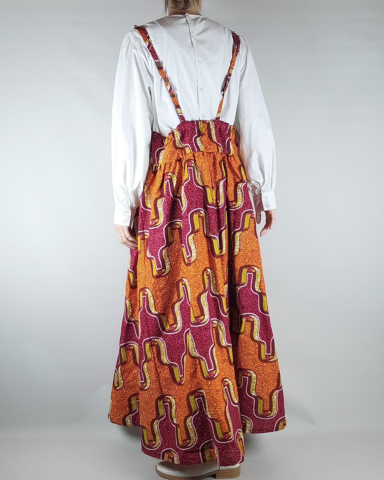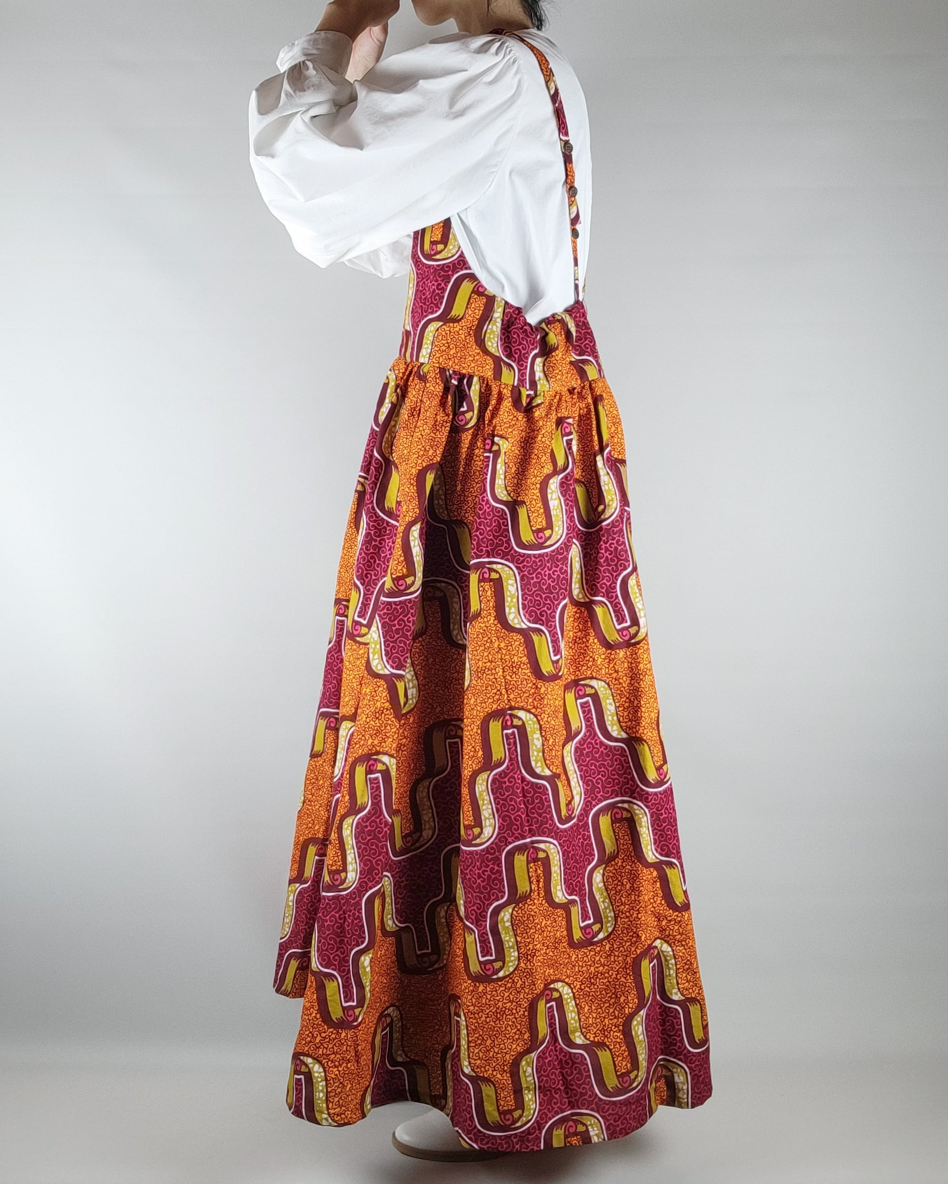 スカート部分にたっぷりとギャザーを使ったサロペットスカートになります。フレアーも入れ、女性らしいシルエットに仕立てました。