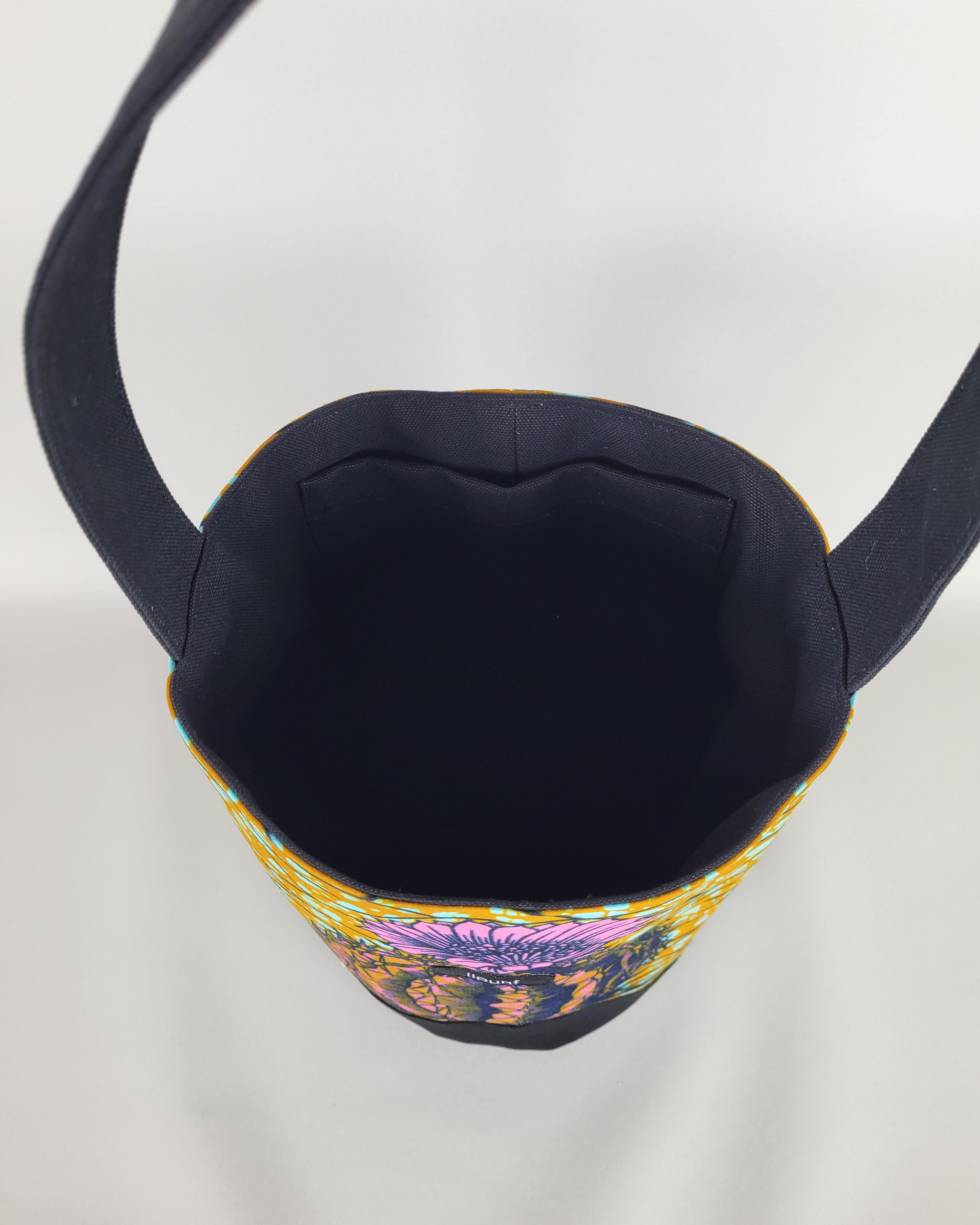 一枚でもバッグとして使用される国産の帆布と、cotton100%のアフリカ布の間に、厚手の芯地を入れる事によって、ハリのある自立式バッグに仕立てました。