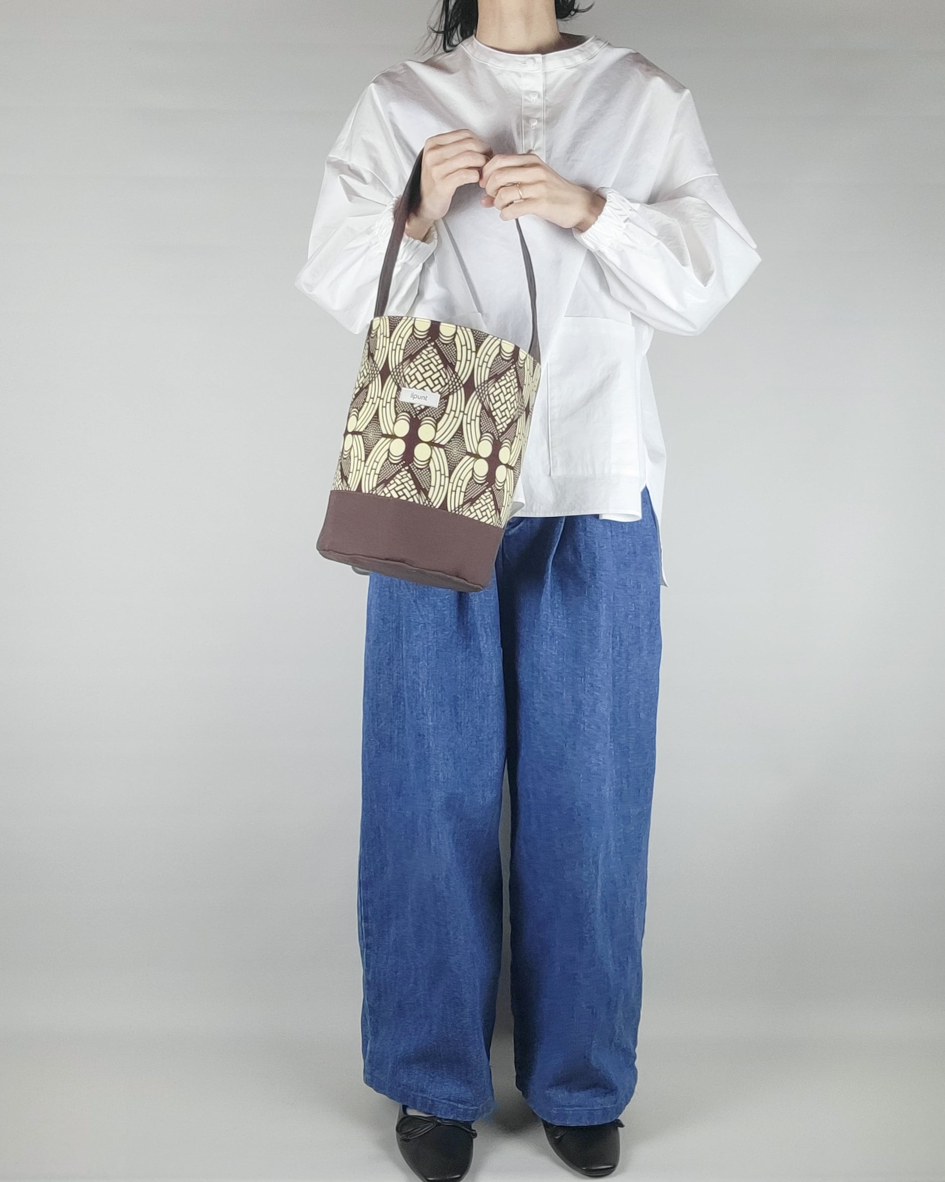 一枚でもバッグとして使用される国産の帆布と、cotton100%のアフリカ布の間に、厚手の芯地を入れる事によって、ハリのある自立式バッグに仕立てました。