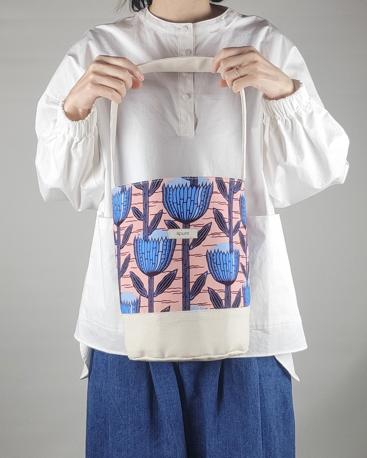 一枚でもバッグとして使用される国産の帆布と、cotton100%のアフリカ布の間に、厚手の芯地を入れる事によって、ハリのある自立式バッグに仕立てました。