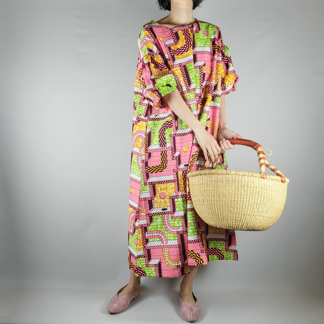 ゆったりしたシルエットのロングワンピースになります。袖山と袖口にギャザーをよせてあり、ボリュームが出すぎないバルーン袖です。