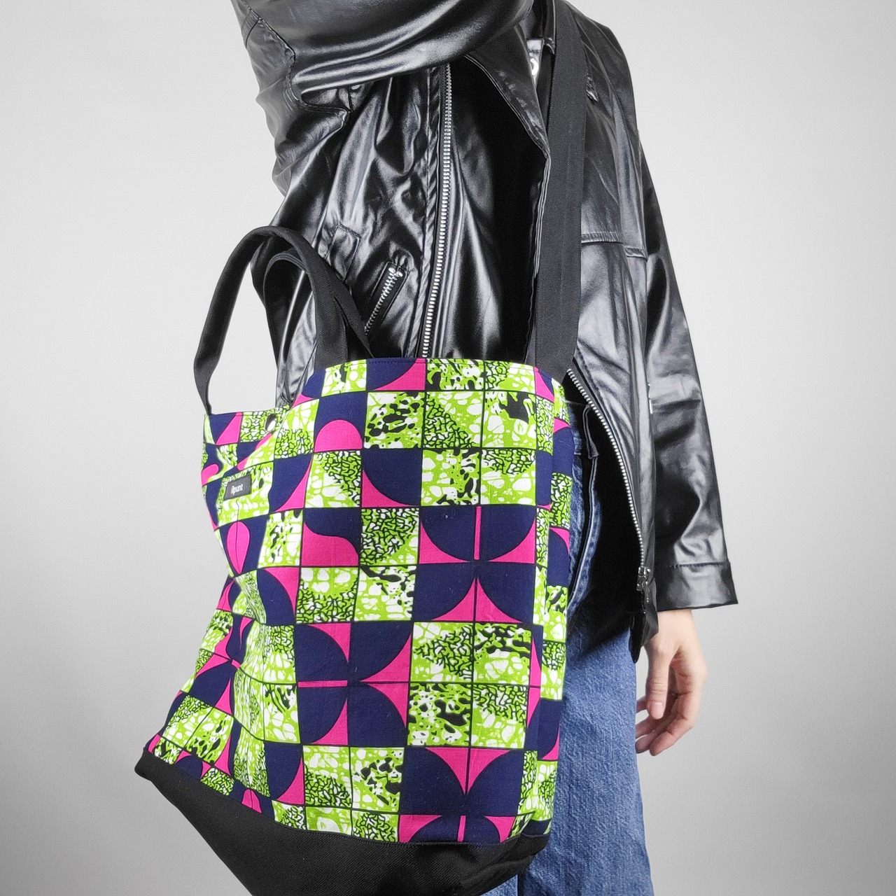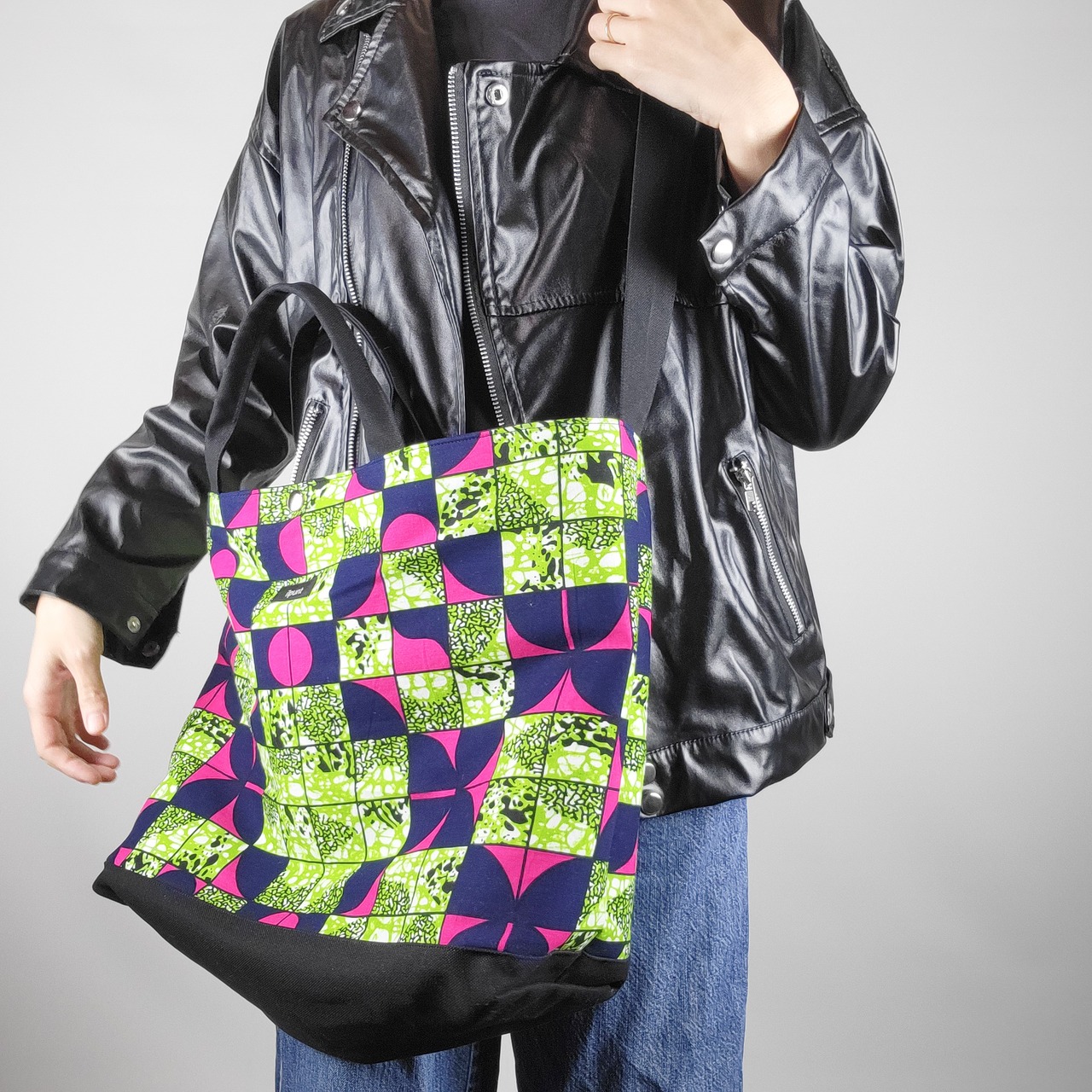 一枚でもバッグとして使用される厚手の国産8号帆布とcotton100%のアフリカ布の間に厚地の芯地を張り、安心感あるトートバッグに仕上げました。