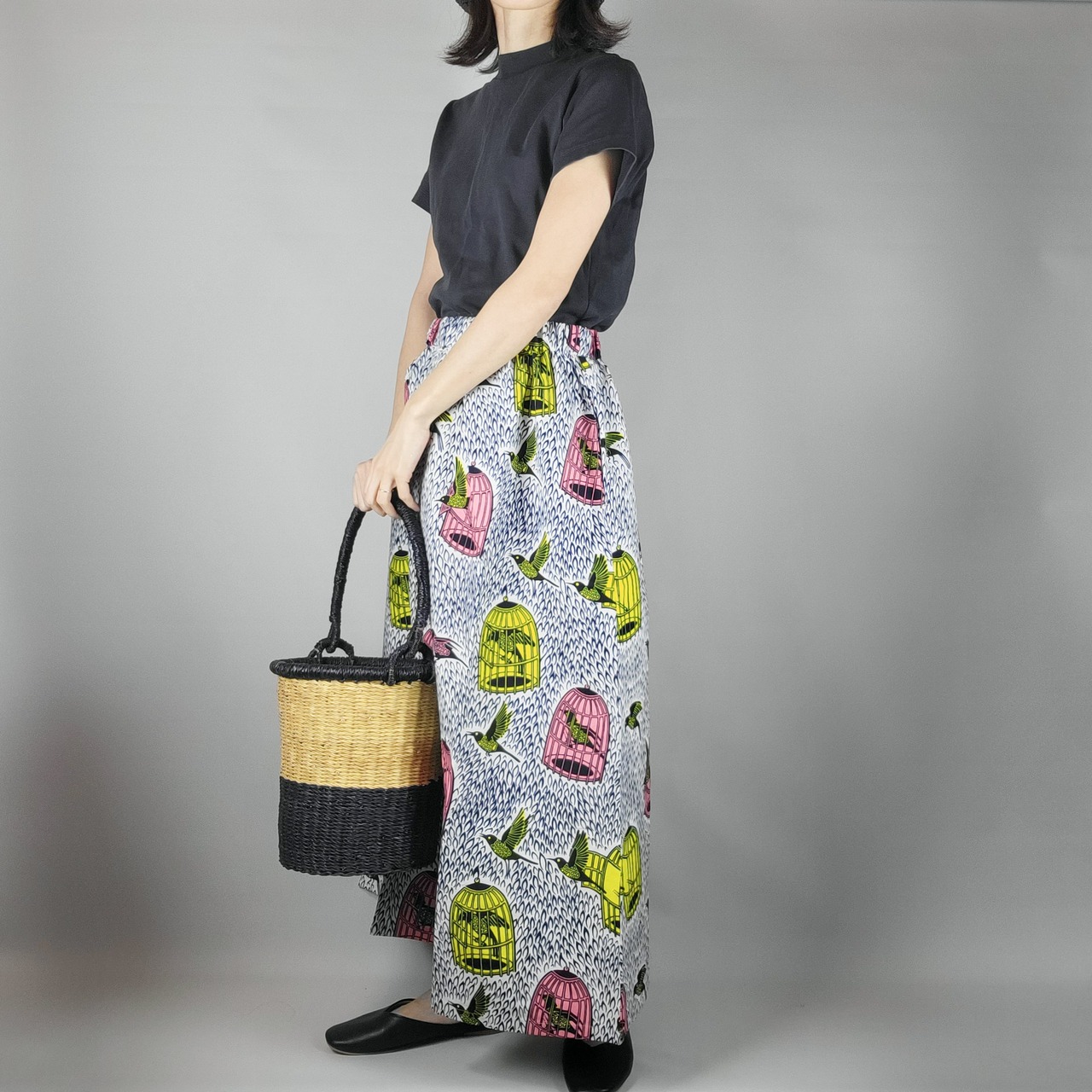 アフリカ布のギャザースカートになります。ギャザースカートですがボリュームを控え、コーディネートしやすいシルエットにしました。