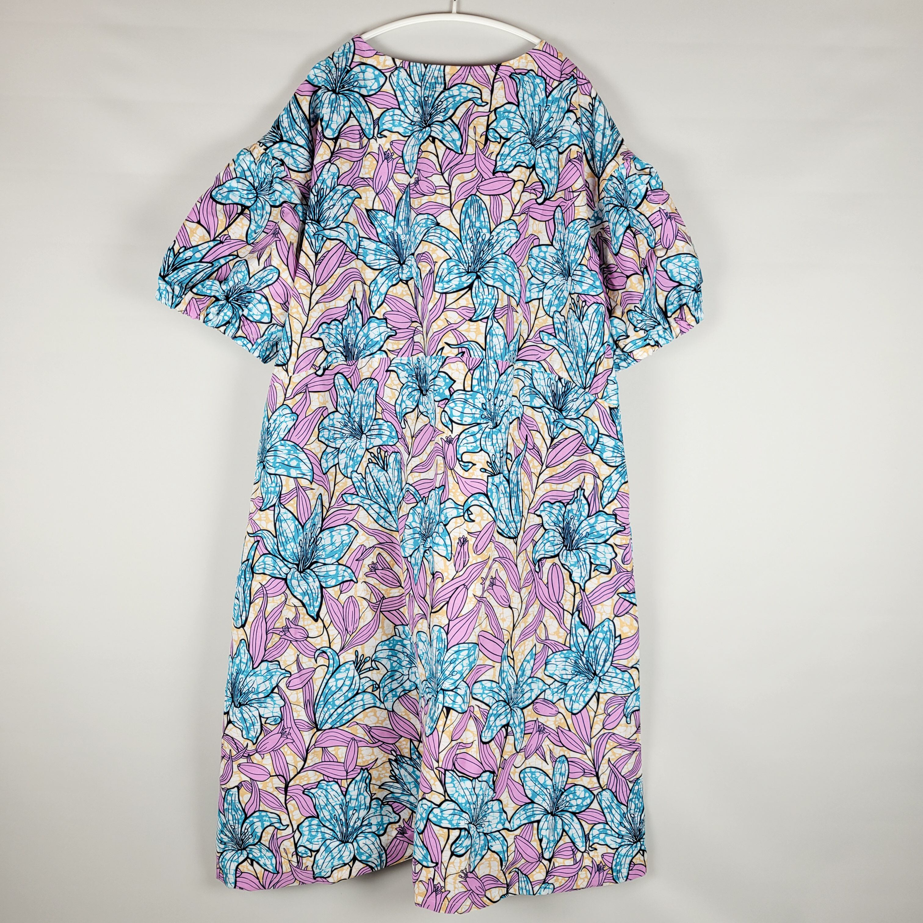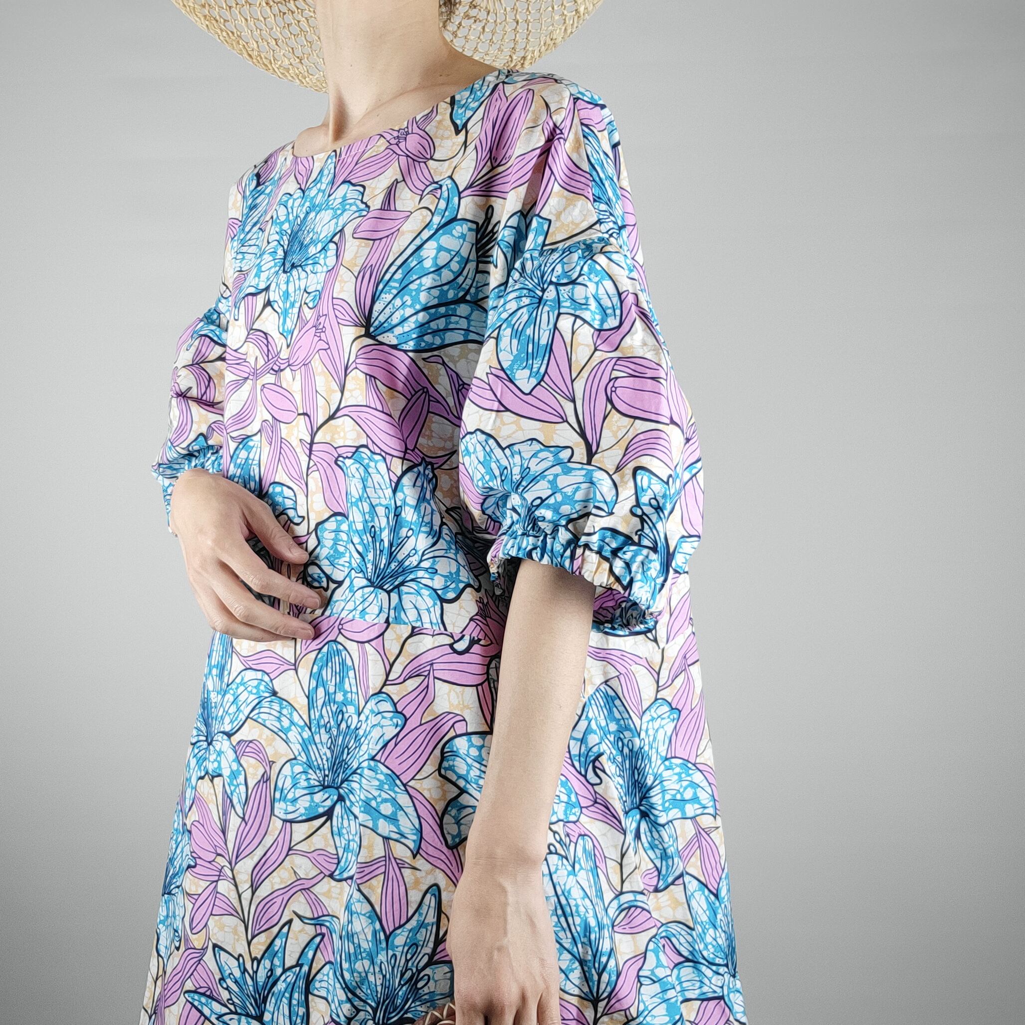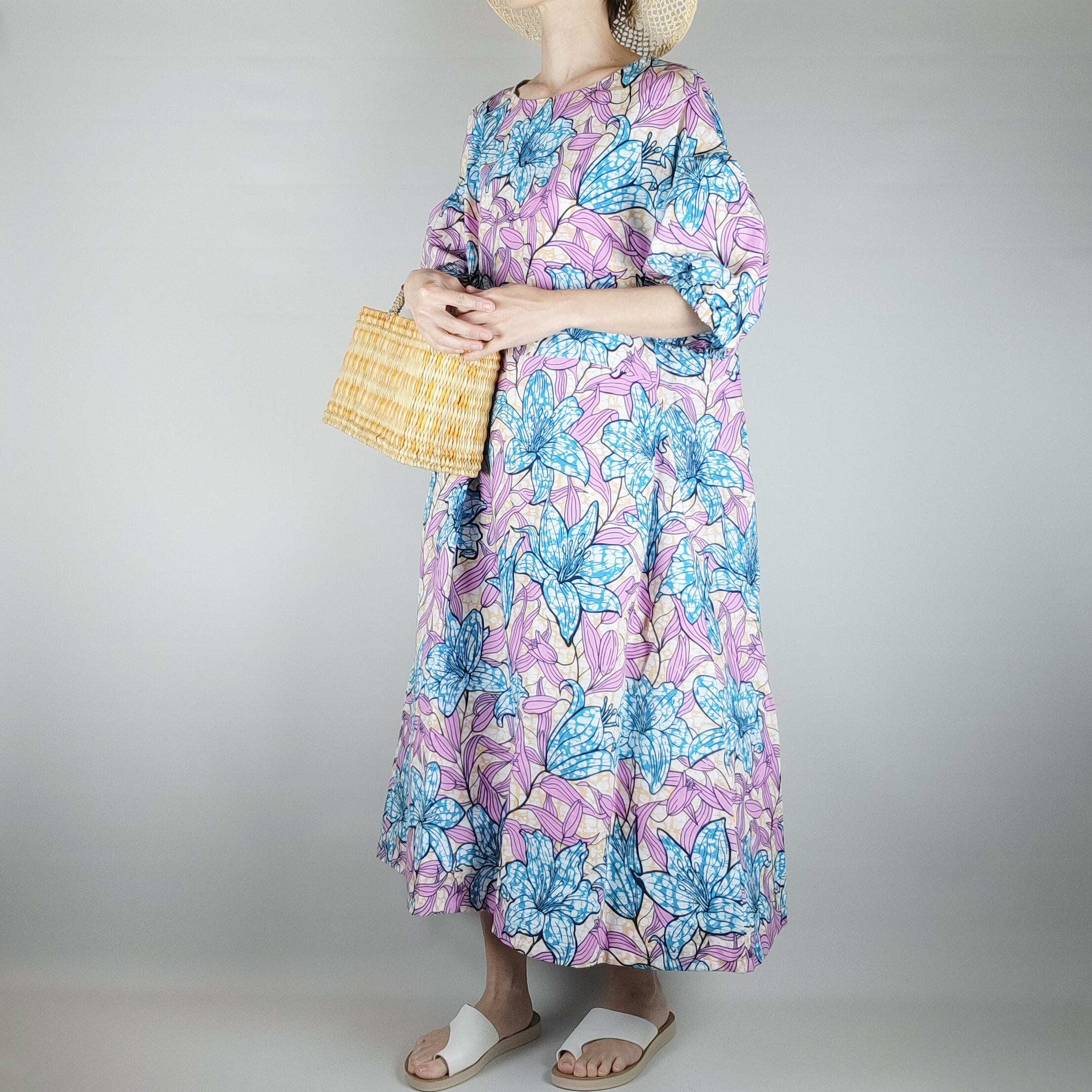 ゆったりしたシルエットのロングワンピースになります。袖山と袖口にギャザーをよせてあり、ボリュームが出すぎないバルーン袖です。