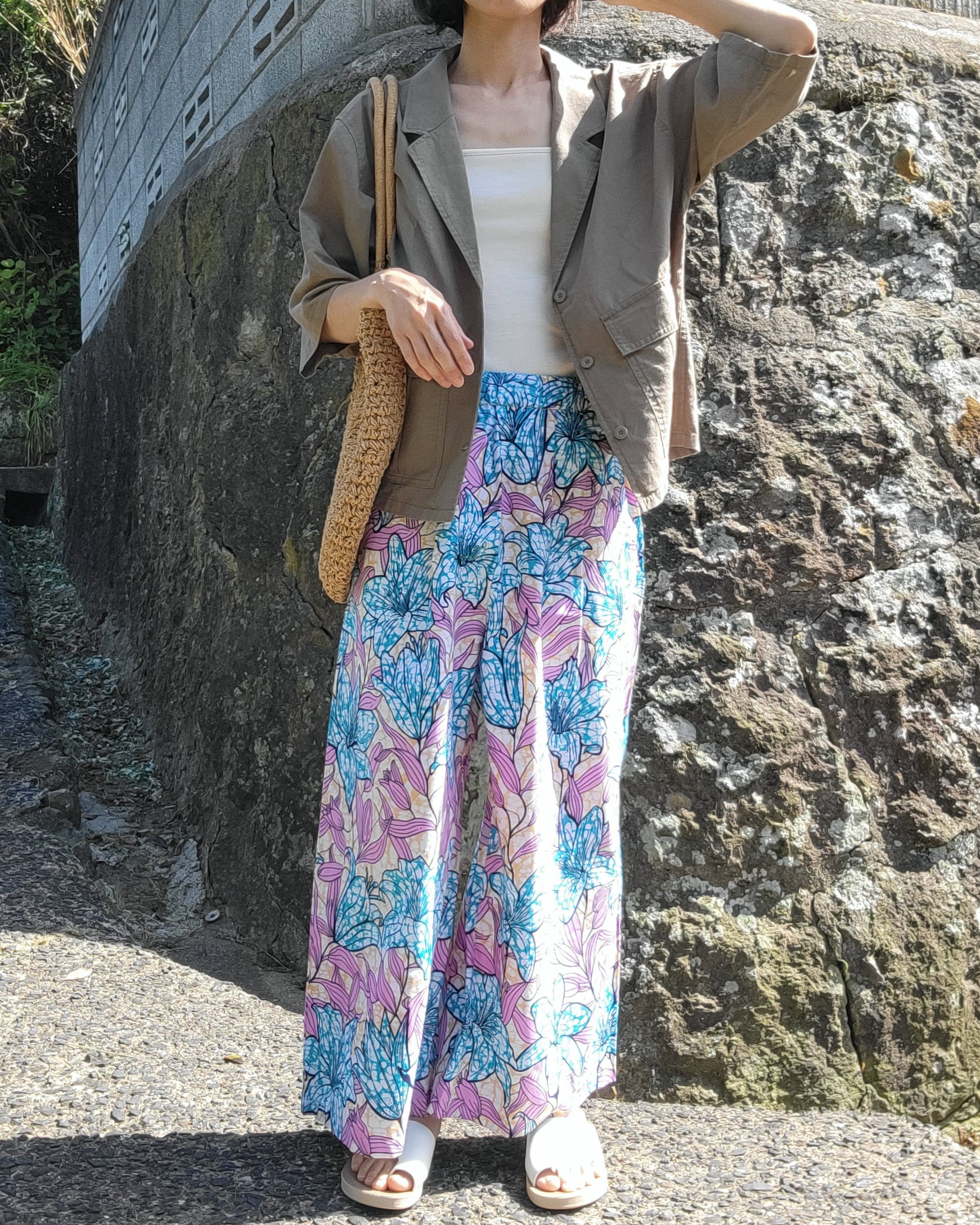 ウエストにタックを入れ、股上も深めにしたリラックス感のあるワイドパンツになっております。